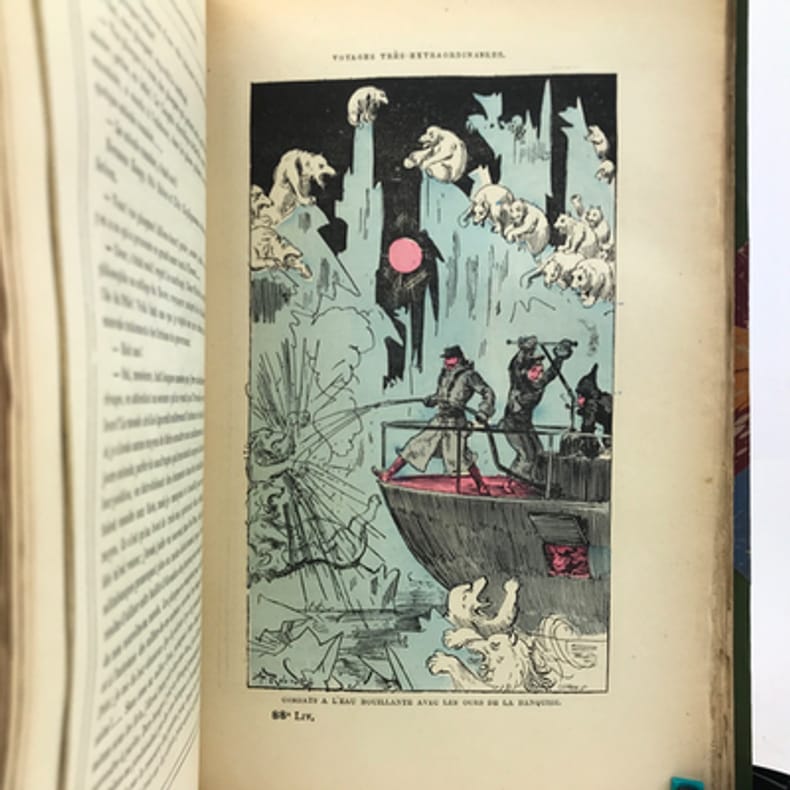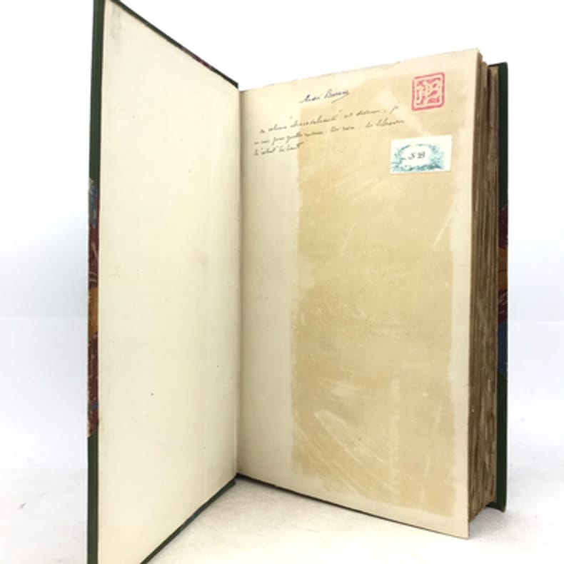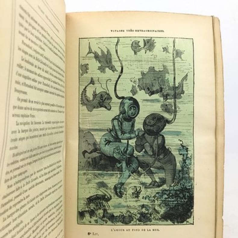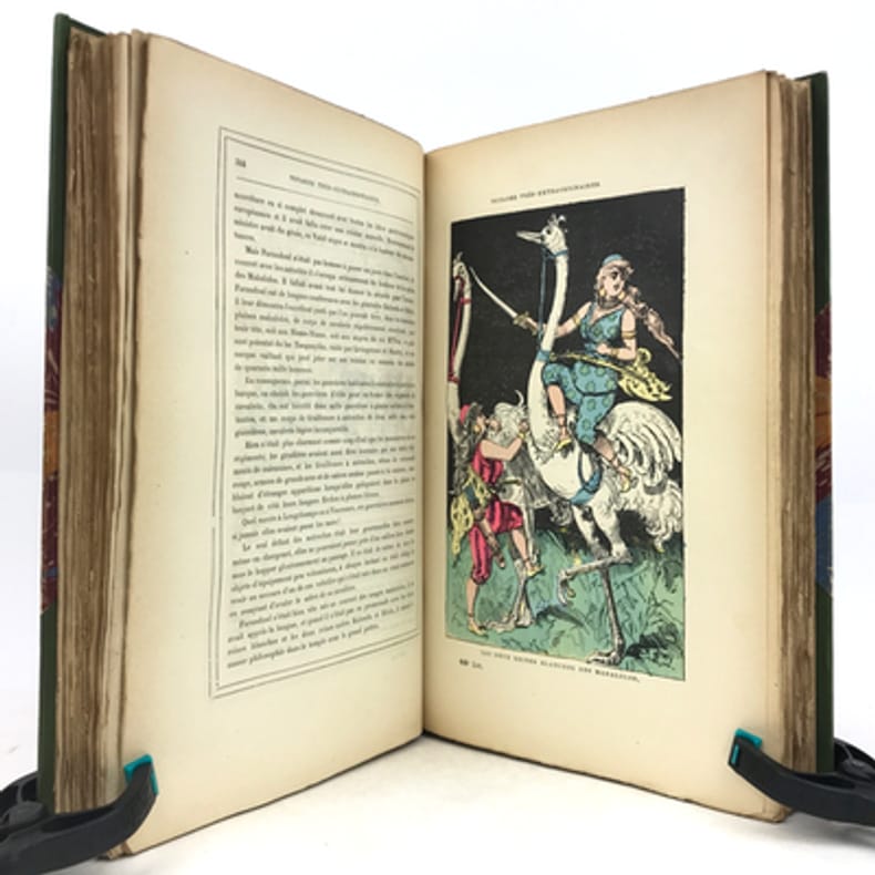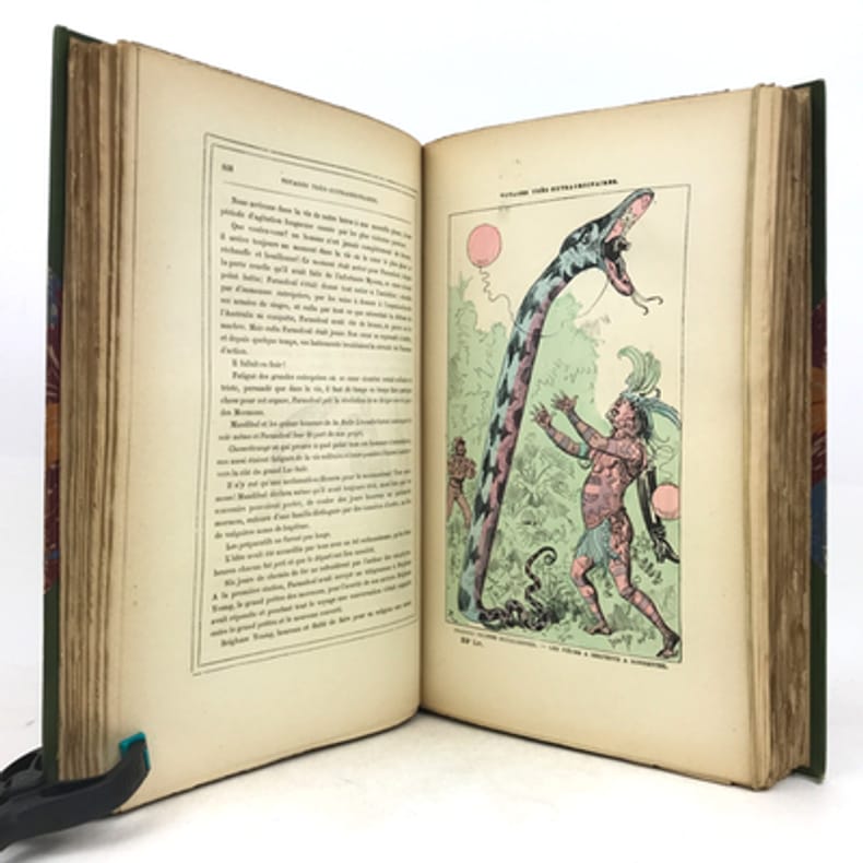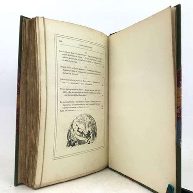 1 volume in-4 (27,8 x 18 cm), percaline verte à coins (reliure de l'époque), dos lisse à pièce de titre de maroquin rouge, [4]-808 pages (complet). Légers frottements, très rares fendillements marginaux. Bon état. Édition originale de ce roman, publiée en 101 livraisons et rassemblées ici en volume, conçu comme une parodie des Voyages extraordinaires de Jules Verne. Édition illustrée de 450 dessins d'Albert Robida dont près de 100 en couleurs, d'une belle inventivité et très amusants. Le héros Saturnin Farandoul vit des aventures invraisemblables à travers le monde entier et rencontre un grand nombre de personnages créés par Jules Verne, à l'instar du capitaine Nemo, de Philéas Fogg, de Michel Strogoff ou encore du capitaine Hatteras. Provenance : de la bibliothèque d'André Barrier, président des Cent Bibliophiles, avec son ex-libris tampon japonais, et celui d'un héritier. Très sympathique exemplaire.