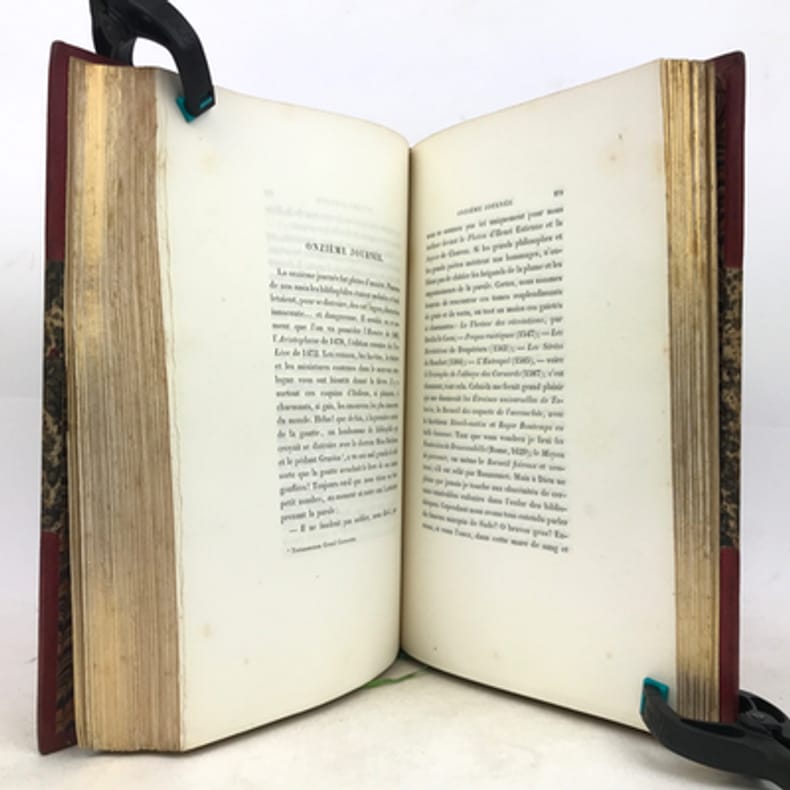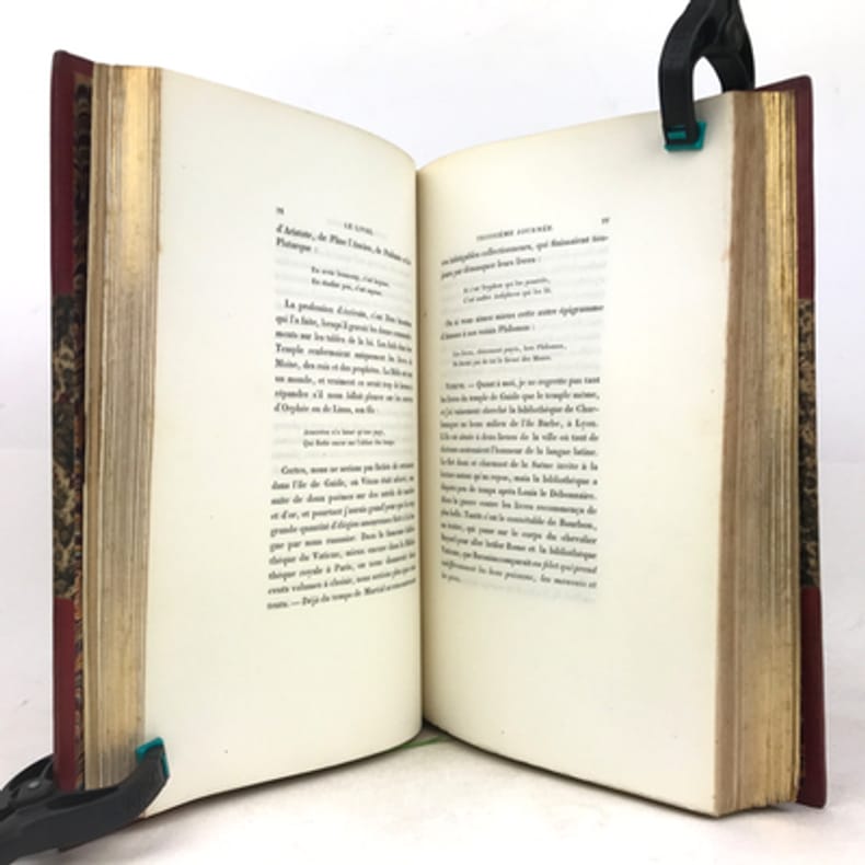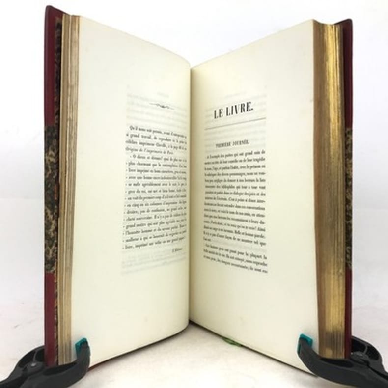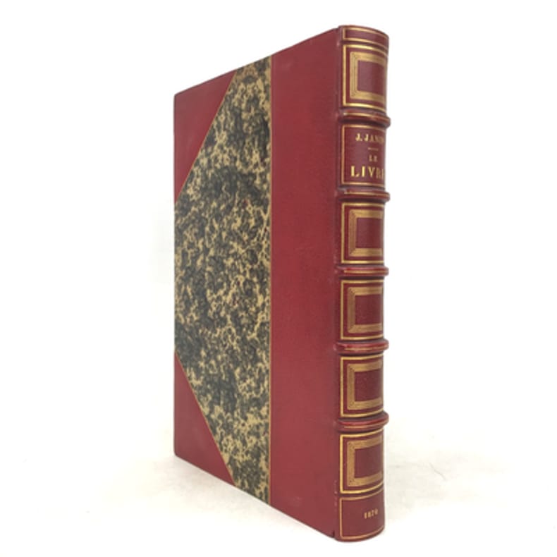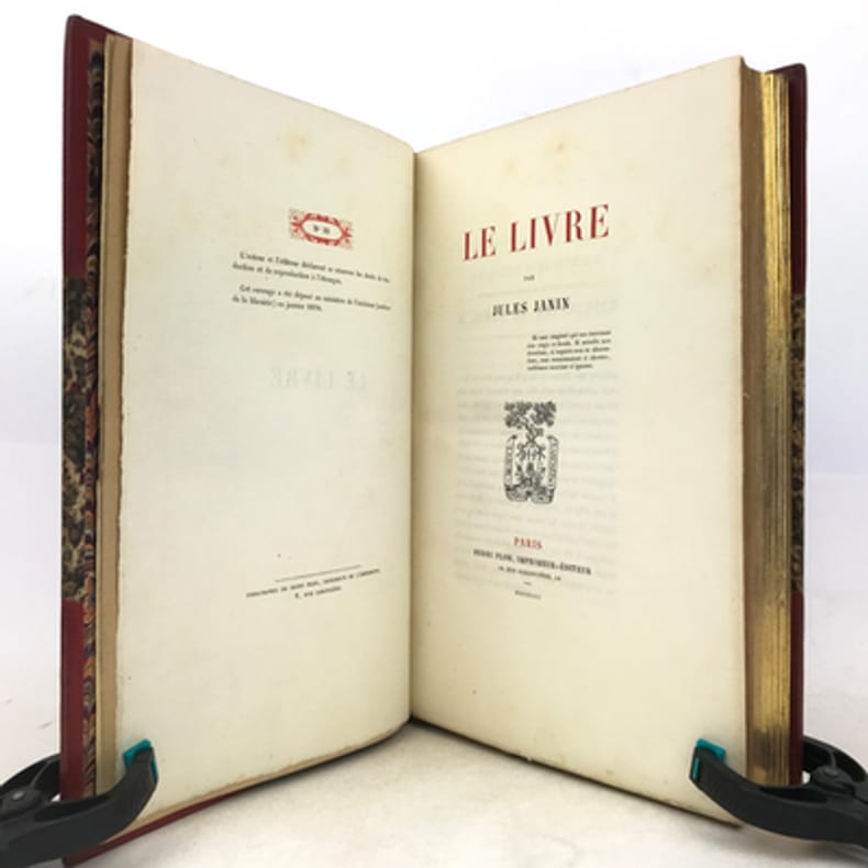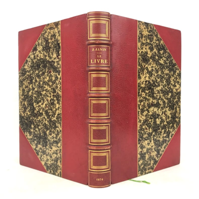 1 volume in-4 (25,5 x 17 cm), demi-maroquin rouge à coins (reliure de l'époque, trace d'une signature sur la garde supérieure ?), couverture et dos conservés, dos à nerfs orné, filet doré en bordures, tranches dorées, titre en rouge et noir, [4]-xxxi-[1]-404 pages (complet). Quelques fines taches sur le cuir, fines rousseurs éparses. État très correct tout de même. Nouvelle édition numérotée, ici l'exemplaire n°10. Jules Janin (1804-1874) est un écrivain et critique dramatique français. Il dédie cet ouvrage sur l'Histoire du livre à travers les siècles à James de Rothschild (1792-1868), banquier allemand installé à Paris, et bibliophile. L'ouvrage, à l'image du célèbre Décaméron, prend la forme de 14 journées décrites, avec chacune une période et un cadre différents : la Renaissance de François Ier, la bibliothèque du cardinal Mazarin, ou encore le siècle des Lumières. Agréable exemplaire.