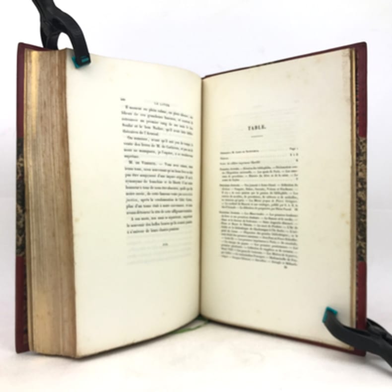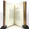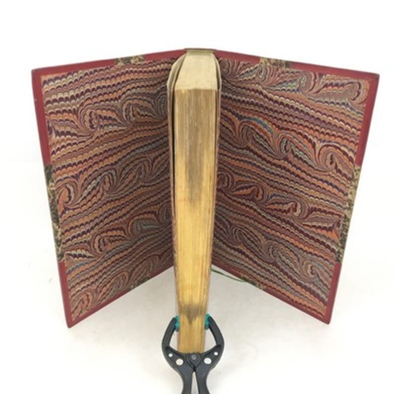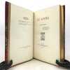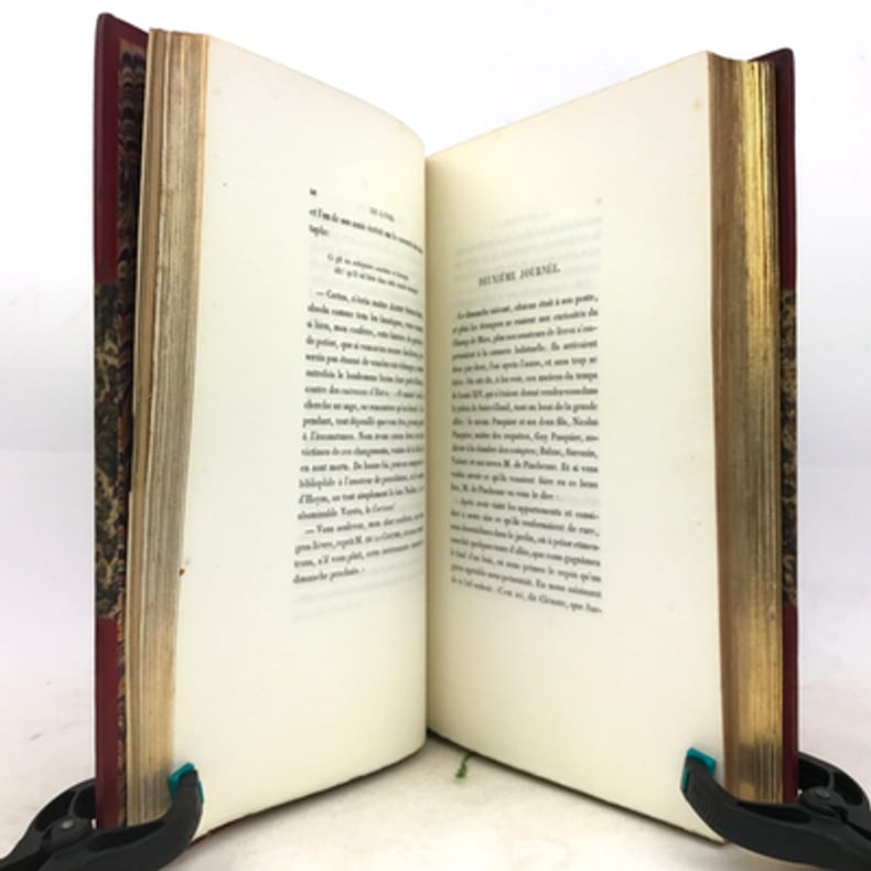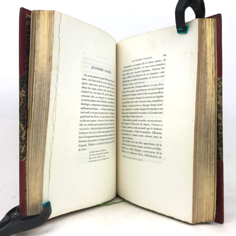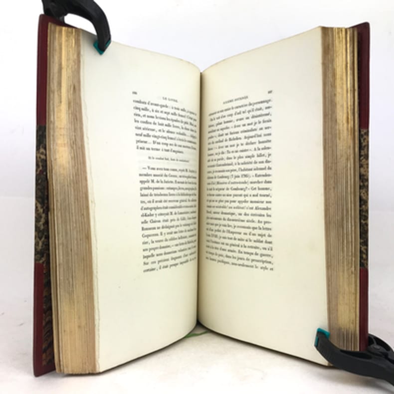 1 volume in-4 (25,5 x 17 cm), demi-maroquin rouge à coins (reliure de l'époque, trace d'une signature sur la garde supérieure ?), couverture et dos conservés, dos à nerfs orné, filet doré en bordures, tranches dorées, titre en rouge et noir, [4]-xxxi-[1]-404 pages (complet). Quelques fines taches sur le cuir, fines rousseurs éparses. État très correct tout de même. Nouvelle édition numérotée, ici l'exemplaire n°10. Jules Janin (1804-1874) est un écrivain et critique dramatique français. Il dédie cet ouvrage sur l'Histoire du livre à travers les siècles à James de Rothschild (1792-1868), banquier allemand installé à Paris, et bibliophile. L'ouvrage, à l'image du célèbre Décaméron, prend la forme de 14 journées décrites, avec chacune une période et un cadre différents : la Renaissance de François Ier, la bibliothèque du cardinal Mazarin, ou encore le siècle des Lumières. Agréable exemplaire.