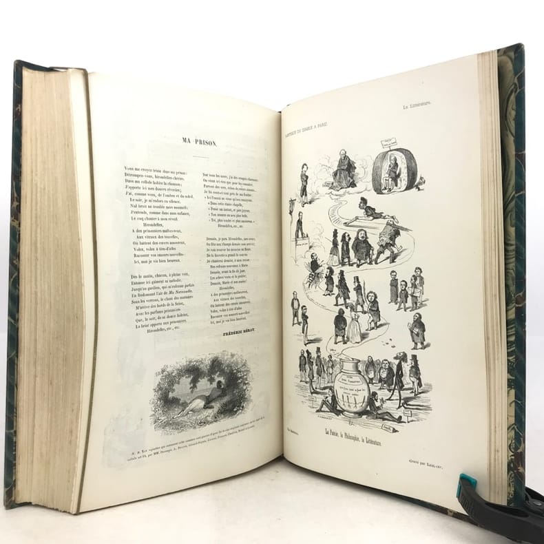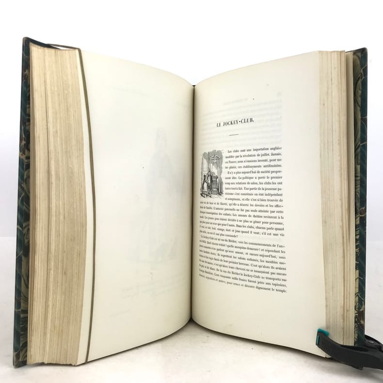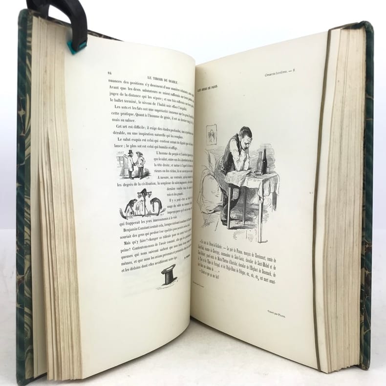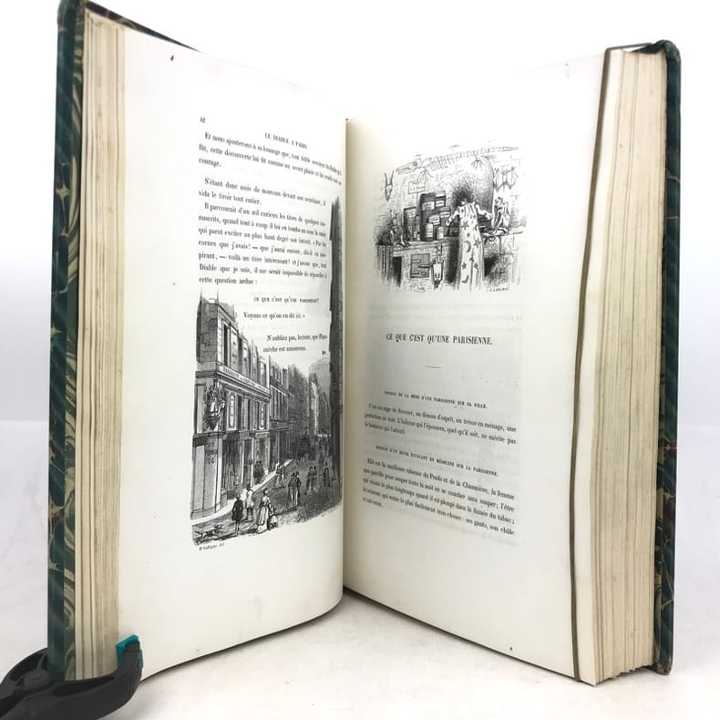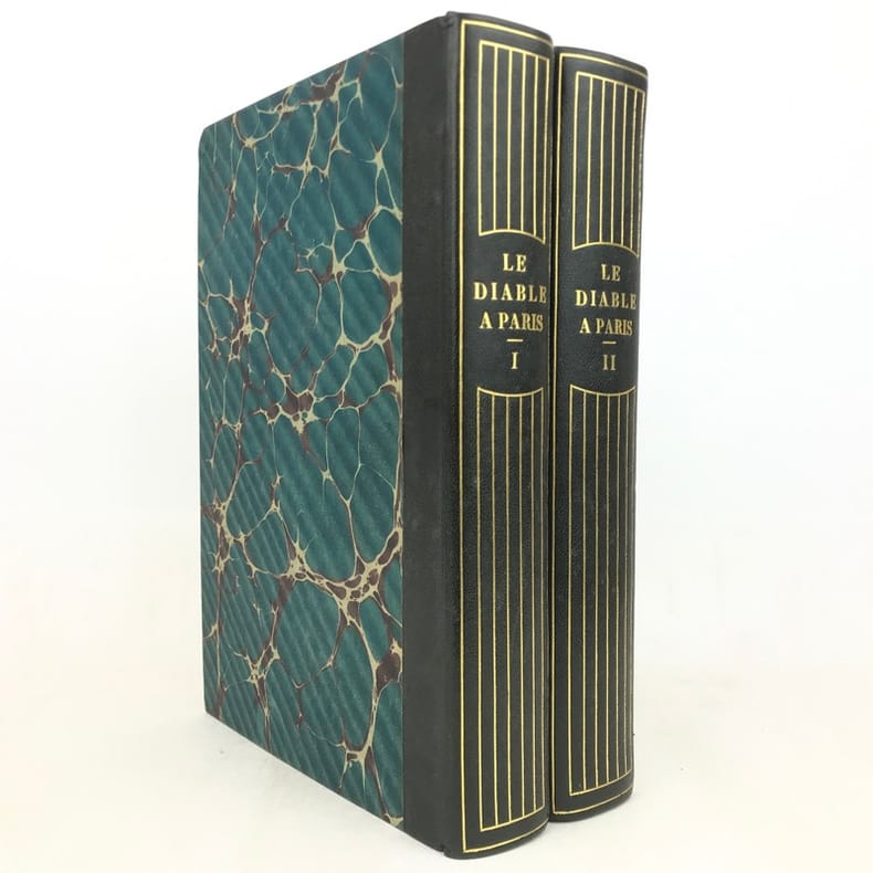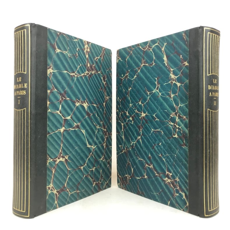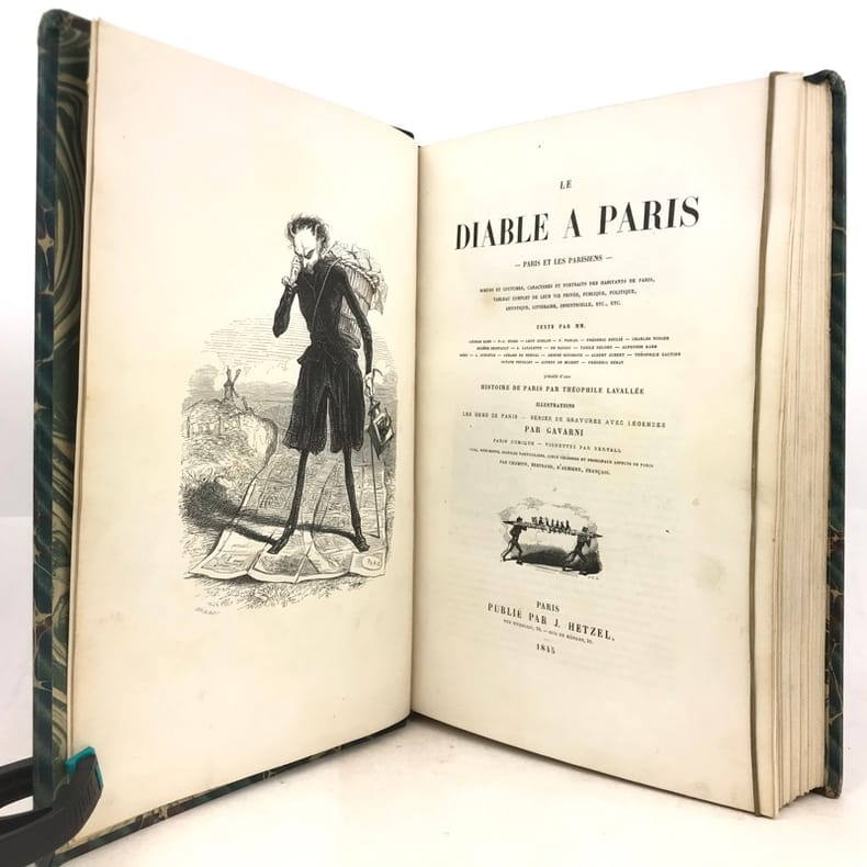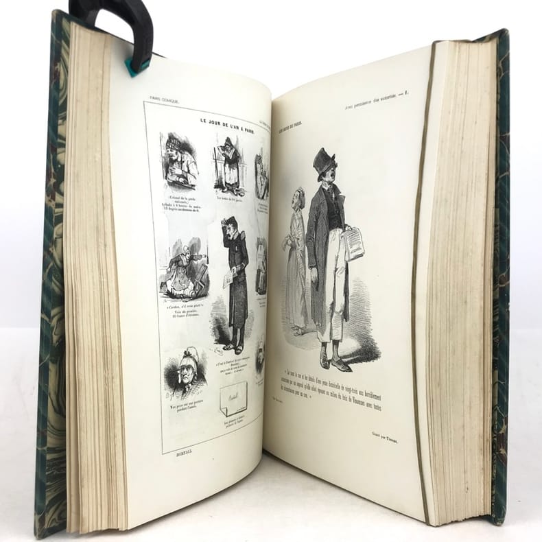 2 volumes grand in-8 (26,5 x 18 cm), demi-chagrin ébène (reliure de l’époque), dos lisses ornés en long, [4]-xxxii-380-100pl. ; [4]-lxxx-364-112pl. pages (complet du texte). Manque le plan de Paris. Bon état. Premier tirage de l'un des plus célèbres illustrés romantiques. Textes par Balzac, Sand, Nodier, Musset, Nerval, etc., illustrés de 212 gravures sur bois, hors texte, dont 208 de Gavarni et 4 de Bertall, et de très nombreuses gravures in texte. Plaisant exemplaire.