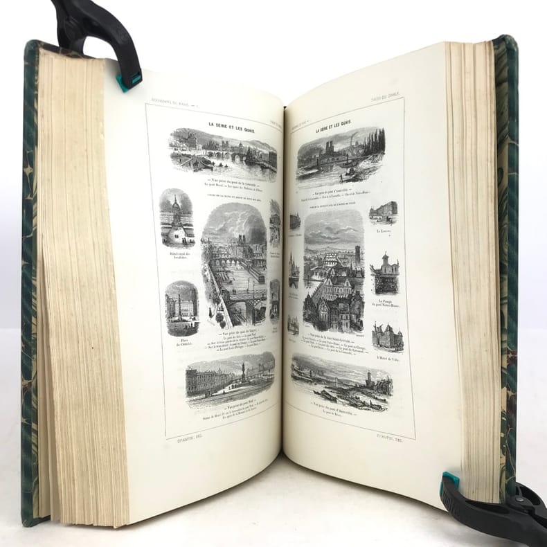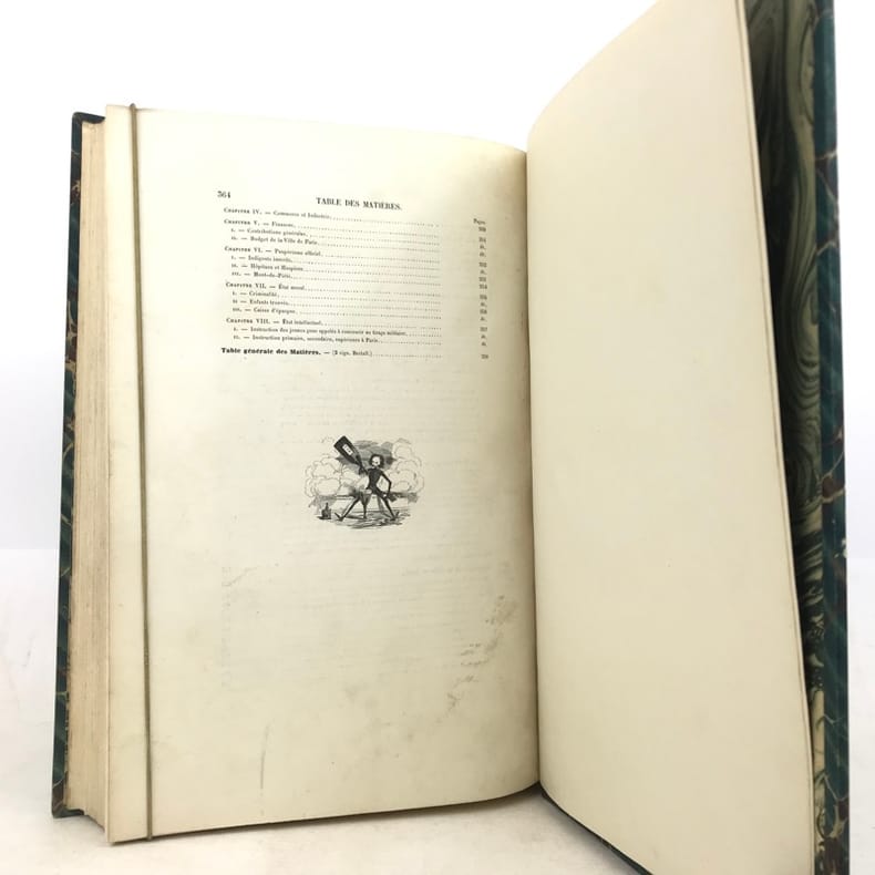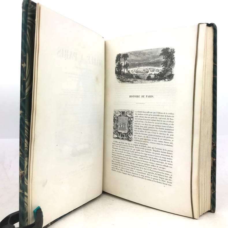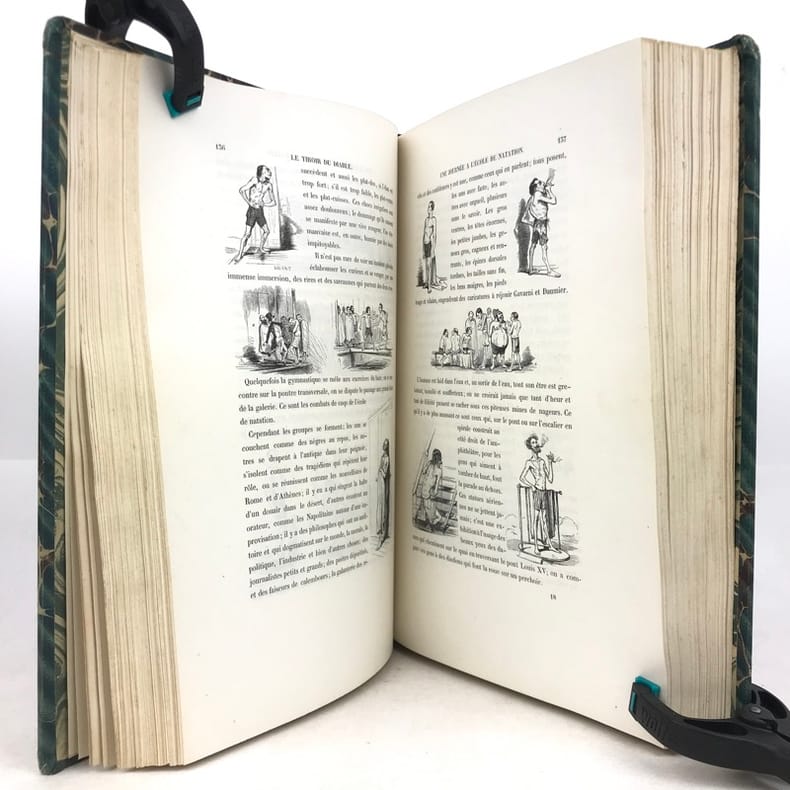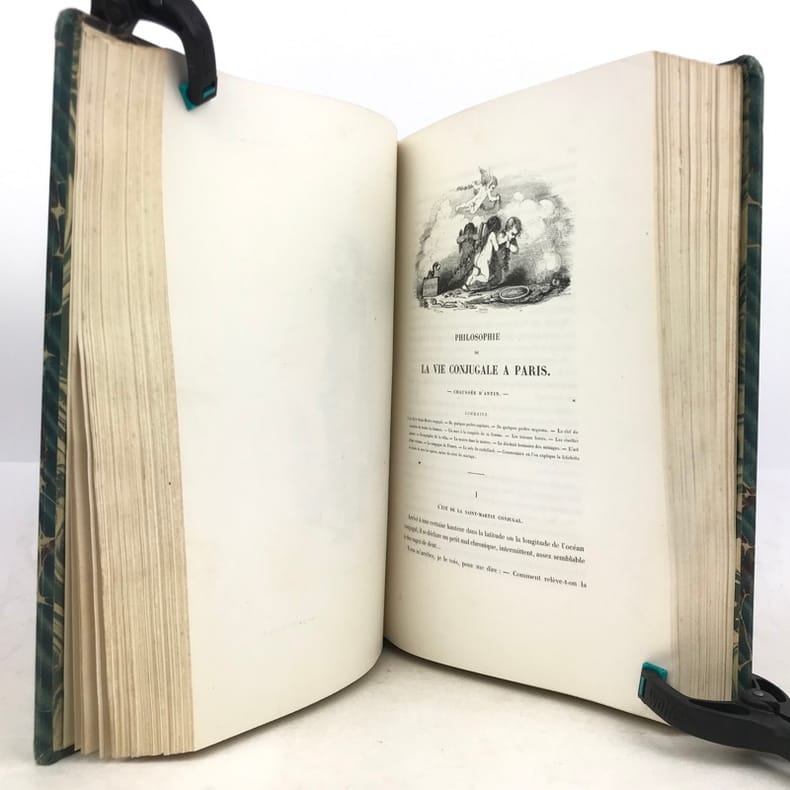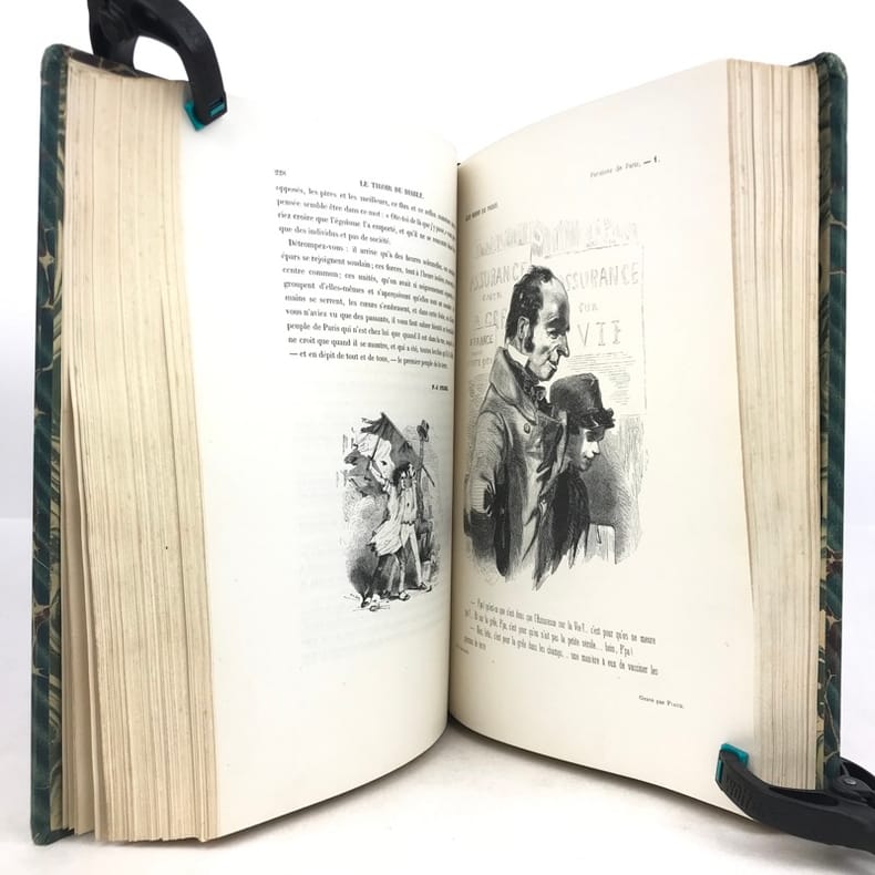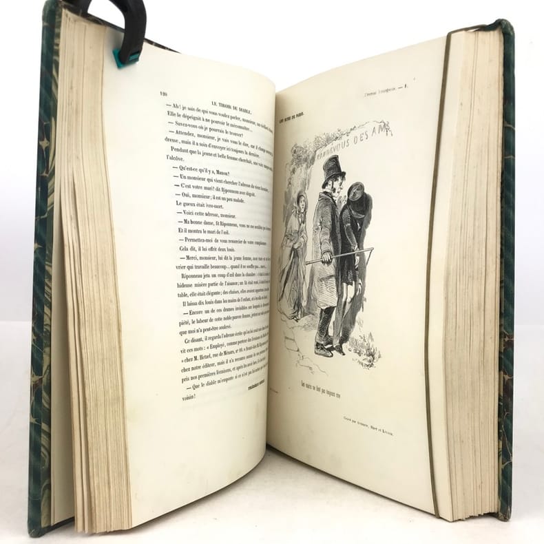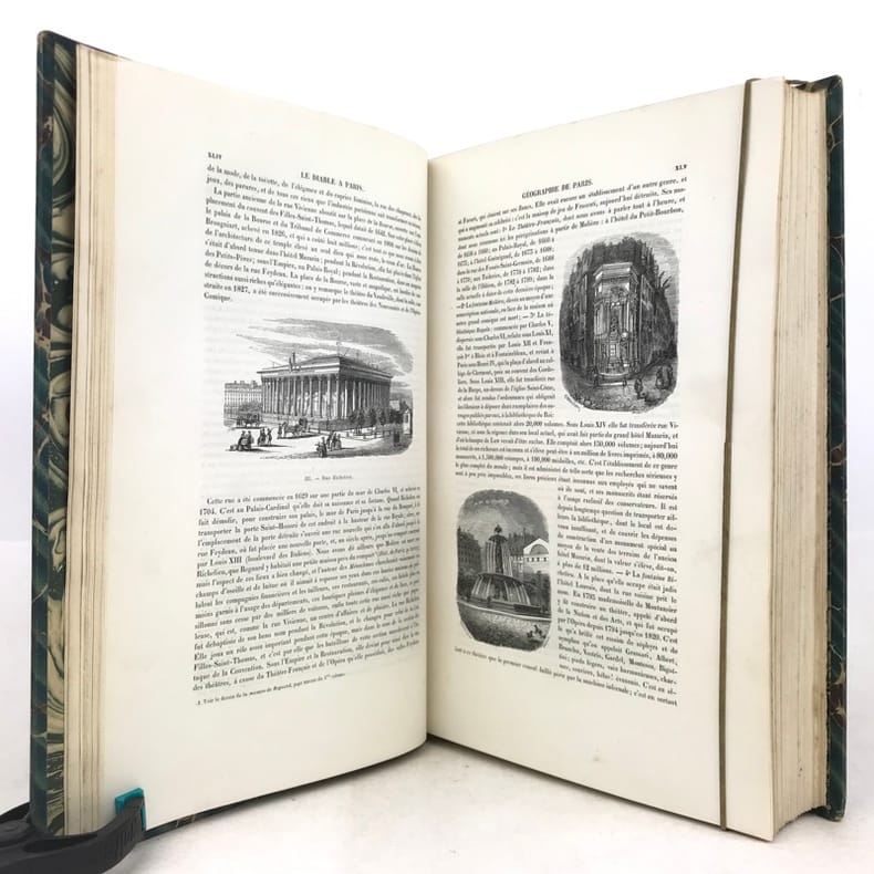 2 volumes grand in-8 (26,5 x 18 cm), demi-chagrin ébène (reliure de l’époque), dos lisses ornés en long, [4]-xxxii-380-100pl. ; [4]-lxxx-364-112pl. pages (complet du texte). Manque le plan de Paris. Bon état. Premier tirage de l'un des plus célèbres illustrés romantiques. Textes par Balzac, Sand, Nodier, Musset, Nerval, etc., illustrés de 212 gravures sur bois, hors texte, dont 208 de Gavarni et 4 de Bertall, et de très nombreuses gravures in texte. Plaisant exemplaire.
