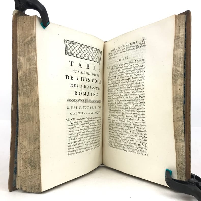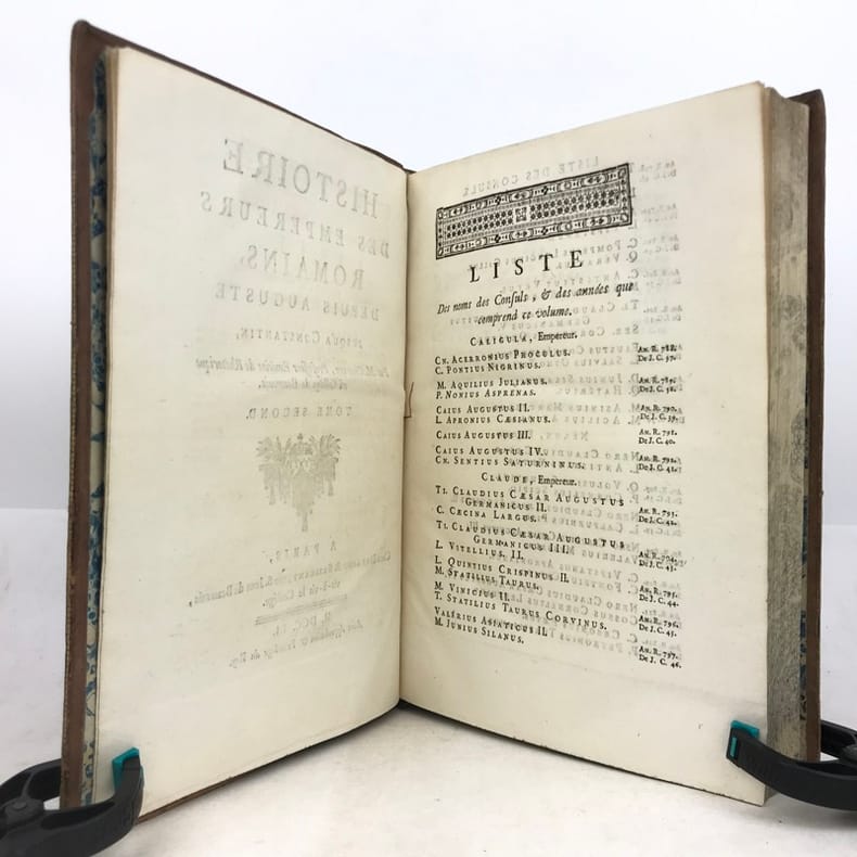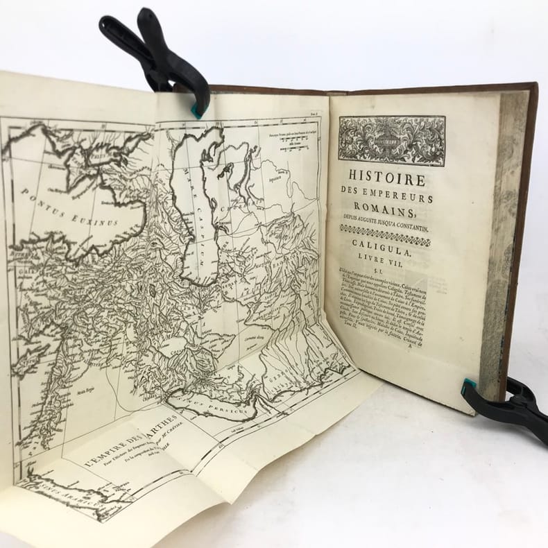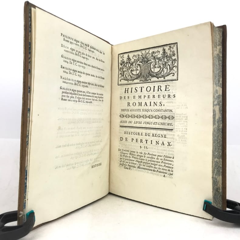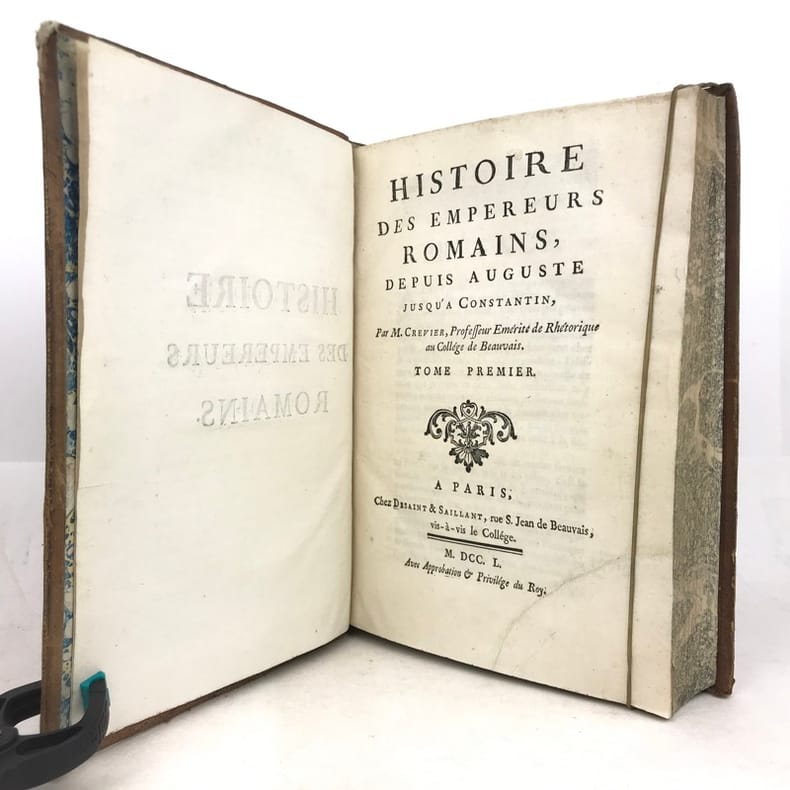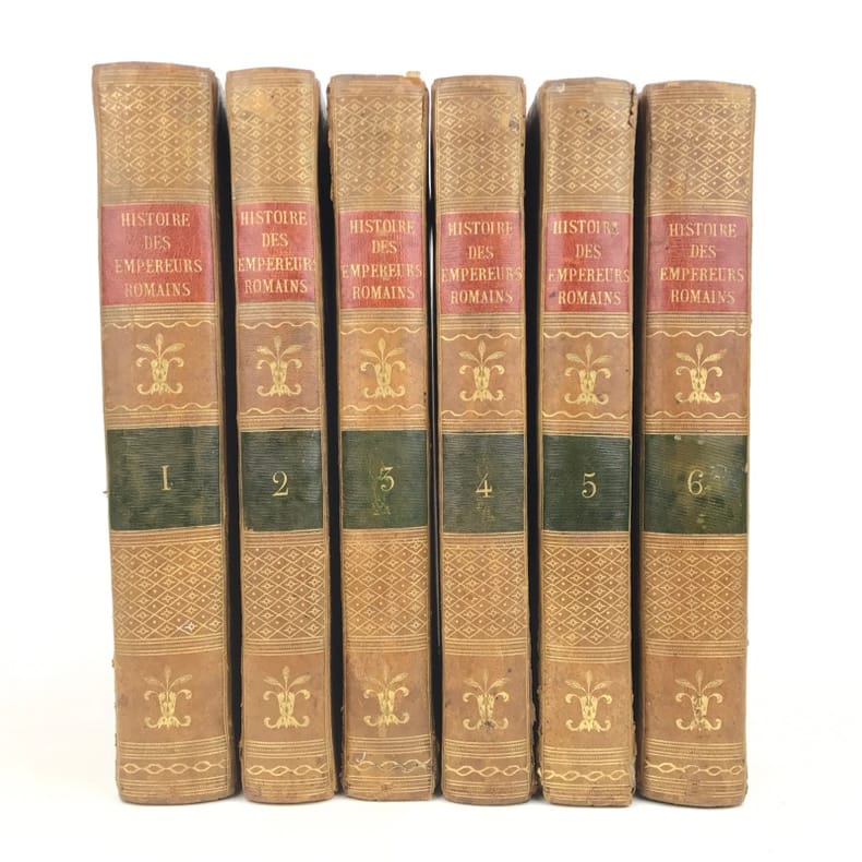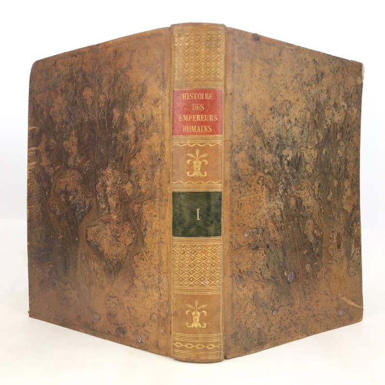 6 volumes in-4 (26 x 19 cm), basane racinée (reliure de l’époque), dos lisse orné, pièces de titre et de tomaison en basane rouge et verte, tranches marbrées, viii-[8]-616-[22] ; [8]-507-[17] ; [4]-546 ; [4]-528 ; [4]-500 ; [4]-540 pages (complet). Coins frottés, mors inférieur du tome V fendu, quelques galeries de vers au tome II, rares rousseurs. État correct. ÉDITION ORIGINALE, illustrée de 4 cartes dépliantes (2 au tome I, 1 au tome II et 1 au tome VI). Jean-Baptiste-Louis Crevier (1693-1765) est un littérateur et historien français. Déjà connu pour avoir fini la célèbre Histoire romaine de Charles Rollin, il rédige ces six volumes en se concentrant uniquement sur les empereurs, allant d’Auguste en 27, à Constantin au IVe siècle. Agréable exemplaire.