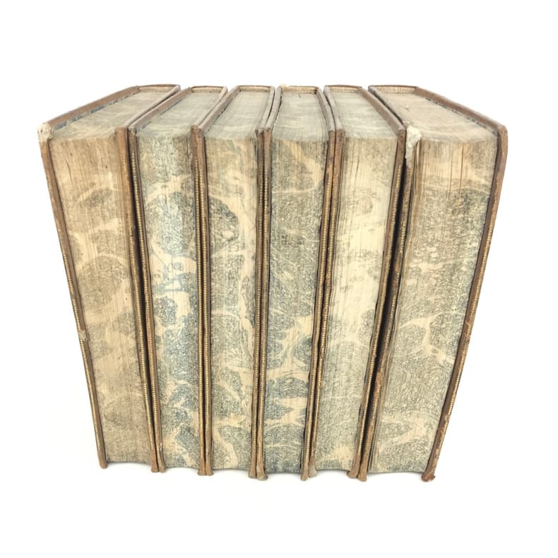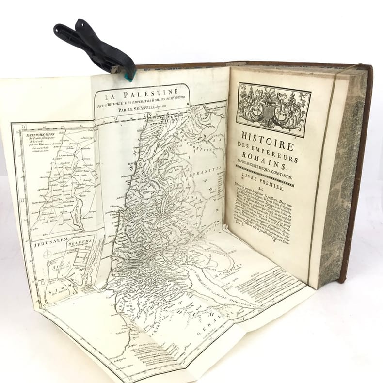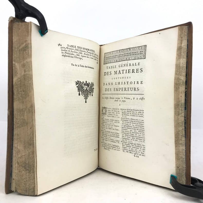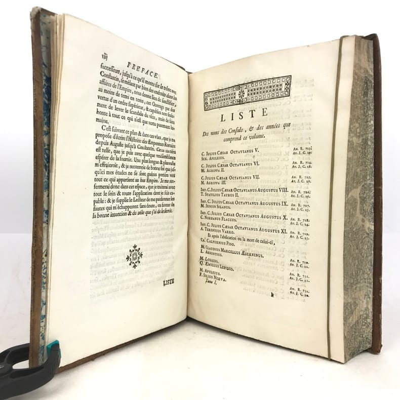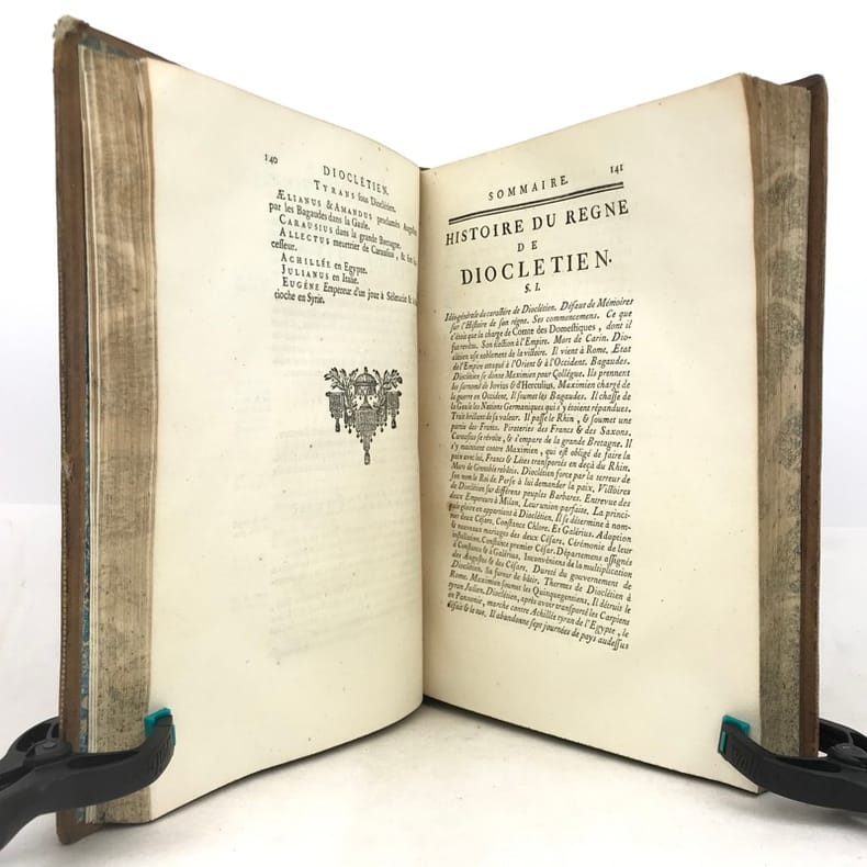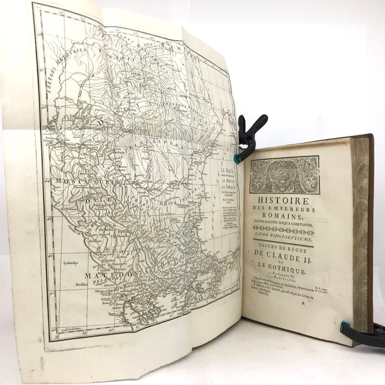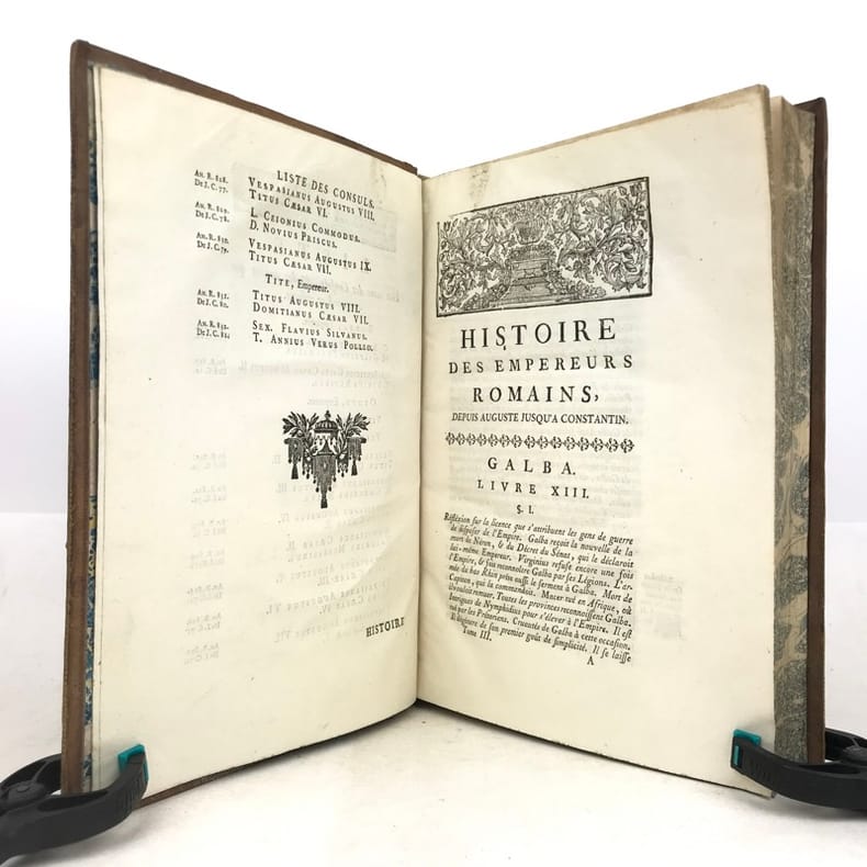 6 volumes in-4 (26 x 19 cm), basane racinée (reliure de l’époque), dos lisse orné, pièces de titre et de tomaison en basane rouge et verte, tranches marbrées, viii-[8]-616-[22] ; [8]-507-[17] ; [4]-546 ; [4]-528 ; [4]-500 ; [4]-540 pages (complet). Coins frottés, mors inférieur du tome V fendu, quelques galeries de vers au tome II, rares rousseurs. État correct. ÉDITION ORIGINALE, illustrée de 4 cartes dépliantes (2 au tome I, 1 au tome II et 1 au tome VI). Jean-Baptiste-Louis Crevier (1693-1765) est un littérateur et historien français. Déjà connu pour avoir fini la célèbre Histoire romaine de Charles Rollin, il rédige ces six volumes en se concentrant uniquement sur les empereurs, allant d’Auguste en 27, à Constantin au IVe siècle. Agréable exemplaire.