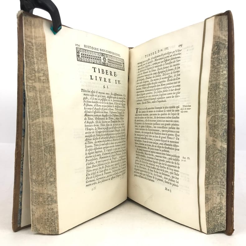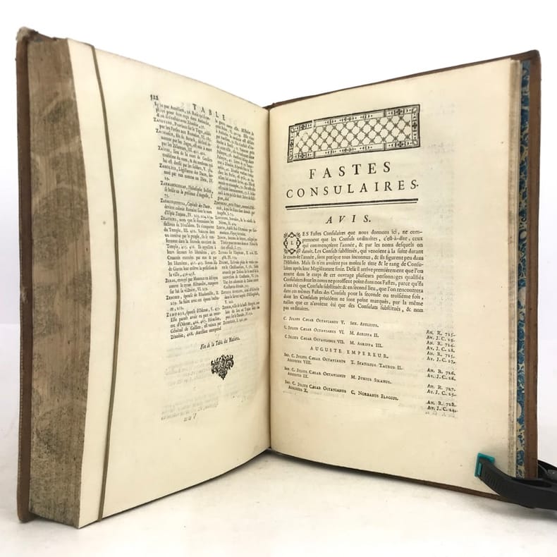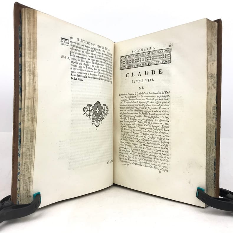 Par M. Crevier, Professeur Émérite de Rhétorique au Collège de Beauvais.Édition originaleillustrée 4 cartes repliées gravées par d'Anville (Géographe et Cartographe français). Lettrines, bandeaux et culs-de-lampes.A Paris, Chez Desaint et Saillant - 1750. Avec Approbation & Privilège du Roy.T1° Préface - Liste des Noms des Consuls, & des années que comprend ce volume - Carte (Germanie) - 616 pages - Table - 1750.T2° Liste des Noms des Consuls, et des années que comprend ce volume - Carte (L'Empire des Parthes) - 507 pages - Table - 1751.T3° Liste des Noms des Consuls, et des années que comprend ce volume - Carte (La Palestine) - Table - 546 pages - 1752.T4° Empereurs contenus dans ce volume - Carte (La Dace, La Moesie, La Thrace) - Table des sommaires - 528 pages - 1753.T5° Empereurs contenus dans ce volume - Table des sommaires - 500 pages - 1754.T6° Empereurs contenus dans ce volume - Table des matières - Fastes consulaires - 540 pages - 1756.Reliure plein veau granité de l'époque. Dos à nerfs joliment orné de fleurons et de grecques dorés. Pièces de titre et de tomaison maroquin rouge. Tranches jaspées. Triple filet doré encadrant les plats et double sur les coupes. Glose. Coiffes frottées. Pas de rousseur. Très bon état, intérieur très frais. Format in-4°(27x20).Jean-Baptiste-Louis Crevier littérateur et historien français. Fils d'un ouvrier imprimeur, il fut un des élèves les plus distingués de Charles Rollin, devint professeur de rhétorique au collège de Beauvais, remplit cette chaire pendant plus de vingt ans, avec autant de zèle que de succès, et mourut à Paris en 1765 après avoir donné au public divers ouvrages plus utiles que brillants. Il termina l'Histoire romaine de Rollin (il est l'auteur des volumes VIII à XVI), et la fit suivre d'une Histoire des empereurs romains jusqu'à Constantin, 1750, 6 volumes in-4.Jean-Baptiste Bourguignon d'Anville, né le 11 juillet 1697 à Paris (France) où il est mort le 28 janvier 1782, est un géographe et cartographe français.