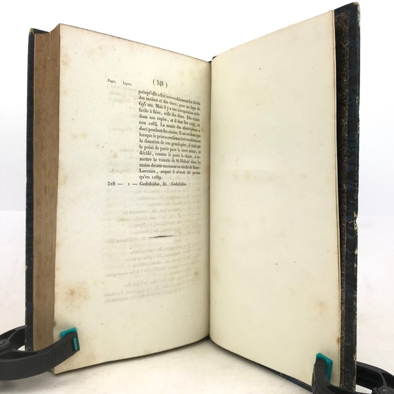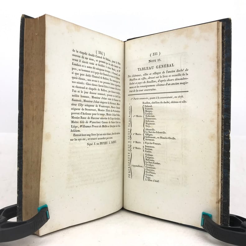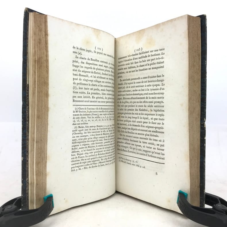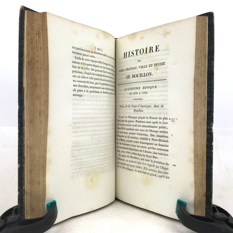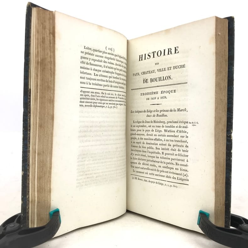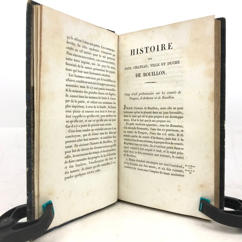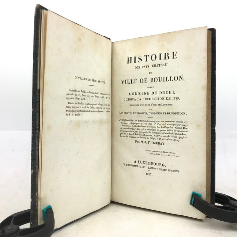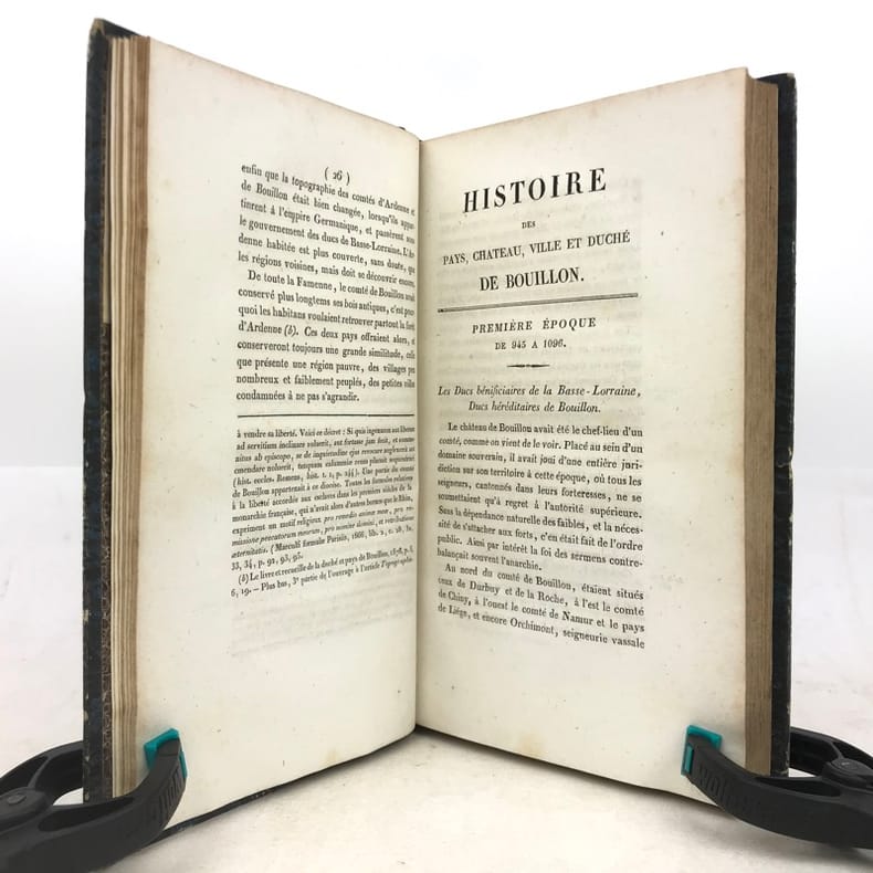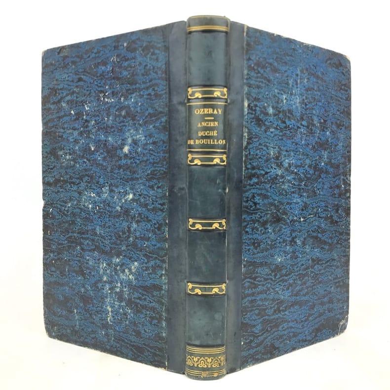 1 volume in-8 (20,5 x 12,5 cm), demi veau bleu (reliure de l’époque), dos lisse orné, tranches mouchetées, ex-libris d’Hecht-Dollfus contrecollé sur le premier contre plat, 348 pages (complet). Coins frottés, rousseurs. État correct tout de même. ÉDITION ORIGINALE. Michel-Jean-François Ozeray (1764-1859) est un historien français, également juge de paix. Il rédige ici un traité historique portant sur le duché de Bouillon, d’abord adjacent à celui de Liège, puis faisant partie du Saint-Empire romain germanique, avant d’être annexé par la France en 1795. Bon exemplaire.