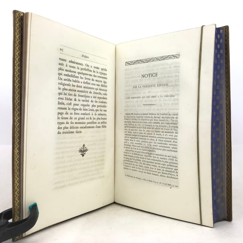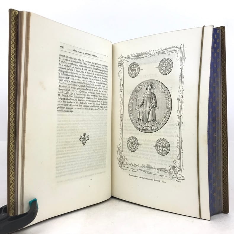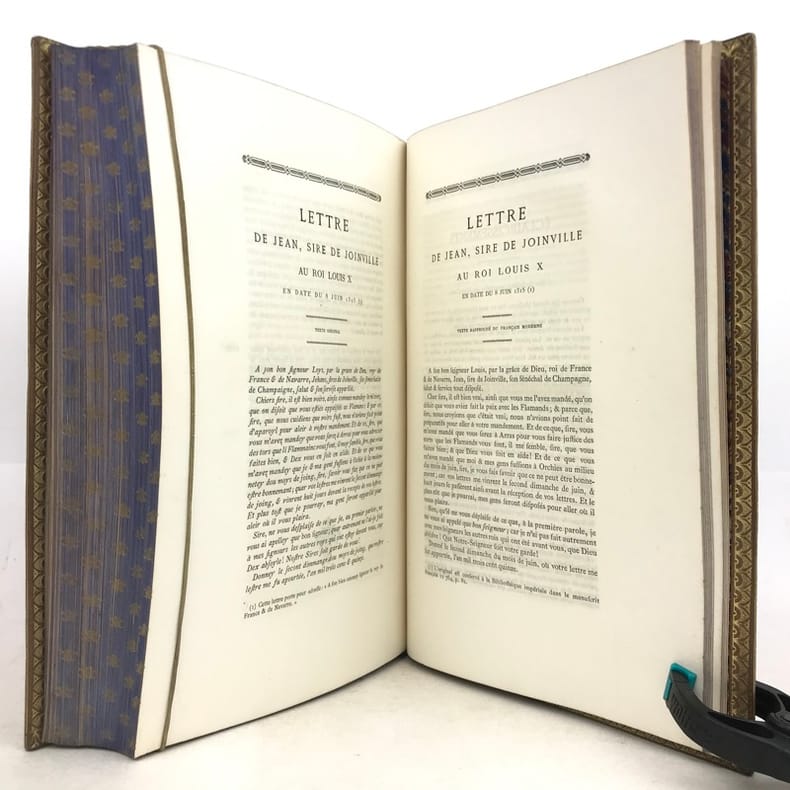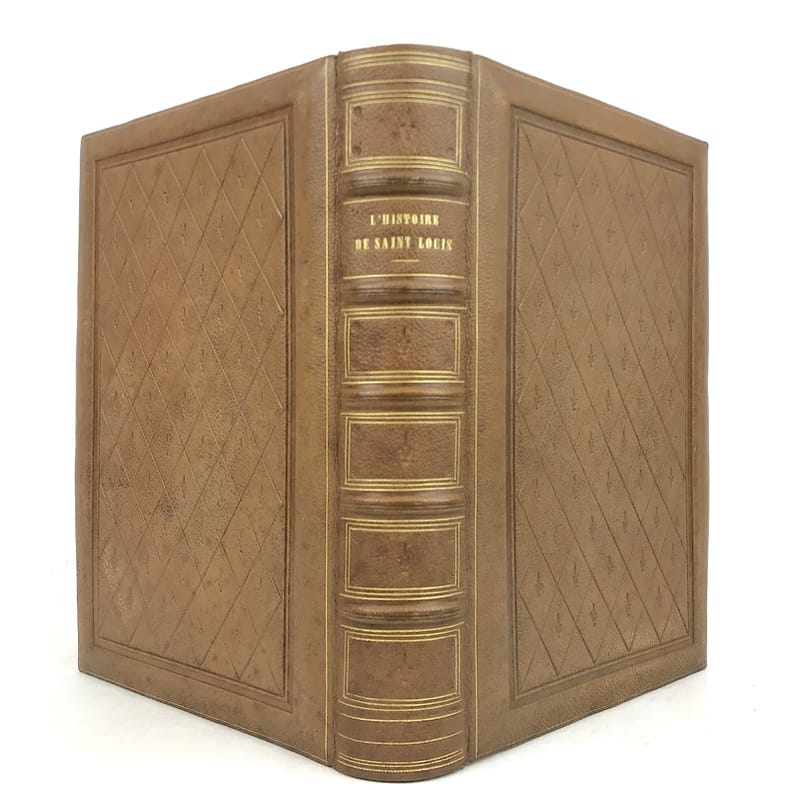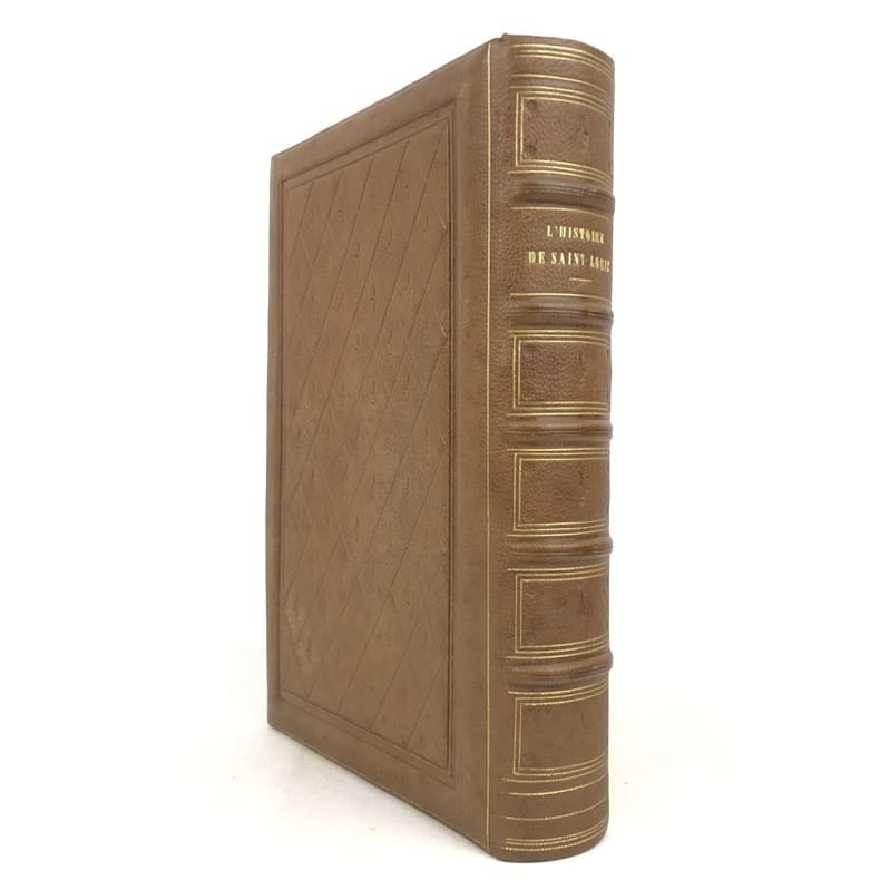 1 volume in-4 (25,5 x 17 cm), maroquin fauve fleurdelysé à froid (reliure de l’époque), dos à nerfs orné, tranches bleues avec semi de fleurs de lys dorées, filet doré sur les coupes, roulette dorée sur les chasses, titre en rouge et noir, ex-libris aux armes non identifiées, [4]-xxxii-576 pages (complet). Quelques fines rousseurs. Très bon état. Édition illustrée d’un frontispice, et de deux gravures à pleine page, dont une in texte. Jean de Joinville (1224-1317), croisé en 1248 à la suite de Louis IX, participa à la prise de Damiette (1249) et à la bataille de Mansourah (1250) ; fait prisonnier avec le roi, malade, libéré et rapatrié à Saint-Jean-d’Acre (1250), il prolongea son séjour en Terre Sainte avec Louis IX (1251-1254) qui le prit à son service et dont il devint le confident, l’admirateur et le conseiller. Ses « Mémoires » furent composés entre le 1er novembre 1305 et le 30 avril 1306, à la demande de la reine Jeanne de Navarre. Le récit commence peu de temps avant la septième croisade pour s’achever seize ans après, l’expédition proprement dite occupant les deux tiers de l’ouvrage. Plaisant exemplaire.