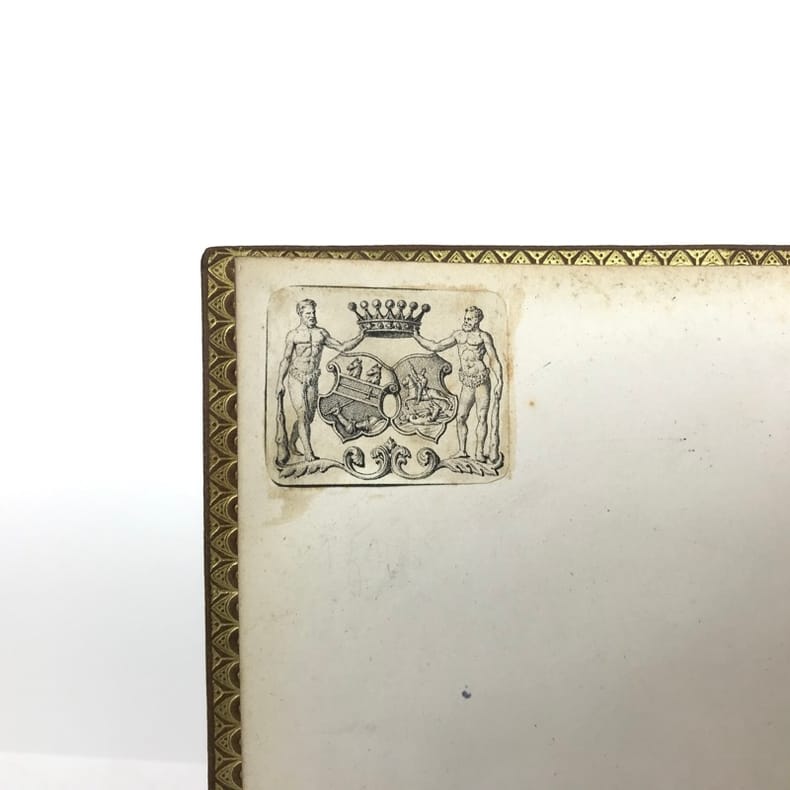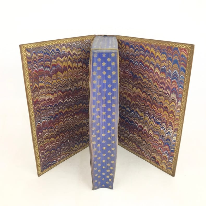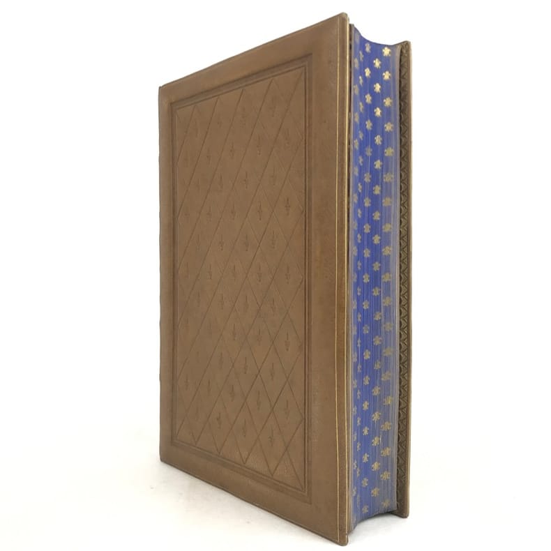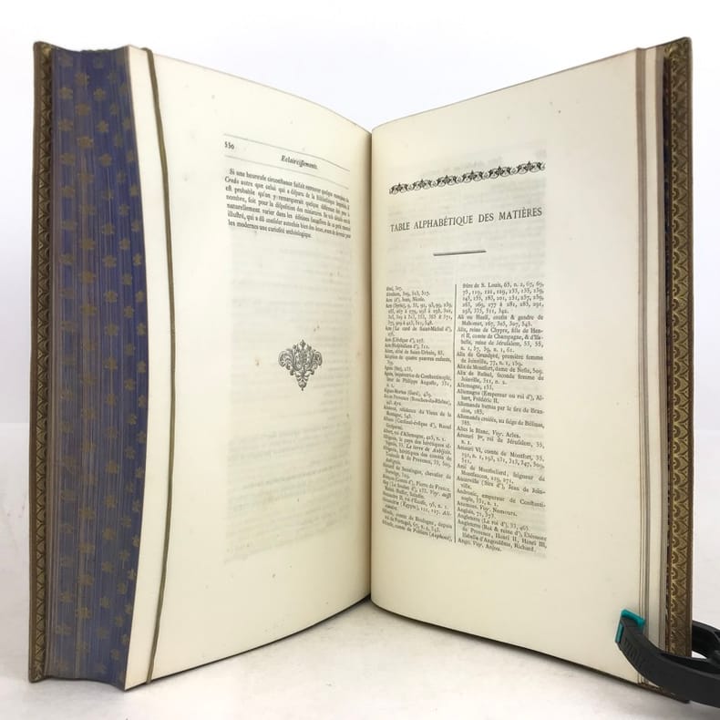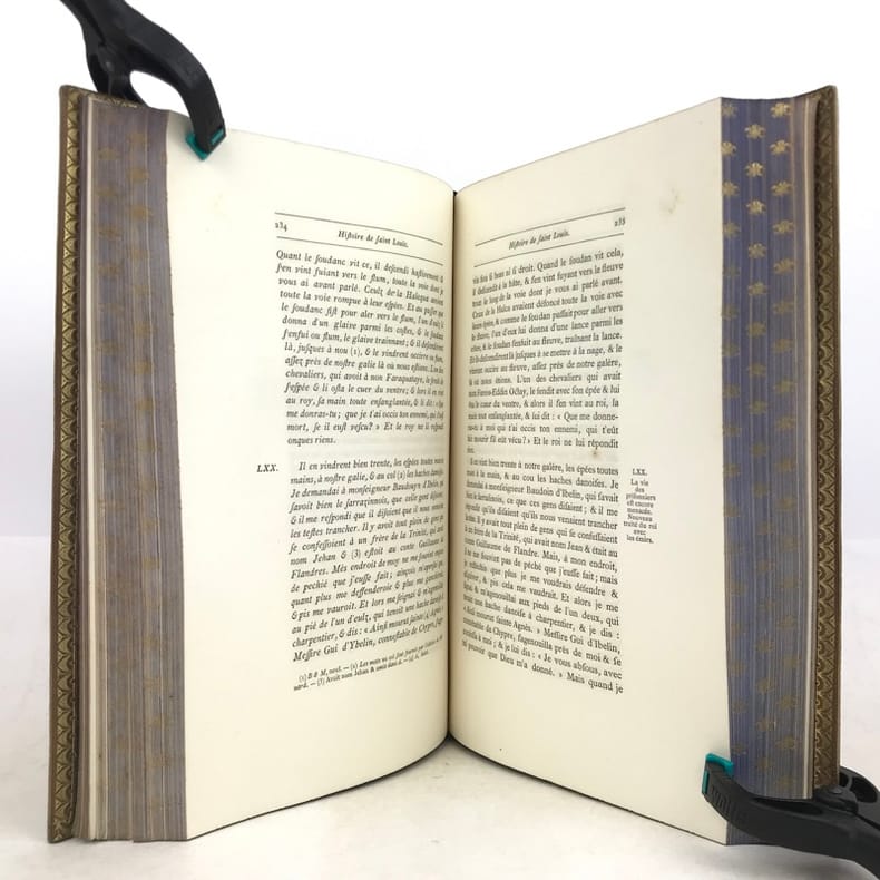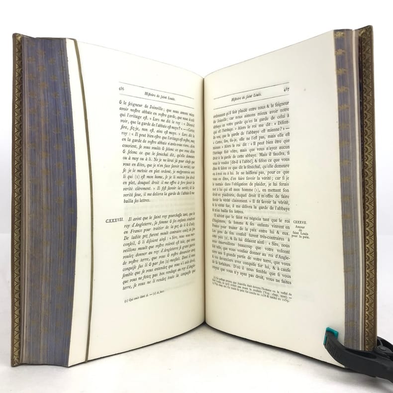 1 volume in-4 (25,5 x 17 cm), maroquin fauve fleurdelysé à froid (reliure de l’époque), dos à nerfs orné, tranches bleues avec semi de fleurs de lys dorées, filet doré sur les coupes, roulette dorée sur les chasses, titre en rouge et noir, ex-libris aux armes non identifiées, [4]-xxxii-576 pages (complet). Quelques fines rousseurs. Très bon état. Édition illustrée d’un frontispice, et de deux gravures à pleine page, dont une in texte. Jean de Joinville (1224-1317), croisé en 1248 à la suite de Louis IX, participa à la prise de Damiette (1249) et à la bataille de Mansourah (1250) ; fait prisonnier avec le roi, malade, libéré et rapatrié à Saint-Jean-d’Acre (1250), il prolongea son séjour en Terre Sainte avec Louis IX (1251-1254) qui le prit à son service et dont il devint le confident, l’admirateur et le conseiller. Ses « Mémoires » furent composés entre le 1er novembre 1305 et le 30 avril 1306, à la demande de la reine Jeanne de Navarre. Le récit commence peu de temps avant la septième croisade pour s’achever seize ans après, l’expédition proprement dite occupant les deux tiers de l’ouvrage. Plaisant exemplaire.