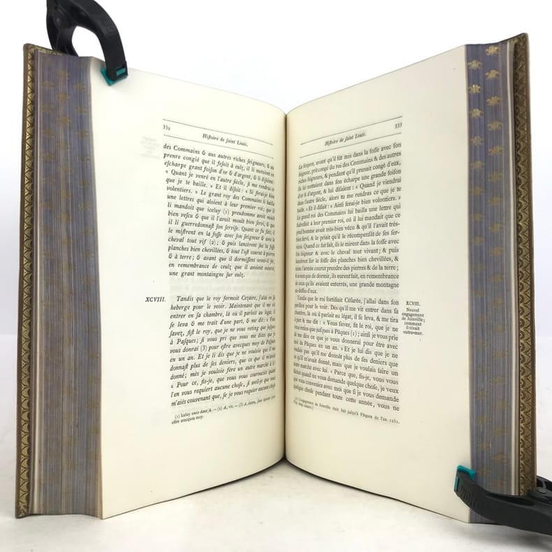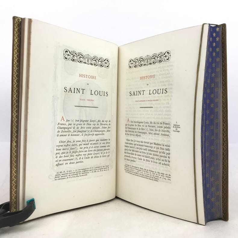 Très belle édition de l'Histoire de saint Louis écrite par son ami Joinville (1224-1317), qui le suivit lors de la VIIe Croisade et décrit les événements en témoin oculaire. Texte original en ancien français avec traduction en français moderne en regard. Edition Originale du texte établi par Natalis de Wailly (1805-1886).