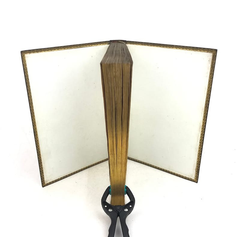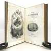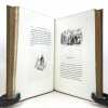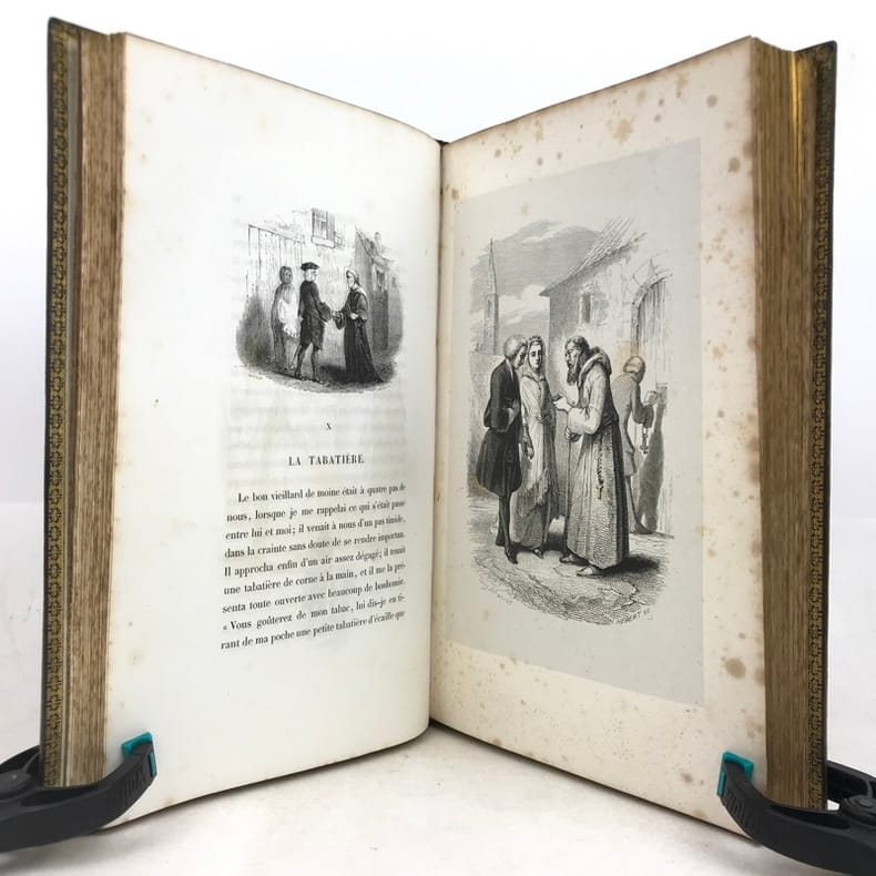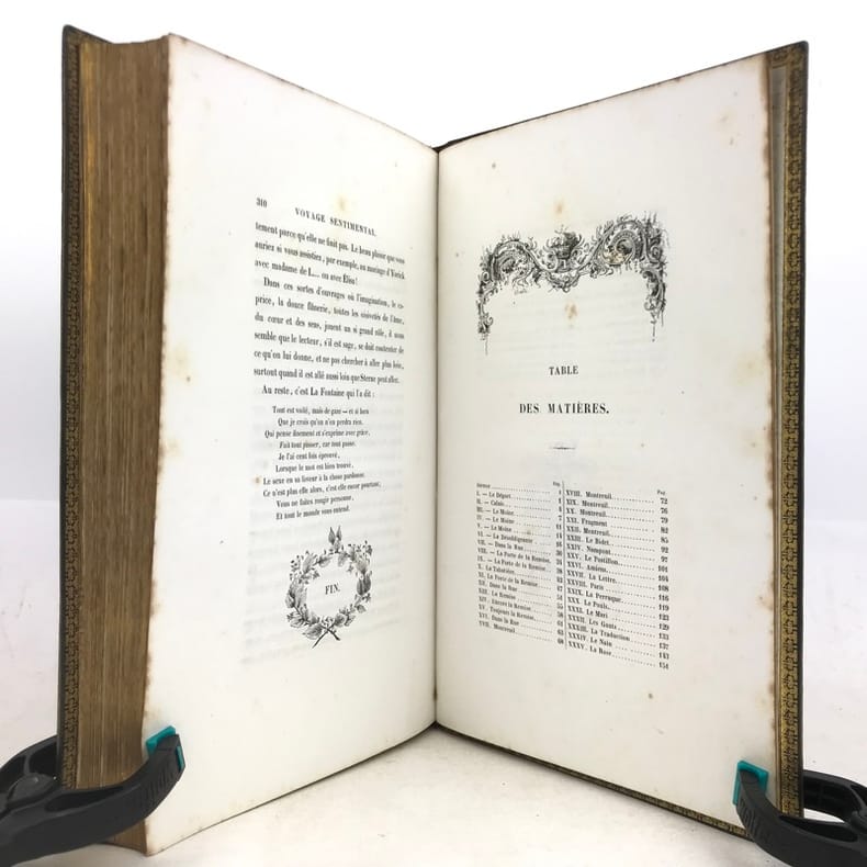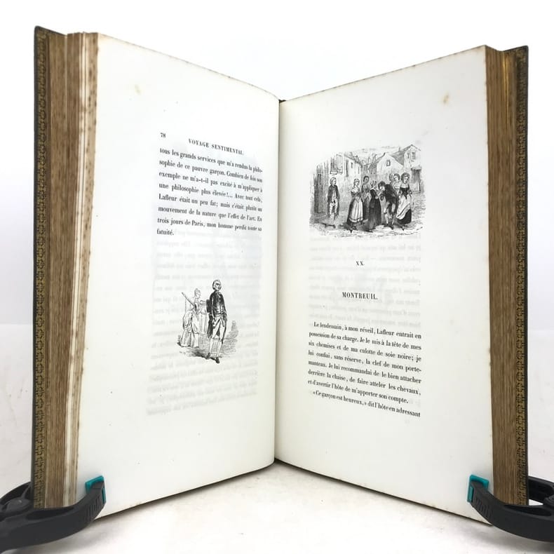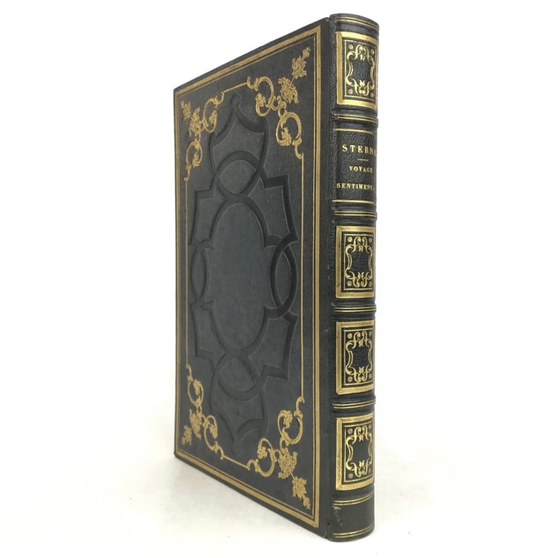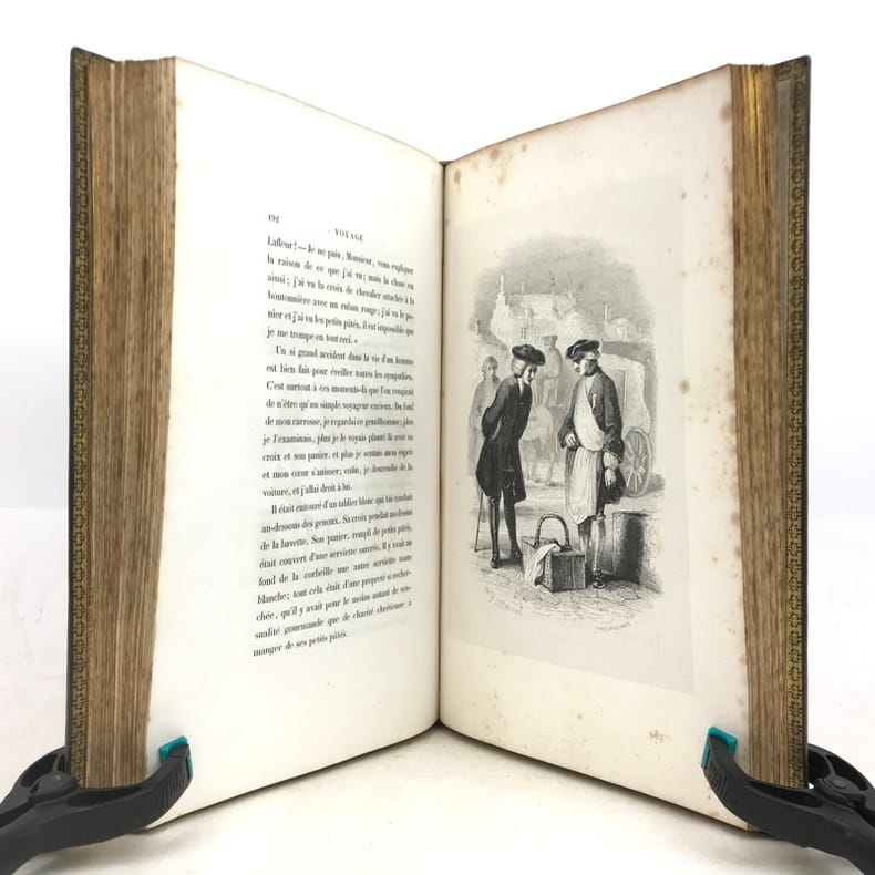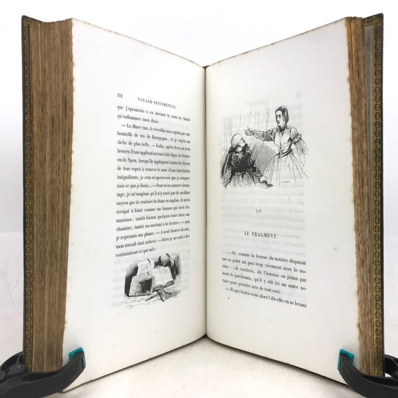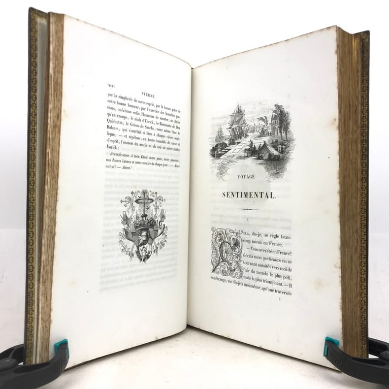 1 volume petit in-4 (25 cm x 16,5 cm), maroquin vert de gris (reliure de l’époque), dos à nerfs joliment orné à motifs dorés, grand décor doré et à froid sur les plats, roulette dorée intérieure, doublure et gardes de papier marbré blanc, tranches dorées, cachet ex-libris sur le premier feuillet blanc. [4]-xliv-312 (complet). Reliure inégalement insolée avec quelques taches, rousseurs éparses sur les feuillets de texte, sans gêne de lecture, et sur les planches. État correct tout de même. Nouvelle traduction précédée d’un Essai sur la vie et les ouvrages de Sterne par Jules Janin; illustrée en premier tirage, d’un frontispice et de 11 planches hors texte, tirés sur Chine monté, et montés sur papier fort, et de très nombreuses figures dans le texte, le tout gravé sur bois par Tony Johannot et Jacque. Laurence Sterne (1713-1768) écrivain et membre du clergé britannique. Ses œuvres les plus célèbres sont Vie et Opinions de Tristram Shandy, gentilhomme (The Life and Opinions of Tristram Shandy, Gentleman), et le Voyage sentimental à travers la France et l'Italie (A Sentimental Journey Through France and Italy). Sterne a également publié des sermons, écrit des mémoires et pris part à la vie politique locale. Bon exemplaire.