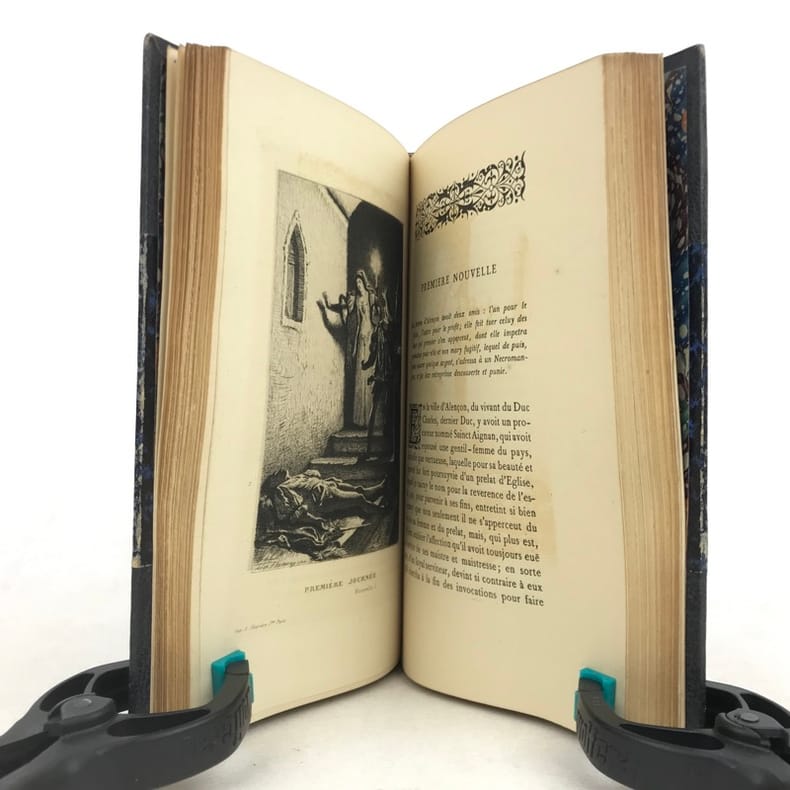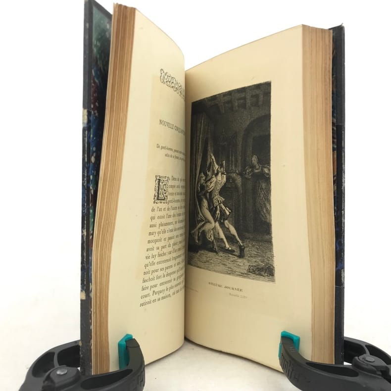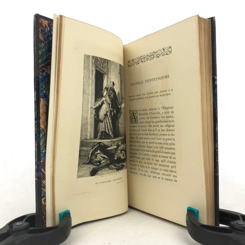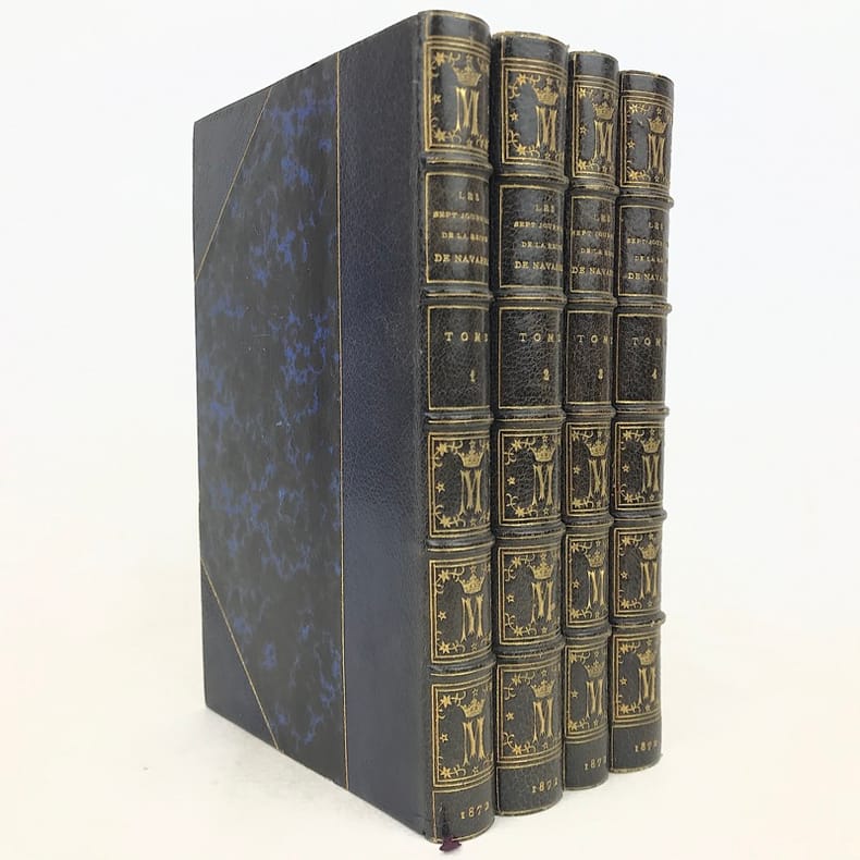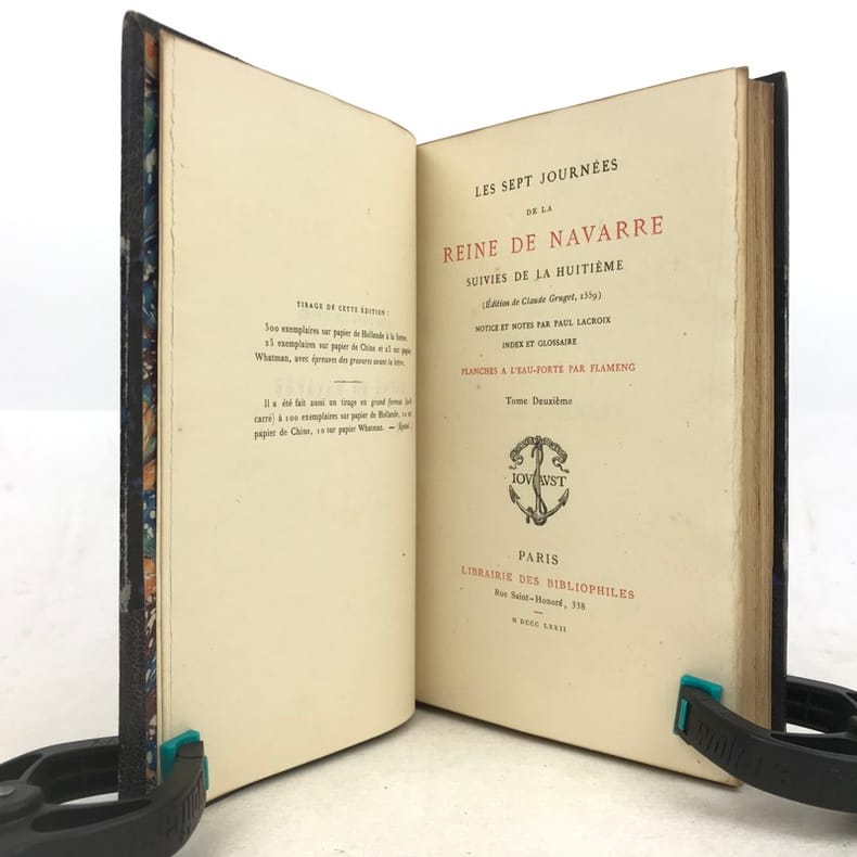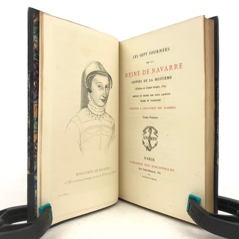 8 parties (journées) en 4 volumes in-12 (17 x 11 cm), demi-maroquin bleu marine à coins (reliure de l’époque, signée Allô), dos à nerfs ornés de filets, petits fers et chiffre M couronnés, répétés, dorés, têtes dorées, [4]-li-1bl.-160-3pl. ; [4]-125-3bl.-136-1pl. ; [4]-84-91-1bl.-2pl. ; [4]-79-1bl.-95-1bl.-56-3pl. pages (complet). Dos passés, légers frottements sur les charnières et les coiffes, coins légèrement émoussés. État très correct. Portrait-frontispice et 8 planches hors texte, gravés à l’eau-forte par Flameng. Réimpression du texte de “L’Heptaméron des nouvelles de tres illustres et tres excellente princesse Marguerite de Valois, Royne de Navarre”, de la seconde édition par Claude Gruget (Chez Cavellier, en 1559), (la première fut publiée en 1558 par Leroux de Lincy). Seconde édition, mais première qui donne au complet toutes les nouvelles de la Reine de Navarre. Exemplaire sur papier filigrané Hollande Van Gelder, ici non numéroté. Bon exemplaire. Vendu 02/10/2025