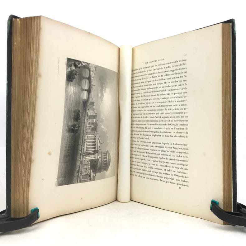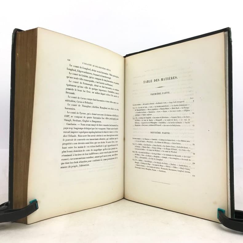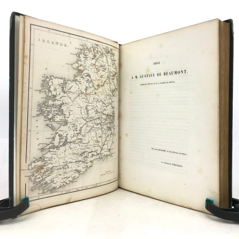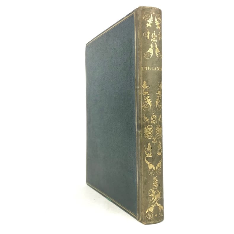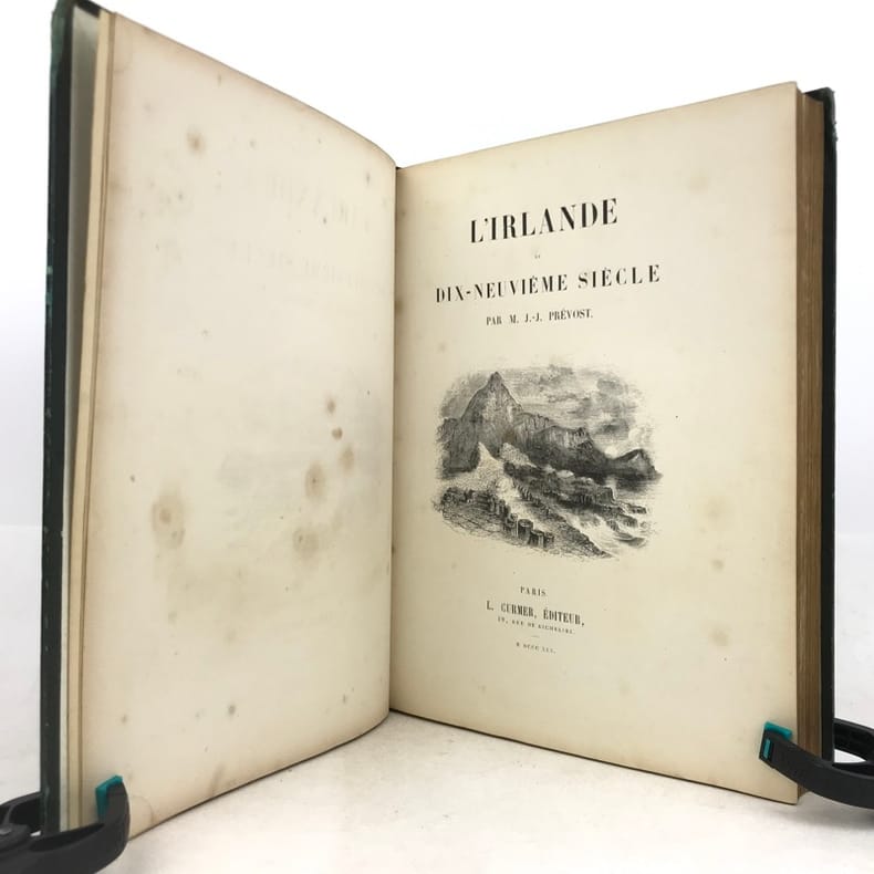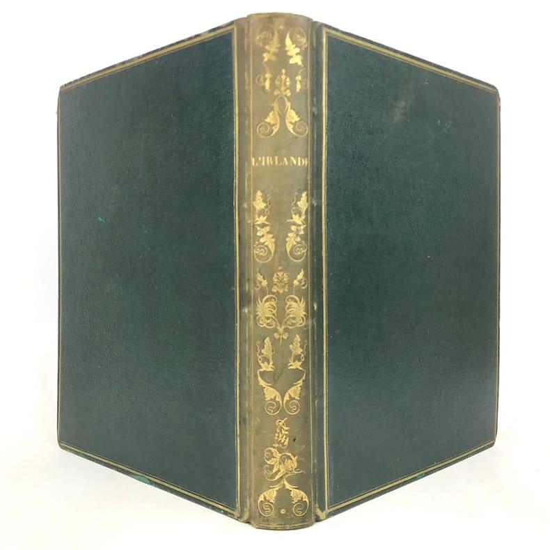 1 volume in-4 (27 x 20,5 cm), demi-chagrin vert (reliure de l’époque), dos lisse orné en long de fleurons dorés, double filet doré en encadrement, gardes et doubles gardes de papier blanc marbré, tranches marbrées. [6]-iv-126-[2] pages (complet). Dos insolé, frottements sur les coiffes et les charnières, les chants et les coins, ces derniers ont été teintés en vert, charnières intérieures fendues, quelques rousseurs éparses sur les feuillets de texte sans gêne de lecture et sur les planches, avec quelques petites mouillures marginales. État très correct tout de même. Édition illustrée d’une grande vignette de titre gravée sur bois; d’un titre gravé, d’une carte de l’Irlande et de 62 planches hors texte, gravés sur acier par Bartlett. Ici, Prévost nous conte un voyage qu'il a réalisé, celui-ci démarre à Londres, Windsor, Bristol puis débarque à Cork et visite toute l'Irlande. “J. Prevost visita l'Irlande dans les années 1840 à la veille de la Grande Famine. Il nous laisse des comptes rendus fort détaillés de ses périples aux quatre coins du pays. Sur l'évocation de l'Irlande historique et géographique de l'époque, il greffe des portraits fort vivants des Irlandais eux-mêmes, allant de Daniel O'Connell à la paysannerie." Bon exemplaire.