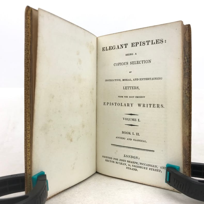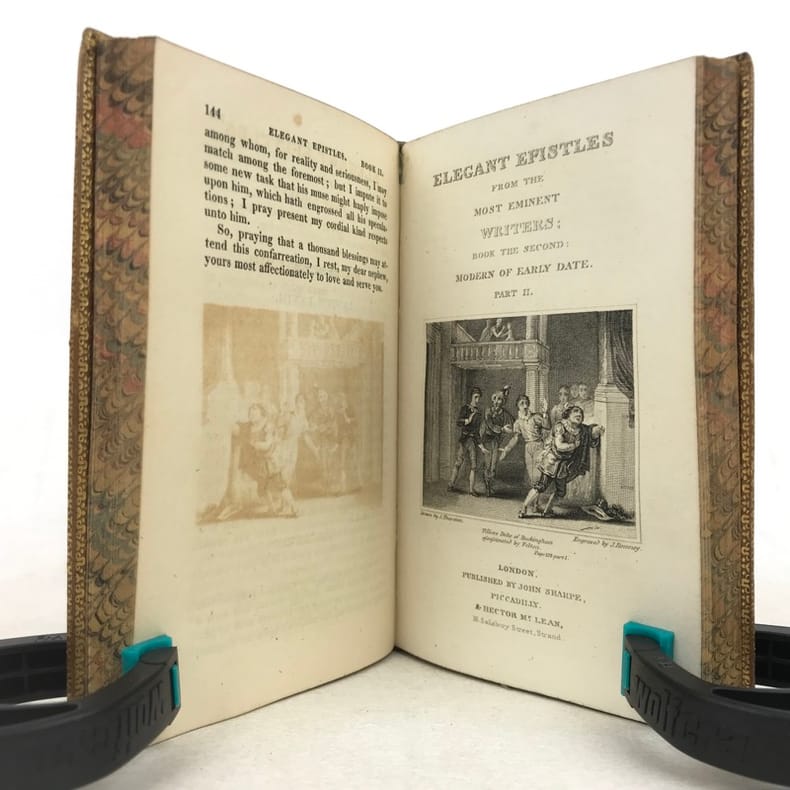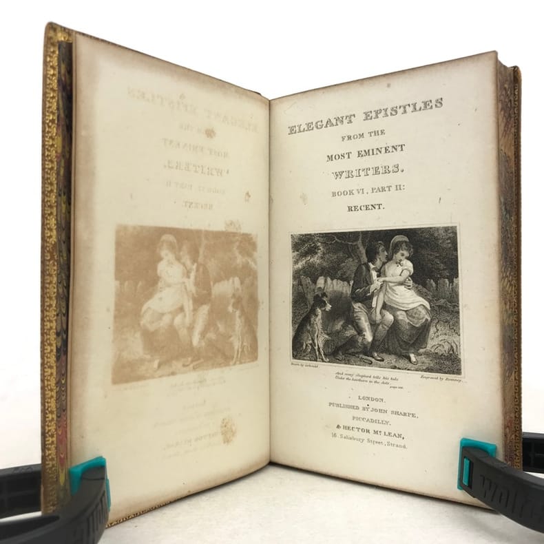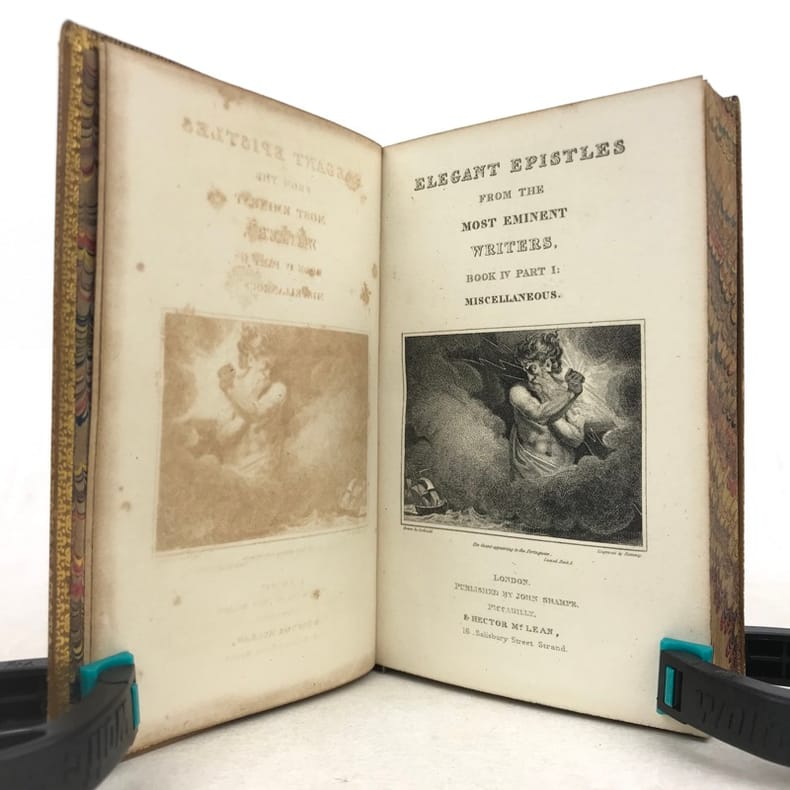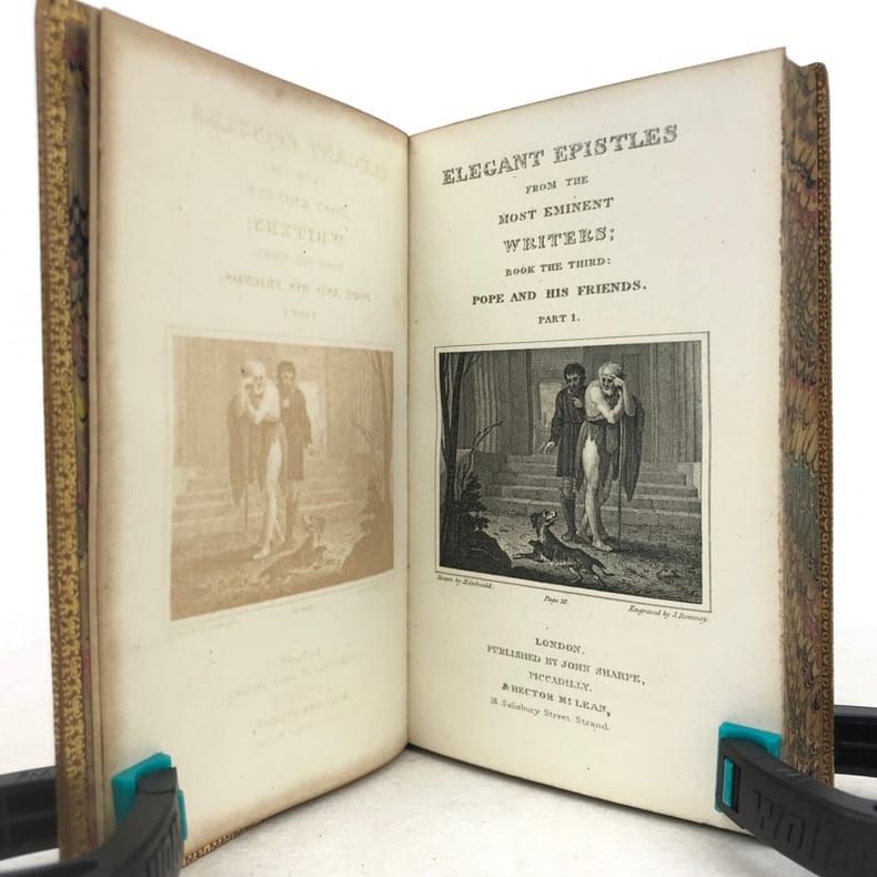 6 volumes in-16 (12,7 x 8,4 cm), veau blond (reliure de l’époque), dos à nerfs ornés et caisson fleuronnés à froid, pièces de titre de maroquin rouge et de tomaison verte, filet double en encadrement des plats, roulette sur les coupes, tranches marbrées, texte en anglais. [6]-288 ; [6]-287-1 bl. ; [6]-288 ; [6]-222 ; [6]-288 ; [6]-287-1 bl. pages (complet). Petits frottements angulaires, légères brunissures. Bon état. ÉDITION ORIGINALE illustrée d’un titre gravé hors texte avec une vignette d’après Thurston ou Corbould à l’entrée de chaque partie (deux par volume, celles du VIe volume inversées). Ravissant recueil épistolaire d’auteurs anciens et classiques : Cicéron, Pline, Henry Sidney, James Howel, Lady Rusell, Pope, Lady Montague, Dr. Herring, Lord Chesterfield, William Cowper, et d’autres. Plaisant exemplaire.