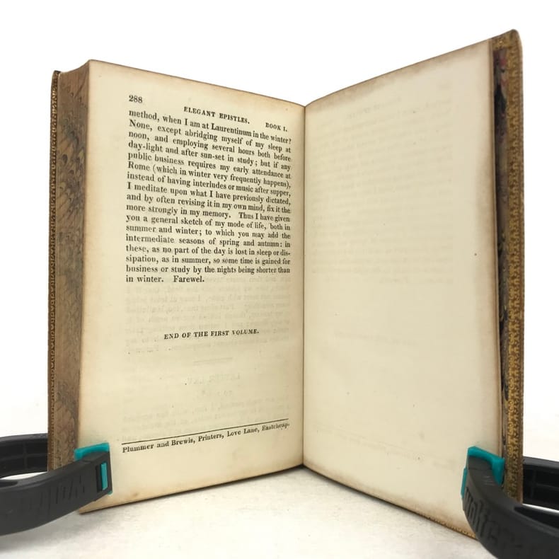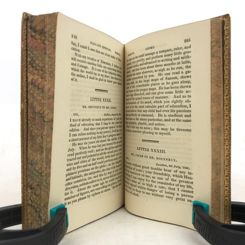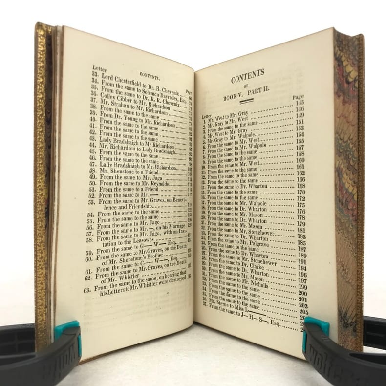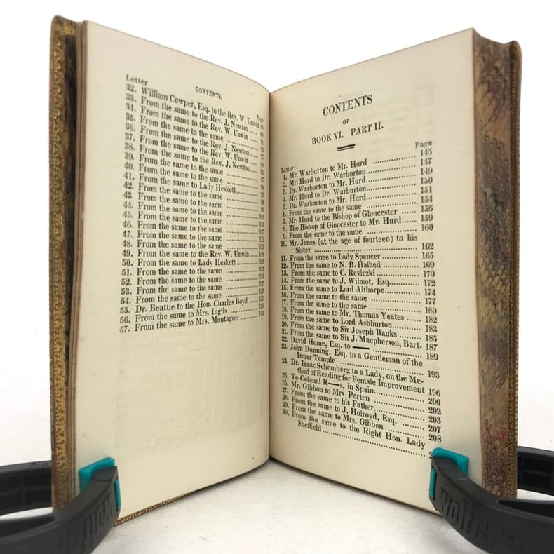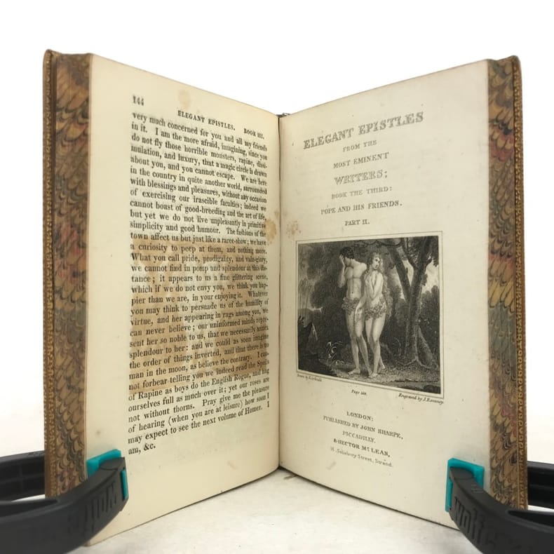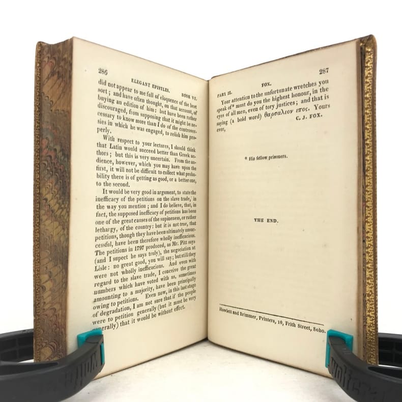 6 volumes in-16 (12,7 x 8,4 cm), veau blond (reliure de l’époque), dos à nerfs ornés et caisson fleuronnés à froid, pièces de titre de maroquin rouge et de tomaison verte, filet double en encadrement des plats, roulette sur les coupes, tranches marbrées, texte en anglais. [6]-288 ; [6]-287-1 bl. ; [6]-288 ; [6]-222 ; [6]-288 ; [6]-287-1 bl. pages (complet). Petits frottements angulaires, légères brunissures. Bon état. ÉDITION ORIGINALE illustrée d’un titre gravé hors texte avec une vignette d’après Thurston ou Corbould à l’entrée de chaque partie (deux par volume, celles du VIe volume inversées). Ravissant recueil épistolaire d’auteurs anciens et classiques : Cicéron, Pline, Henry Sidney, James Howel, Lady Rusell, Pope, Lady Montague, Dr. Herring, Lord Chesterfield, William Cowper, et d’autres. Plaisant exemplaire.