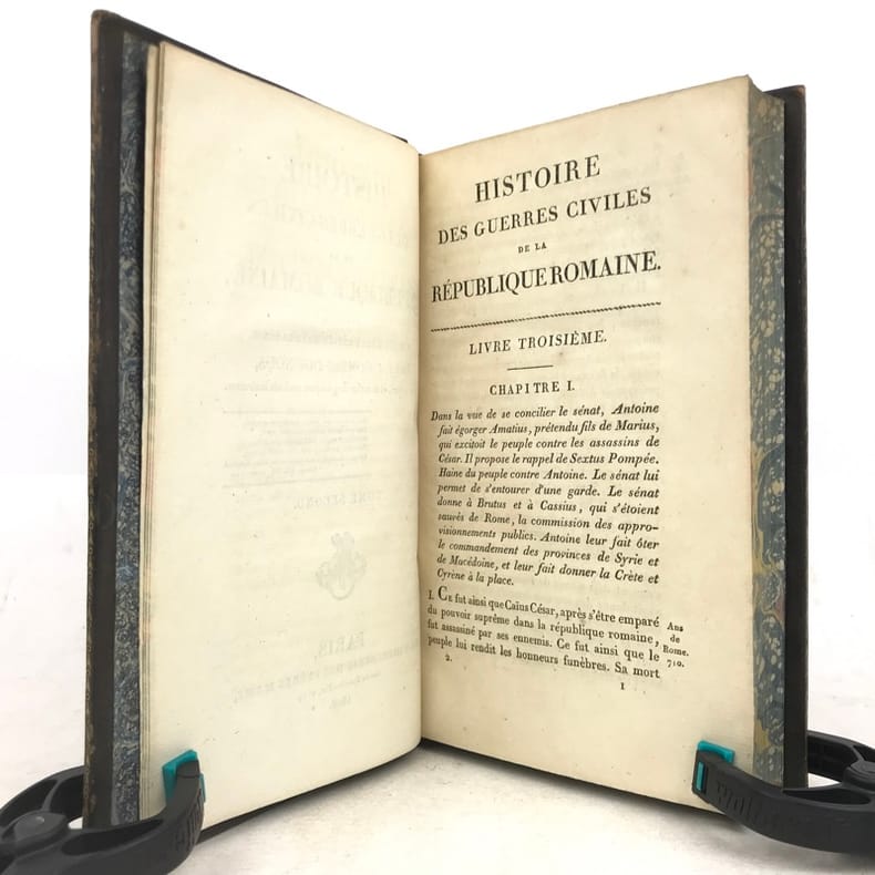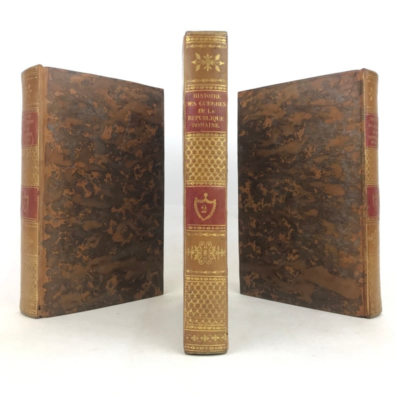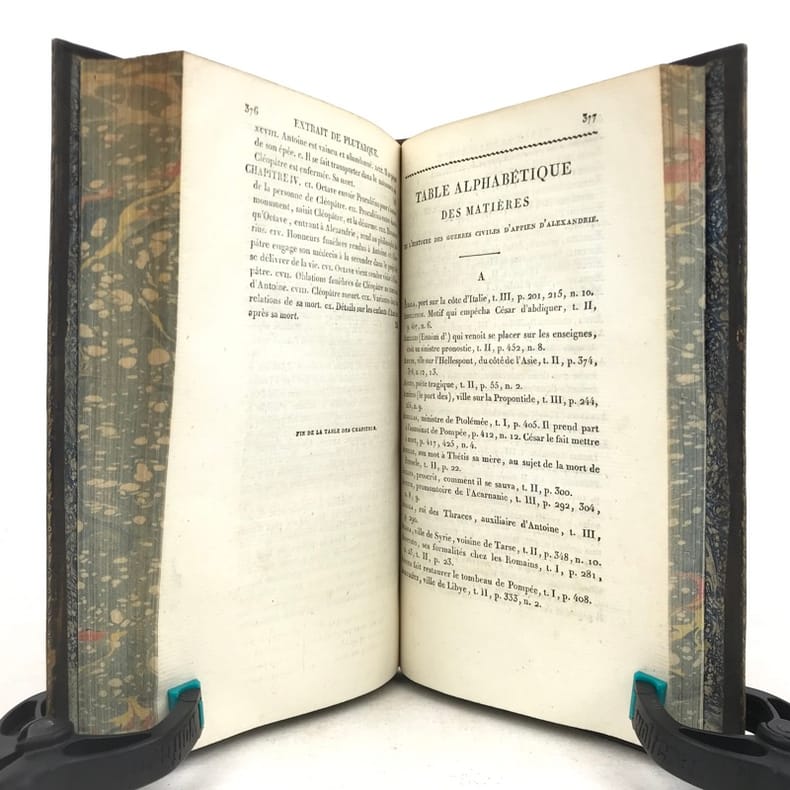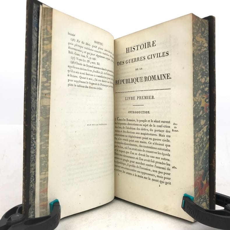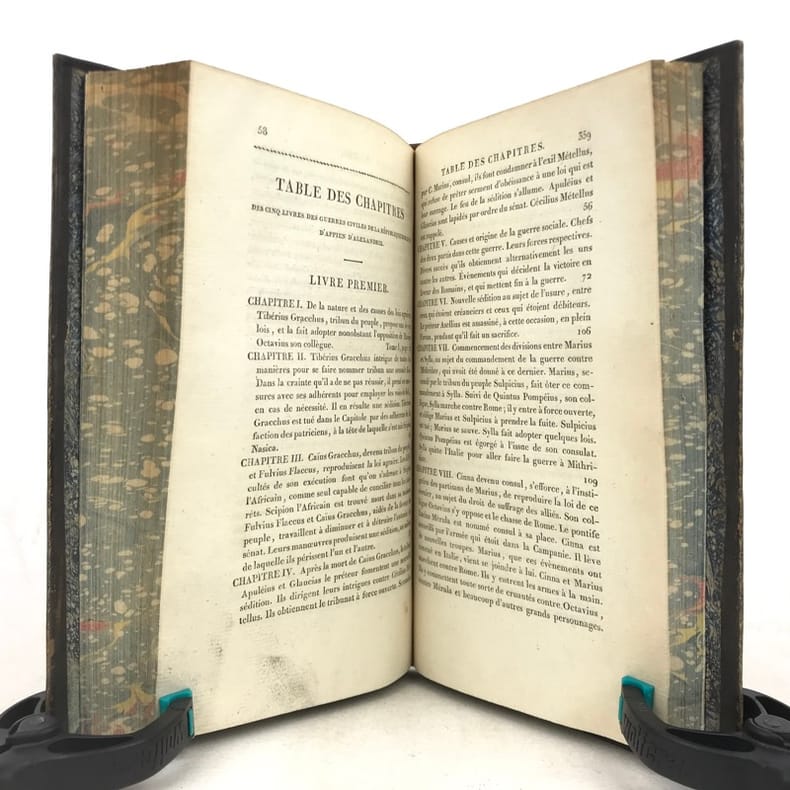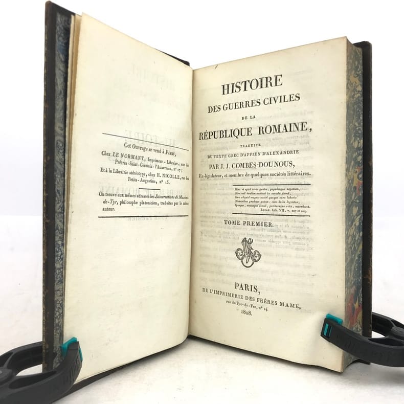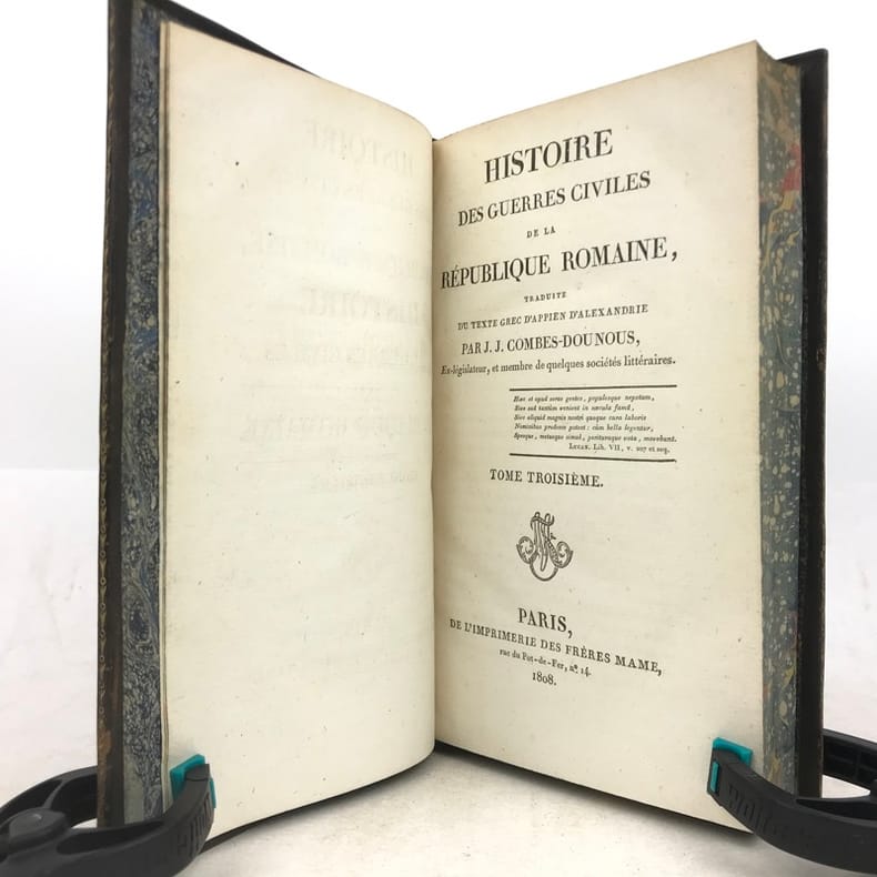 3 volumes in-8 (20 x 12,5 cm), veau marbré (reliure de l'époque), dos lisses joliment ornés, pièces de titre et de tomaison en maroquin grenat, tranches marbrées, lxxxiv-556 ; [4]-475-1bl. ; [4]-494 pages (complet). Légers frottements sur les chants et les coins, petite déchirure marginale à un feuillet avec atteinte au texte sans manque au tome 1, et quelques feuillets un peu roussis. Bon état. Nouvelle édition de cette célèbre histoire romaine, qui est la seule œuvre qu'il nous reste d'Appien d'Alexandrie, historien grec du premier siècle avant notre ère. Il y décrit les principales guerres de conquête et guerres civiles de la fin de la République, et couvre l'ensemble de l'histoire de Rome depuis la légende d'Énée jusqu'au règne de Trajan. Sa traduction française est ici réalisée par Jean-Isaac Combes-Dounous (1758-1820), magistrat, homme politique et helléniste français. Son travail linguistique est aujourd'hui largement contesté. Plaisant exemplaire.