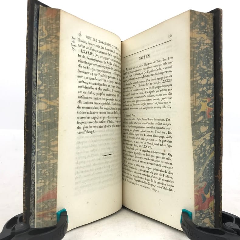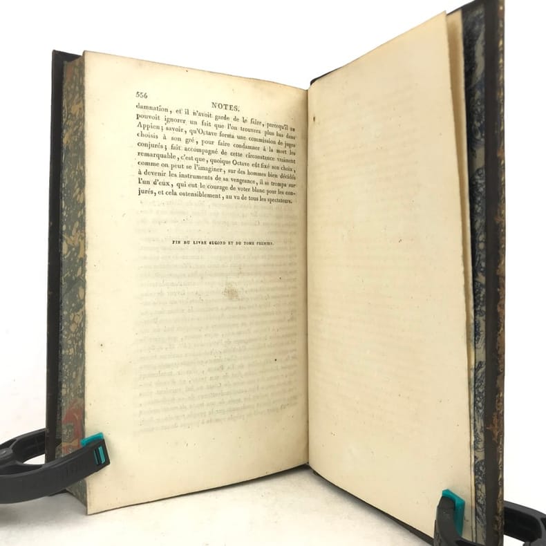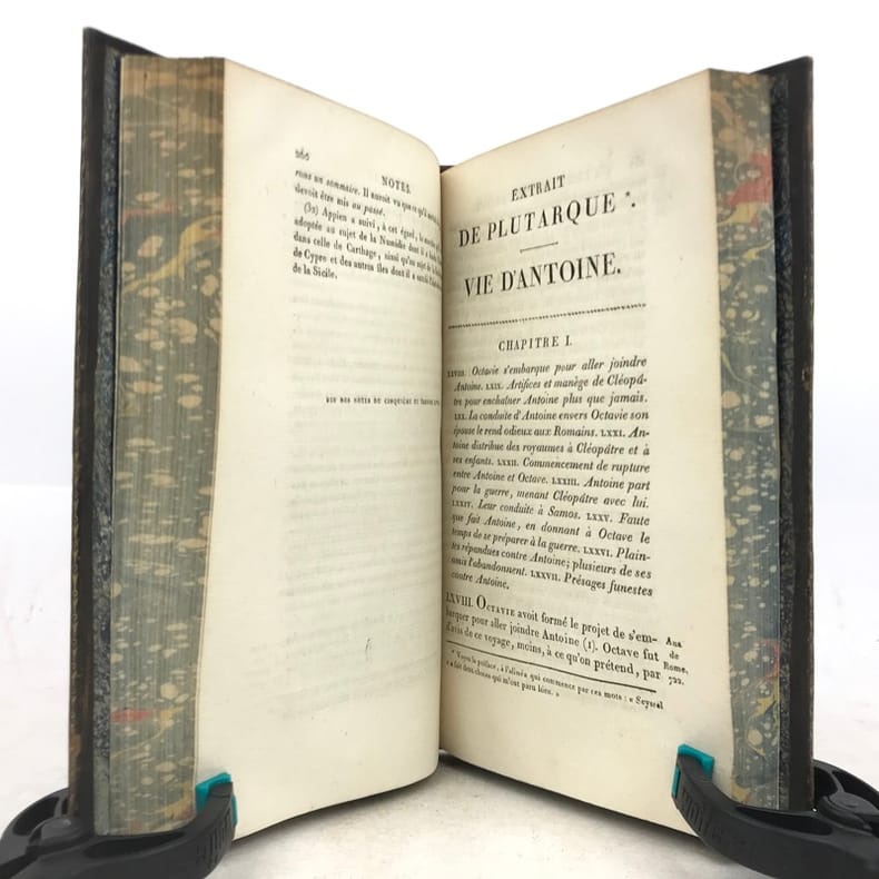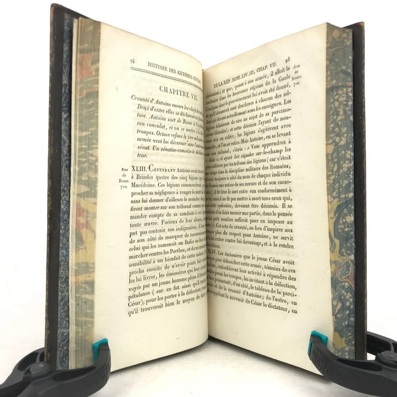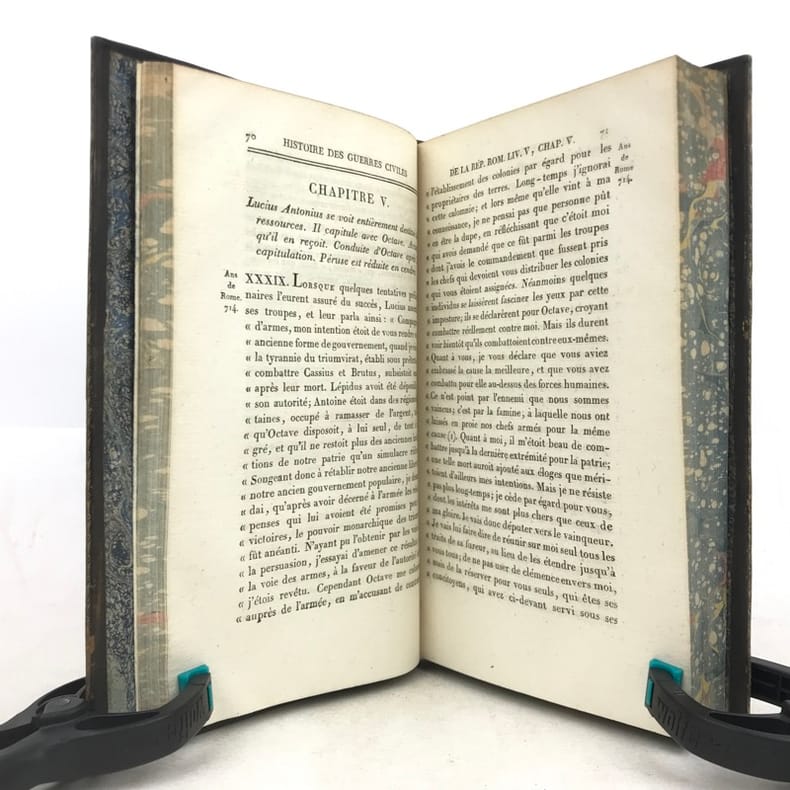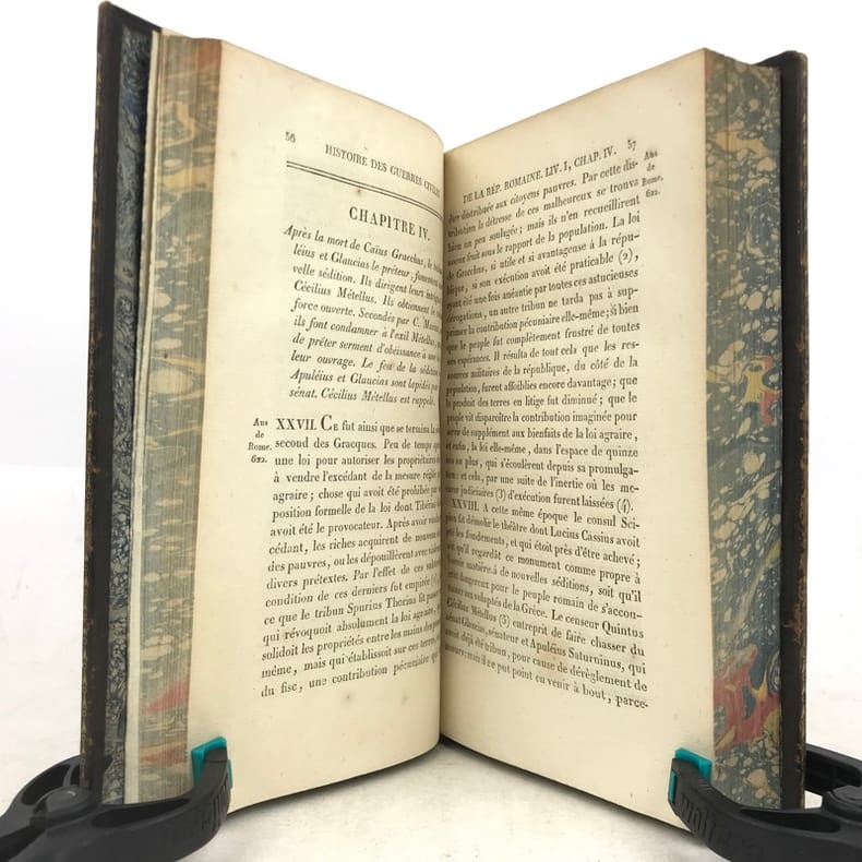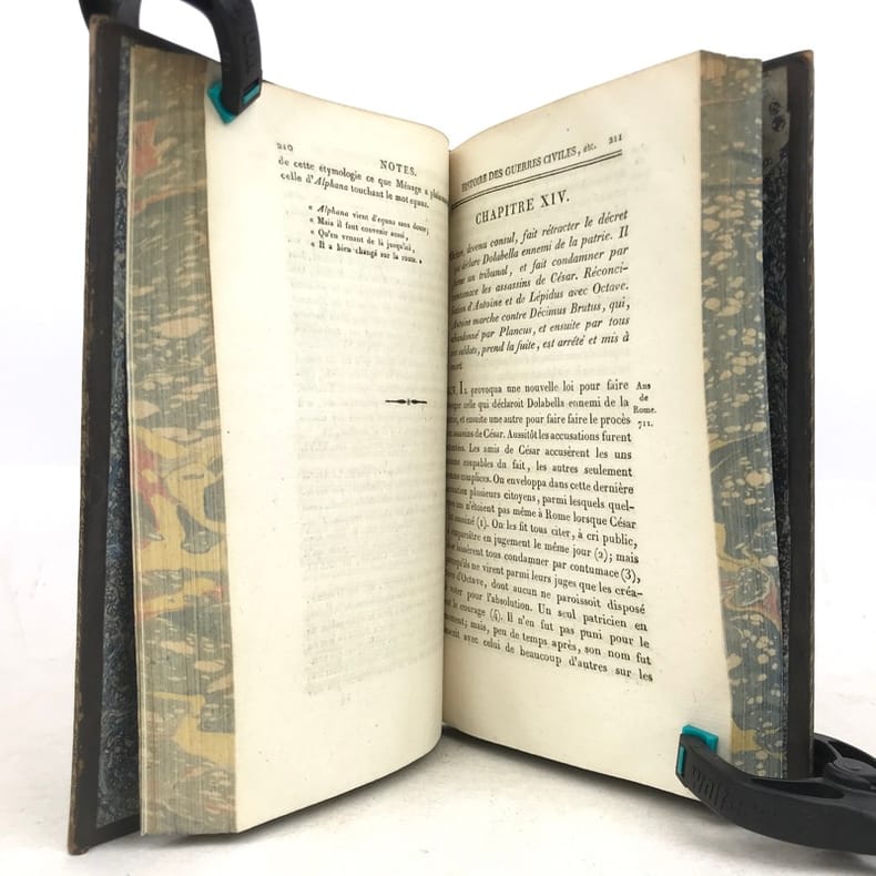 3 volumes in-8 (20 x 12,5 cm), veau marbré (reliure de l'époque), dos lisses joliment ornés, pièces de titre et de tomaison en maroquin grenat, tranches marbrées, lxxxiv-556 ; [4]-475-1bl. ; [4]-494 pages (complet). Légers frottements sur les chants et les coins, petite déchirure marginale à un feuillet avec atteinte au texte sans manque au tome 1, et quelques feuillets un peu roussis. Bon état. Nouvelle édition de cette célèbre histoire romaine, qui est la seule œuvre qu'il nous reste d'Appien d'Alexandrie, historien grec du premier siècle avant notre ère. Il y décrit les principales guerres de conquête et guerres civiles de la fin de la République, et couvre l'ensemble de l'histoire de Rome depuis la légende d'Énée jusqu'au règne de Trajan. Sa traduction française est ici réalisée par Jean-Isaac Combes-Dounous (1758-1820), magistrat, homme politique et helléniste français. Son travail linguistique est aujourd'hui largement contesté. Plaisant exemplaire.