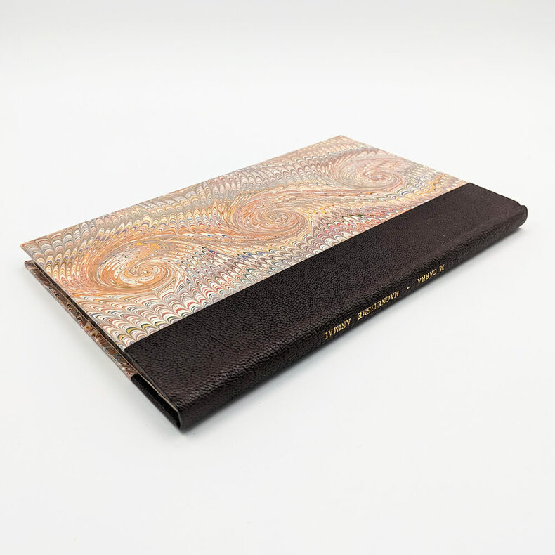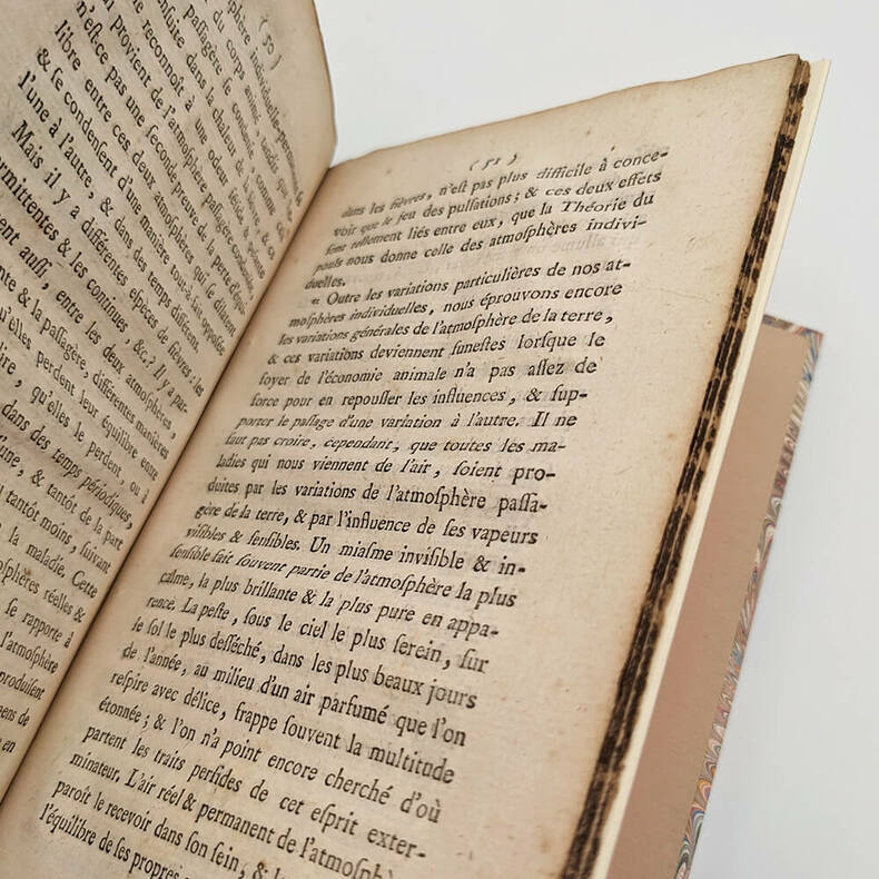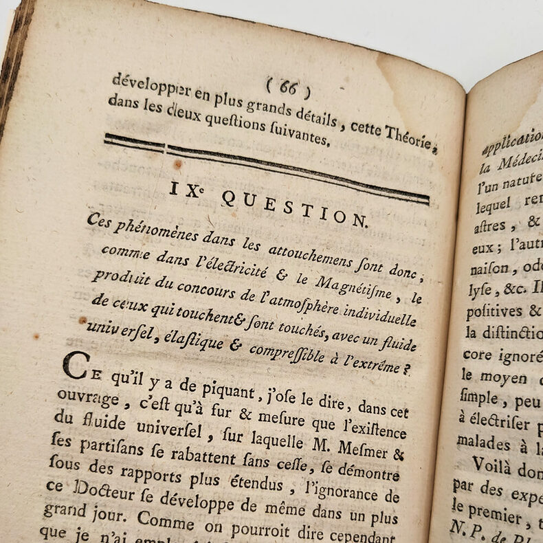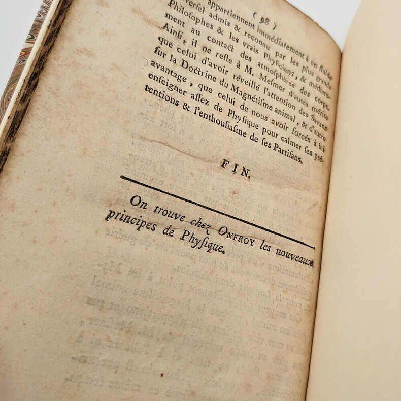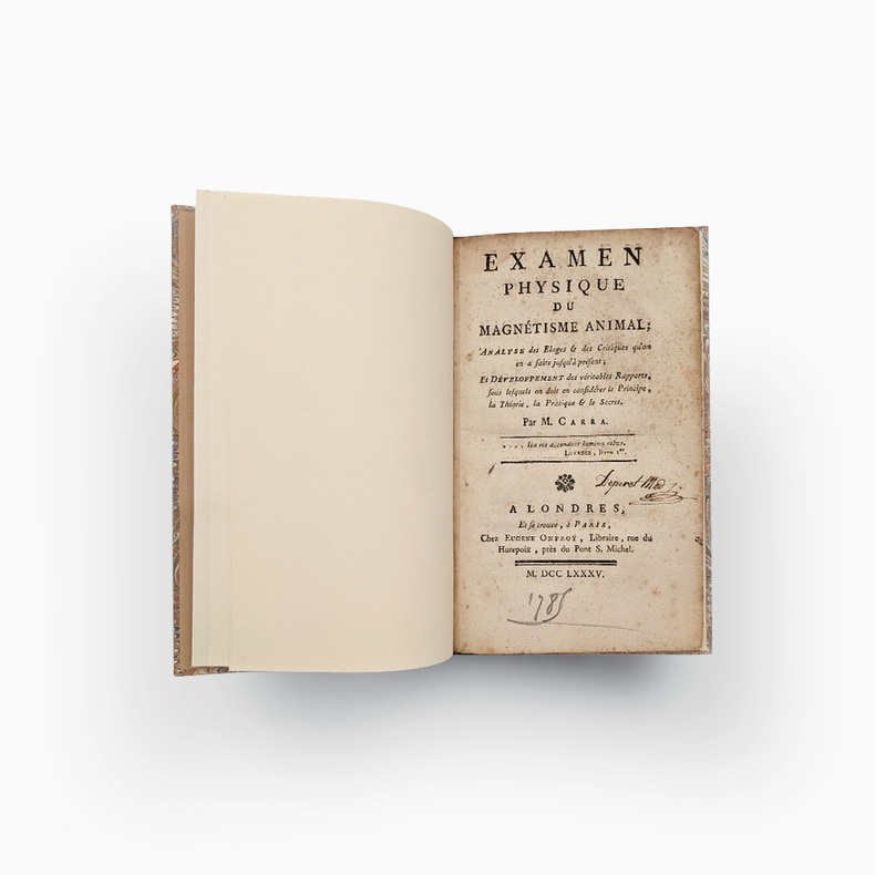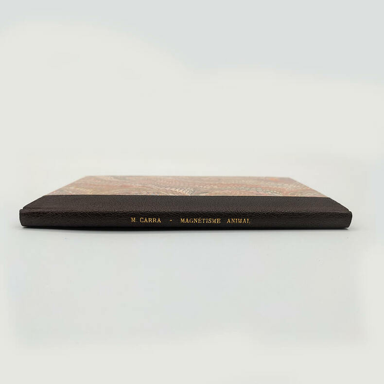 Examen Physique du Magnétisme Animal Jean-Louis CARRA (Journaliste et Révolutionnaire) Analyse des éloges et des critiques qu’on en a fait jusqu’à présent; Et Développement des véritables Rapports, sous lesquels on doit en considérer le Principe, le Théorie, la Pratique et le Secret. À Londres, et se trouve à Paris chez Eugène Onfroy, Librairie 1785. Small octavo (127x197mm). 98pp. Modern binding, dark brown half Moroccan, flat spine with gilt title, marbled paper cover, blank endpapers in non-original vellum. Autograph bookplate of Gabriel DEPERET, physician and deputy to the Legislative Assembly in 1791-1792. Very rare original edition on animal magnetism and its secrets written by a journalist, close to Voltaire and future famous revolutionary. Published under a fictitious London address, this book bears witness to the medical debates at the end of the Ancien Régime. Particularly and primarily, it revolves around "Mesmerism," a movement created by the German Franz Anton Mesmer around the idea of "animal magnetism." The theory according to which the world is governed by a kind of universal magnetic fluid, which, if harnessed, can control and cure diseases. It is important to emphasize that this book, unlike many others of the time, does not seek to denounce animal magnetism as quackery, but rather, more subtly, to find a physical reality for it. In 1785, the Faculty of Medicine and the Academy of Sciences having publicly denounced Mesmer's theories, Carra cautiously expressed his attraction to animal magnetism. "He who proves too much proves nothing. He who does not prove enough proves nothing. Therefore, one must find the right balance in order to make a definitive and irrevocable decision on any given issue." Carra. He also makes no secret of his admiration for Mesmer, calling him the greatest physicist who ever lived, and who ever will, and concludes his argument thus: Thus, Mr. Mesmer's only remaining merit is that of having awakened the attention of scholars to the Doctrine of Animal Magnetism, and no other advantage than that of having forced us to teach him enough physics to calm his pretensions and the enthusiasm of his supporters. Carra. Condition: Modern binding in perfect condition, good condition for the book, title page and Interior stains and moisture. To read : Carra, le premier « bibliothécaire national ». Stefan Lemny. 2010 https://shs.cairn.info/revue-de-la-bibliotheque-nationale-de-france-2009-2-page-50?lang=fr Biography of Jean-Louis Carra on Wikipedia: https://fr.wikipedia.org/wiki/Jean-Louis_Carra -------------------------------------- Examen Physique du Magnétisme Animal. Analyse des éloges et des critiques qu’on en a fait jusqu’à présent; Et Développement des véritables Rapports, sous lesquels on doit en considérer le Principe, le Théorie, la Pratique et le Secret. Jean-Louis CARRA (Journaliste et Révolutionnaire) À Londres, et se trouve à Paris chez Eugène Onfroy, Librairie 1785. Petit In-8 (127x197mm). 98pp. Reliure moderne, demi marocain maron foncé, dos lisse avec titre doré, plat papier marbré, gardes blanches en papier vélin non d’origine. Ex-libris autographe de Gabriel DEPERET, médecin et député à l’assemblé législative en 1791-1792. Très rare édition originale sur le magnétisme animal et ses secrets écrit par un journaliste, proche de Voltaire et futur révolutionnaire célèbre. Édité sous une adresse londonienne fictive, ce livre témoigne des débats médicaux de la fin de l’Ancien Régime. Notamment et principalement autours du "Mesmerisme" un courant crée par l'allemand Franz Anton Mesmer autours de l'idée de "magnétisme animal". Théorie selon laquelle le monde serait régi par une sorte de fluide magnétique universelle, qui, s'il est maitrisée, permet de contrôler et guérir les maladies. Il est important de souligner que ce livre, contrairement à beaucoup d'autres de l'époque, ne cherche pas dénoncer le magnétisme animal comme du charlatanisme mais plus subtilement à lui trouver une réalité physique. En 1785, la faculté de médecine et l'académie des science ayant dénoncés publiquement les théories de Mesmer, Carra expose donc prudemment son attirance pour le magnétisme animal. Qui prouve trop ne prouve rien. Qui ne prouve pas assez ne prouve rien encore. Il faut donc trouver le juste milieu des choses pour pouvoir prononcer définitivement et irrévocablement sur une question quelconque. Il ne cache pas non plus son admiration pour Mesmer le qualifiant de plus grand Physicien qui ait jamais existé, qui existera jamais et termine ainsi son argumentation : Ainsi, il ne reste à M. Mesmer d'autre mérite que celui d'avoir réveillé l'attention des Savans sur la Doctrine du Magnétisme animal, et d'autre avantage, que celui de nous avoir forcé à lui enseigner assez de Physique pour calmer ses prétentions l'enthousiasme de ses partisans. État : reliure moderne en parfaite condition, bon état pour le livre, mouillures et taches éparses sur la page de titre et à l'intérieur (cf. photos). À lire : Carra, le premier « bibliothécaire national ». Stefan Lemny. 2010 https://shs.cairn.info/revue-de-la-bibliotheque-nationale-de-france-2009-2-page-50?lang=fr Biographie de Jean-Louis Carra sur wikipedia : https://fr.wikipedia.org/wiki/Jean-Louis_Carra
