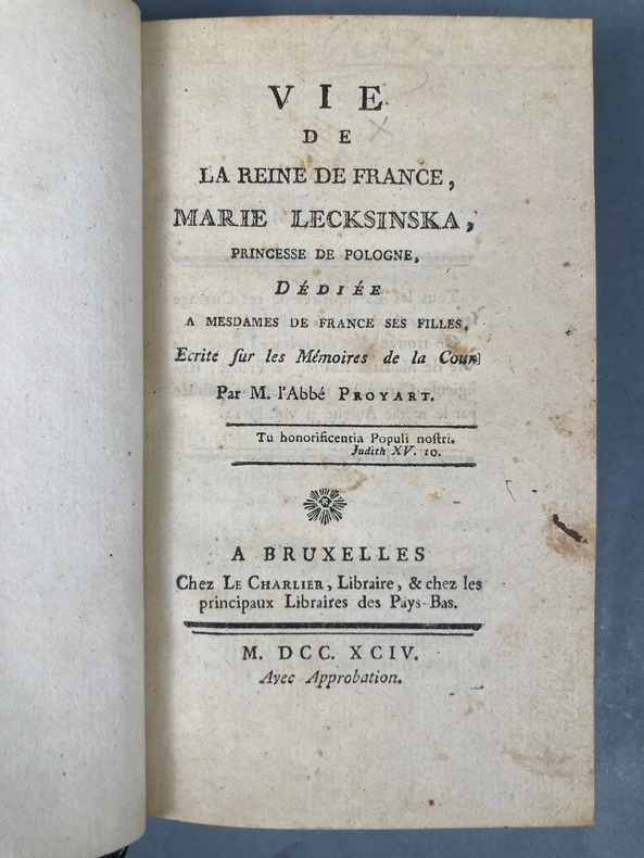 PROYART (L'abbé) - Vie de la reine de France Marie Leckzinska, princesse de Pologne. Bruxelles, Chez Le Charlier, 1794 ., in-8, IV, frontispice, 398 pp., reliure demi-veau vert bouteille du 19ème siècle à petits coins, dos à 4 nerfs, tranches jaspées. Vie de Marie Leckzinska, épouse de Louis XV et fille de Stanislas Leckzinsky, dernier duc de Lorraine.