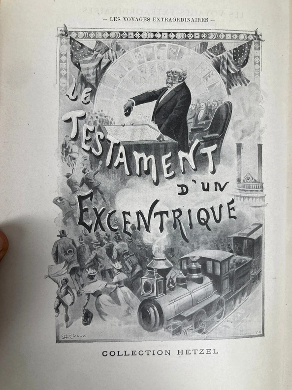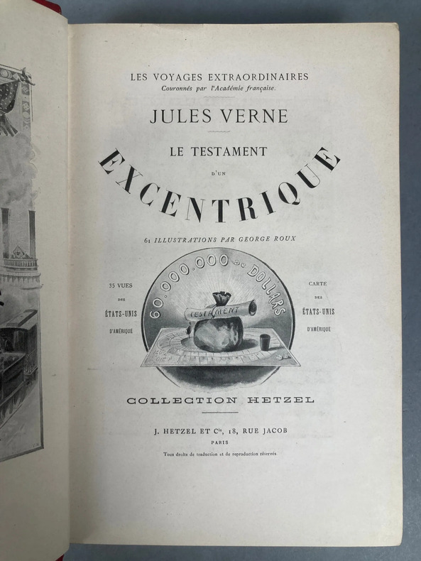 VERNE (Jules) - Le Testament d'un excentrique. Paris, Hetzel, 1899 ., in-4, 479 pp., reliure demi-maroquin rouge d'éditeur, dos orné à 4 nerfs, tranches dorées. Illustrations par George Roux. Complet de la carte des Etats-Unis. Edition originale, bel état.