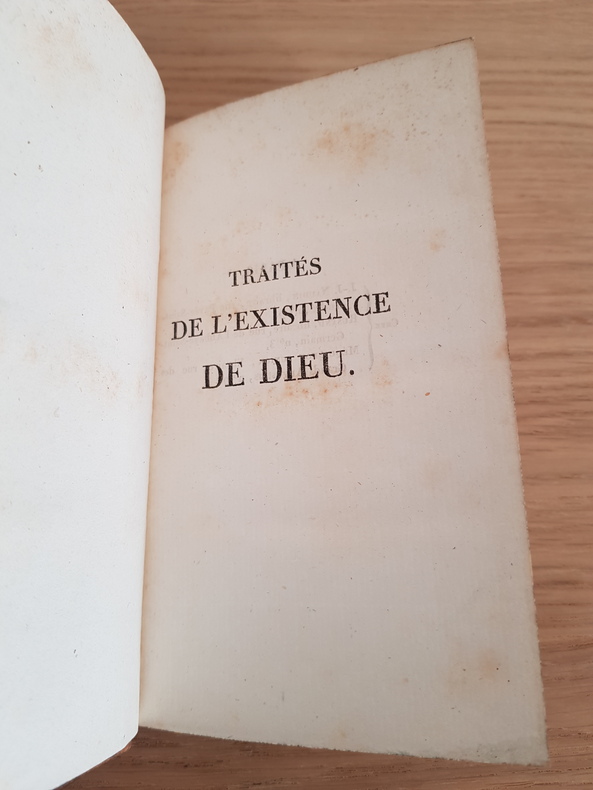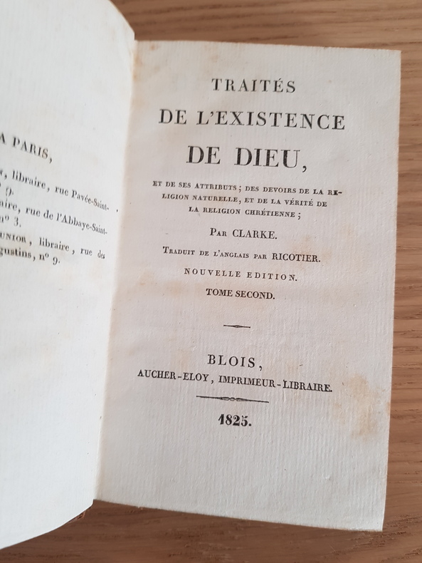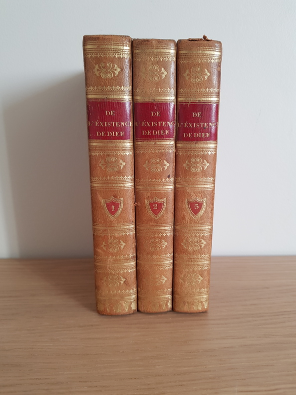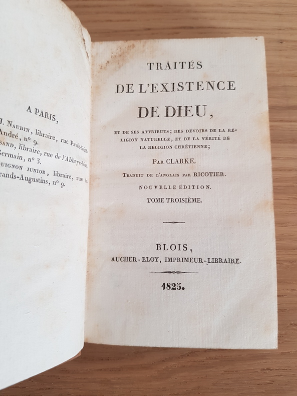 Traités de l'existence de Dieu par Samuel Clarke Traduit de l'anglais par Ricotier Aucher-Eloy, Blois, 1825 Reliure d'époque 3 volumes in-8 Bon état intérieur sauf quelques accidents sur reliure