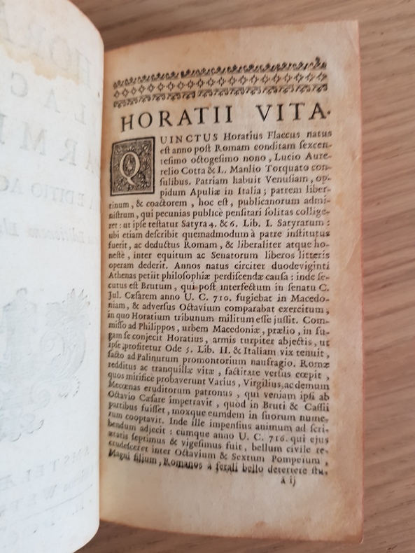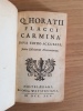 Quinti Horatii, Flacci carmina, 1725 Nova editio accurata Horace (65 av. J.-C. – 8 av. J.-C.) Langue : latin Etat moyen (rousseurs en continu), reliure en moyen état sur la tranche