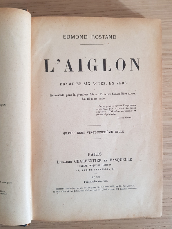 L'aiglon Edmond Rostand Paris, Charpentier et Fasquelle, 1922