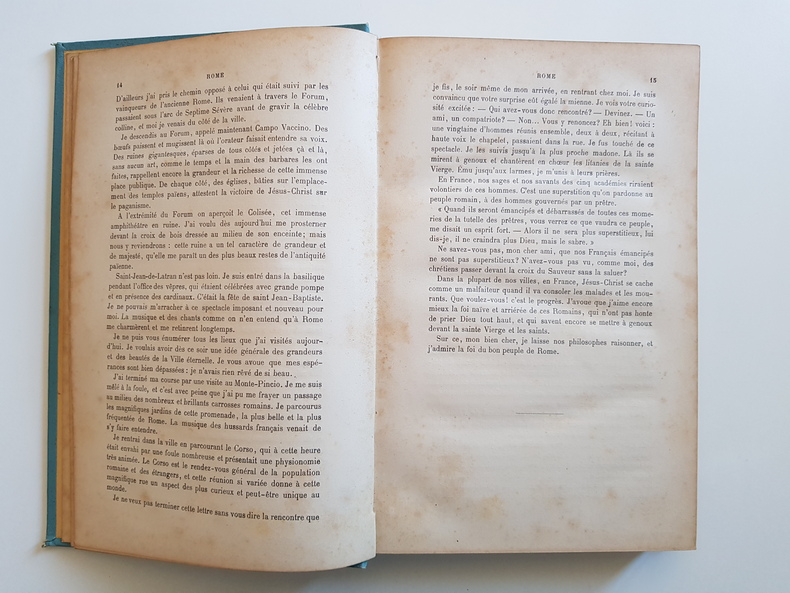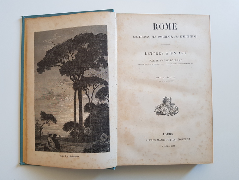 Auteur : Rolland (abbé) Titre : Rome. Ses églises, ses monuments, ses institutions. Lettres à un ami Éditeur : Tours, Alfred Mame et Fils (collection Bibliothèque des Familles) Date : 1892 (MDCCCXCII) Édition : Onzième édition, revue et augmentée Reliure : Cartonnage éditeur percaline bleue décorée or et noir, dos long orné “ROME” Format : in‑8 (env. 22 x 14 cm), 1 volume Illustrations : frontispice gravé sur bois (Jardin de la villa Borghèse); vignettes éventuelles dans le texte État : Bon état de reliure; coins et coupes frottés, coiffes légèrement écrasées. Intérieur complet, papier uniformément jauni; rousseurs marquées sur le frontispice, le titre et éparses à fortes dans l’ouvrage. Cahiers bien solidaires; sans annotations ni ex‑libris. Voir photos. Remarques : Beau cartonnage Mame “Bibliothèque des Familles”.