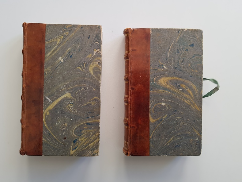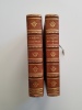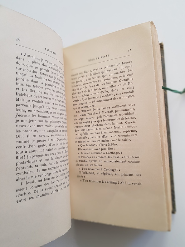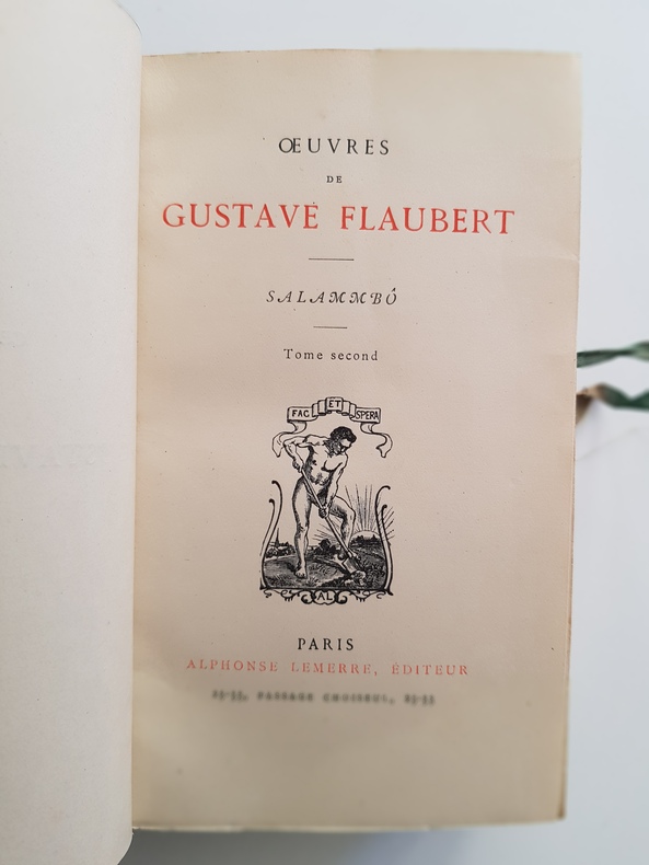 Titre : Salammbô. Œuvres de Gustave Flaubert – Tome premier et Tome second (complet en 2 volumes) Auteur : Gustave Flaubert Éditeur : Alphonse Lemerre, Éditeur Lieu : Paris, 23-33, Passage Choiseul Date : s. d. [vers 1890–1900] Format : 2 volumes in‑12 (env. 18 x 12 cm) Reliure : Demi‑basane brune d’époque, dos à faux-nerfs ornés de filets et fleurons dorés, titres « G. Flaubert — Salammbô I / II » ; plats marbrés. Signet en tissu vert conservé dans le tome II. État du livre : Bon état général. Frottements et petites épidermures aux dos, coins et coiffes émoussés, dos légèrement passés ; plats marbrés avec marques d’usage. Intérieurs propres, papier uniformément jauni avec rares rousseurs éparses, sans annotations ni manques. Reliures solides. Ensemble homogène et complet des deux tomes. Contenu / remarque : Belle édition Lemerre des Œuvres de Flaubert, non illustrée, présentant le célèbre roman historique situé à Carthage après la Première Guerre punique. Page de titre en rouge et noir avec la marque de l’éditeur. Langue : Français
