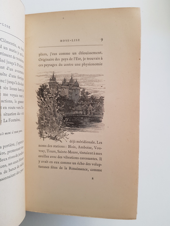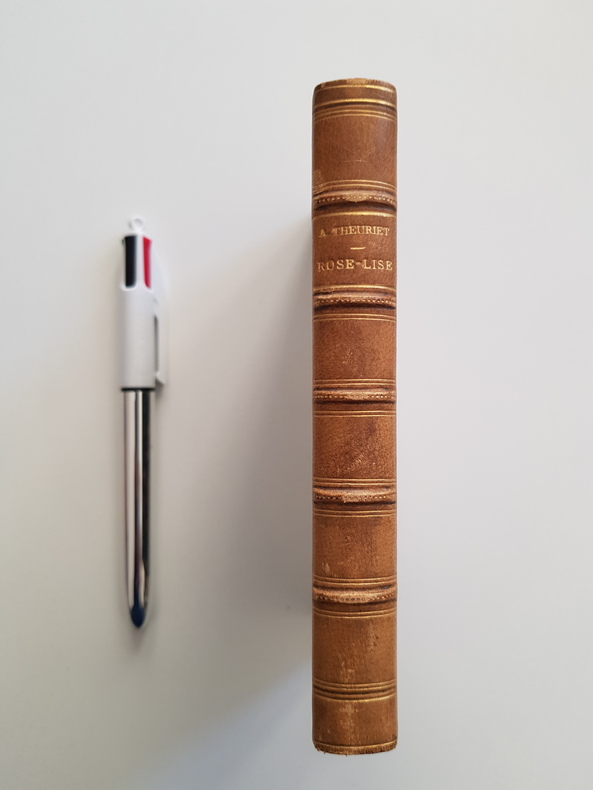 Titre : Rose-Lise (Collection Lemerre illustrée) Auteur : André Theuriet Illustrations : Myrbach, gravées par Romagnol Éditeur : Alphonse Lemerre, Éditeur Lieu : Paris, 23-31, Passage Choiseul Date : 1894 (achevé d’imprimer le 13 juillet 1894) Format : In‑12, env. 18 x 12 cm Nombreuses illustrations en noir dans le texte (vignettes, culs-de-lampe, quelques pleines pages) Reliure : Demi‑chagrin vert de l’époque, dos à nerfs orné de filets et titre dorés, plats marbrés, tranchefile, tranches lisses État du livre : Bon état. Dos uniformément passé brun, frottements d’usage aux nerfs et aux coiffes, coins émoussés. Intérieur propre, papier jauni avec rousseurs éparses surtout en début et fin d’ouvrage, cahiers bien solidaires. Belle reliure ancienne, solide et décorative. Contenu / remarque : Agréable édition illustrée de ce roman de Theuriet, dans la « Collection Lemerre illustrée », avec pages de titre imprimées en rouge et noir et les délicates gravures de Myrbach sur bois par Romagnol.