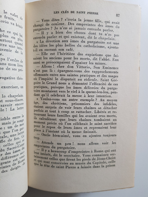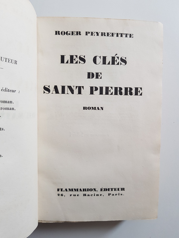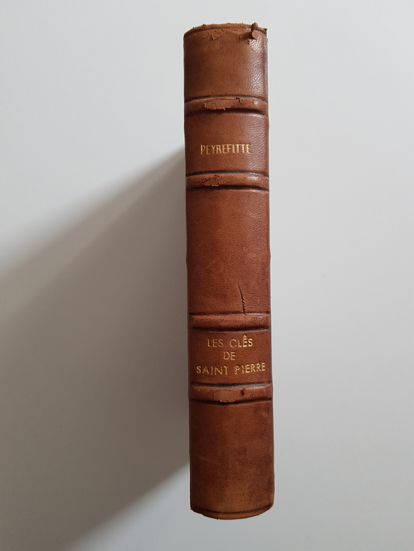 Titre : Les Clés de Saint Pierre Auteur : Roger Peyrefitte Éditeur : Flammarion, Éditeur Lieu : Paris, 26, rue Racine Date : 1955 Édition : Édition originale numérotée. Exemplaire n° 1351 sur papier Alfa (colophon), faisant partie du tirage constituant l’édition originale. Format : In‑12, env. 19 x 12 cm Reliure : Demi‑chagrin brun à coins, dos à faux‑nerfs, auteur et titre dorés. Plats recouverts de papier marbré. Couvertures d’origine non conservées. État du livre : Bon état d’usage. Frottements marqués au dos, coiffe supérieure avec petit manque, mors et nerfs un peu épidermés ; plats marbrés tachés/décolorés par endroits. Intérieur propre et bien serré, papier frais, sans annotations. Exemplaire solide. Contenu / remarque : Roman célèbre de Peyrefitte sur les coulisses du Vatican. Belle reliure ancienne et exemplaire de l’édition originale au numéro. Langue : Français