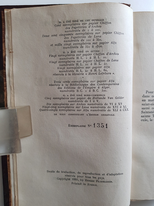 Paris Flammarion 1955 in 12 (18,5x12) 1 fort volume broché, 436 pages [1]. Edition originale, celui-ci un des 100 exemplaires numérotés sur papier d'arches (premier grand papier). Très bel exemplaire ( Photographies sur demande / We can send pictures of this book on simple request )