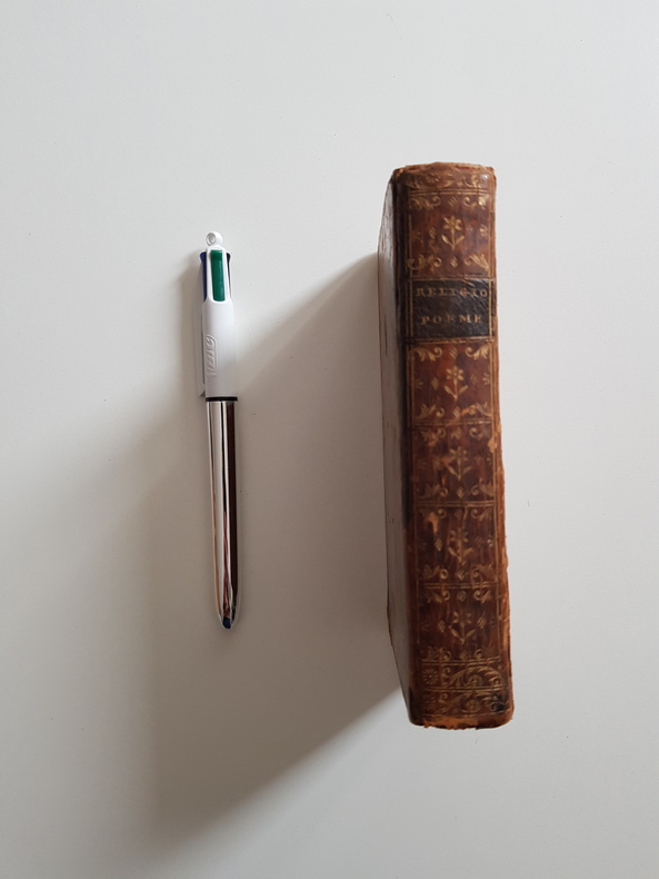 Paris, rue Saint Jean de Beauvais, Chez Jean Desaint 1777 In-12 relié plein veau 16 cm sur 9,5. 3ff-383 pages. Dos lisse orné de caissons, fleurons et lettrage dorés. Pièce de titre en maroquin rouge, angle inférieur manquant. Tranches rouges. filet doré sur coupes, petits fleurons et culs-de-lampe dans le texte. Dos frotté avec petits manques, quelques épidermures sur plats. Premier mors intérieur fendu, gouttière irrégulière, pages 29-39 partiellement déliées, quelques brunissures sur les trois dernières pages et dernière page de garde collée au contreplat. Assez bon état d’occasion.