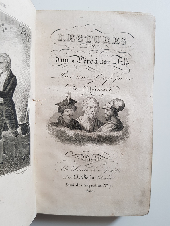 Auteur : Anonyme (par un Professeur de l’Université) Titre : Lectures d’un Père à son Fils Éditeur : Paris, À la Librairie de la Jeunesse, chez D. Belin, quai des Augustins, n° 47 Année : 1833 Édition : Deuxième édition Reliure : Plein veau brun moucheté, dos lisse orné de filets et fers dorés, titre doré Format : In‑12, env. 15 x 10 cm Langue : Français État : Assez bon. Frottements marqués au cuir, coins émoussés, coiffes usées avec petit manque en tête, mors solides. Intérieur globalement frais avec quelques rousseurs éparses et menues fentes marginales sans manque Description : Ouvrage d’éducation destiné à la jeunesse, précédé d’un avis “Aux parens et aux instituteurs”. Beau frontispice gravé et titre gravé orné, impression soignée. Édition Belin, maison spécialisée dans les livres pour la jeunesse au début du XIXe siècle