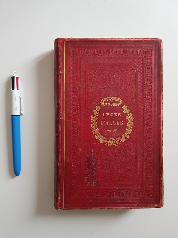 Titre : Études de littérature ancienne & étrangère Auteur : Villemain, Abel‑François Éditeur : Didier, libraire‑éditeur Lieu d’édition : Paris Année : 1847 Édition : Nouvelle édition, revue, corrigée et augmentée Reliure : Plein chagrin rouge de prix, dos à nerfs orné de filets et caissons dorés, titre doré, plats richement encadrés à froid avec lauriers dorés « Lycée d’Alger » au premier plat, gardes marbrées Langue : Français État du livre : Bon état d’usage. Frottements et petites épidermures sur les plats et le dos, coins émoussés, coiffes légèrement usées. Intérieur avec rousseurs éparses et une tache d’humidité marginale ancienne sur la page de titre ; ensemble solide et propre Sujet(s) : Critique littéraire ; Littérature antique ; Littératures étrangères ; XIXe siècle Notes : Belle reliure de prix du Lycée d’Alger. Adresse de l’éditeur « 35, quai des Augustins »