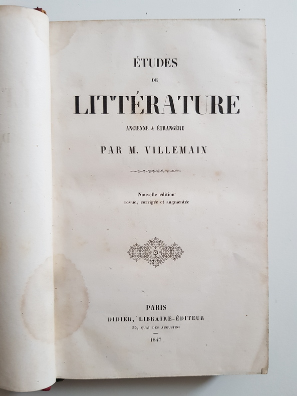 Nouvelle édition revue, corrigée et augmentée. Hérodote et la manière de la traduire. Du poëme de Lucrèce sur la nature des choses. Etudes sur Cicéron, Plutarque, Lucain. De Tibère. De la corruption des lettres romaines. Essai sur les romans grecs. Vie des principaux poëtes anglais : Shakspeare - Milton - Pope - Wicherley - Young - Byron. Le faux-titre porte Oeuvres de M. Villemain. Etudes de Littérature ancienne et étrangère. Quelques pâles rousseurs, dos passé. Vicaire, VII, 1086.