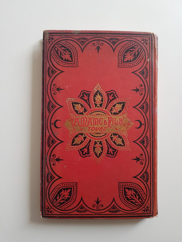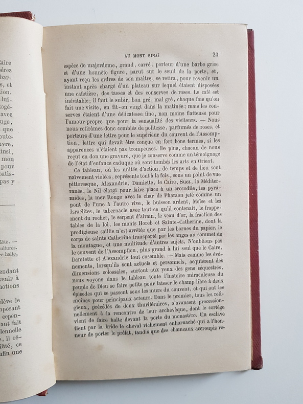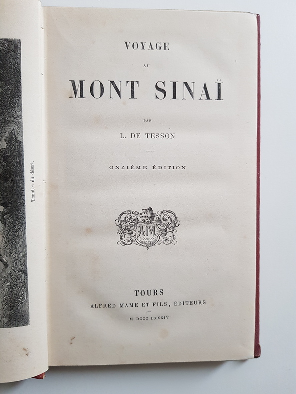 Titre : Voyage au Mont Sinaï Auteur : De Tesson L. Éditeur : Alfred Mame et Fils Lieu : Tours Date : 1884 Édition : Onzième édition Langue : Français Reliure : Cartonnage éditeur en percaline rouge, riche décor noir et or au premier plat et au dos, second plat avec médaillon doré « A. Mame & Fils – Tours ». Dos orné, tranches non dorées. Illustrations : Frontispice gravé en noir (au moins). État du livre : Bon état d’ensemble. Cartonnage bien conservé ; petits frottements d’usage aux arêtes, coins légèrement émoussés ; coiffes frottées avec petit manque en tête ; une trace/blanchissure au premier plat ; dos un peu passé mais lisible et décoratif ; intérieur propre avec rousseurs éparses, sans manque ni déchirure apparente. Reliure solide. Dimensions : env. 18 x 12 cm Sujet/notice : Récit de voyage au mont Sinaï et en Égypte, avec passage par le monastère de Sainte-Catherine ; édition illustrée publiée par Mame, dans un élégant cartonnage décoratif de la maison tourangelle.