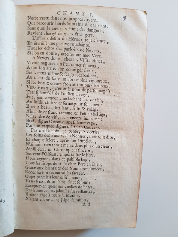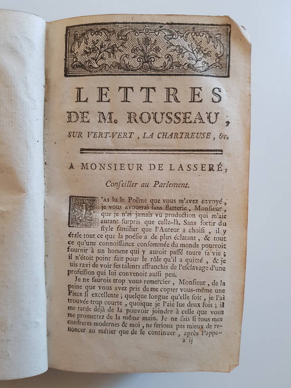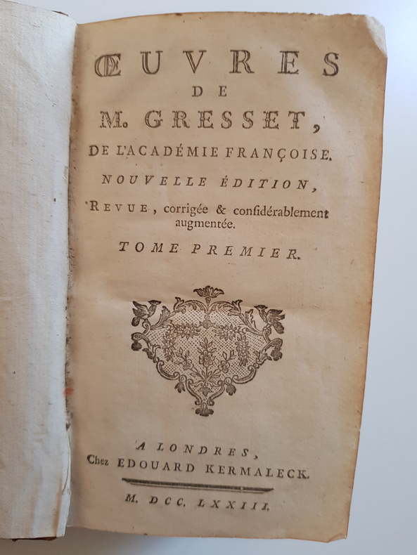 Titre : Oeuvres de M. Gresset… Nouvelle édition, revue, corrigée et considérablement augmentée. Tome premier Auteur : Gresset Jean-Baptiste-Louis Lieu : Londres Éditeur : Edouard Kermaleck Date : 1773 Édition : Nouvelle édition Tome/ensemble : Tome premier seul Langue : Français Format : in-12 Reliure : Pleine basane d'époque, dos orné à petits fers et nerfs saillants, filets et fleurons dorés, pièce de titre manquante État du livre : Moyen à passable. Reliure très frottée avec importants manques au dos (coiffes abîmées, écaillures, gerces), mors fendus et fragiles, coins émoussés. Gardes anciennes avec traces de renfort. Intérieur globalement propre pour l'âge, papier uniformément bruni, rousseurs éparses, quelques plis et petites taches marginales. Titre avec encadrement et fleuron typographiques, bandeaux et lettrines gravés. Provenance : Ancienne inscription manuscrite à l'encre sur la garde, datée 1779. Contenu notable : Contient notamment Vert-Vert, La Chartreuse, et des Lettres de M. Rousseau sur Vert-Vert et La Chartreuse (adressées à M. de Lasseré). Remarques : Belle édition londonienne du XVIIIe siècle des œuvres de Gresset, ici le premier volume seul.