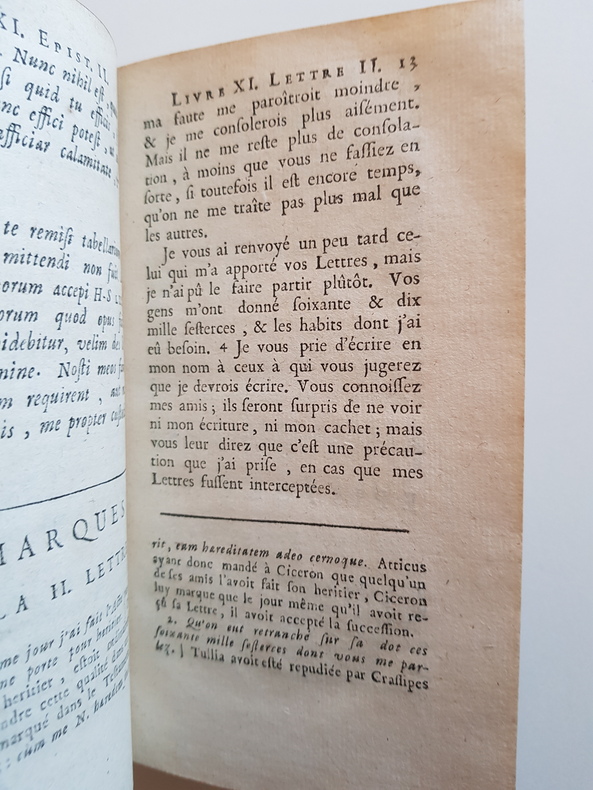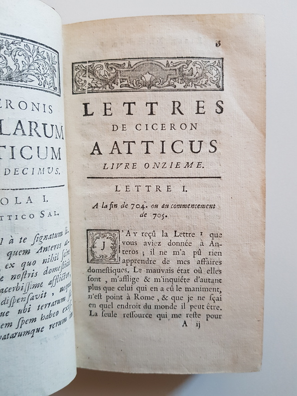 Titre : Lettres de Cicéron à Atticus - Livre onzième. Tome V Auteur : Cicéron Marcus Tullius Éditeur : s.l. - s.n. Date d'édition : s.d. [XVIIIe siècle] Langue : français et latin Reliure : plein veau brun d'époque, dos à 5 nerfs orné de caissons et fleurons dorés, titre et tomaison dorés. Tranches et gardes d'époque. État du livre : moyen. Frottements importants aux plats, coins émoussés avec petits manques de cuir, coiffes usées avec petit manque en tête et en pied, un caisson du dos frotté avec épidermure. Mors localement craquelés mais reliure tenue. Intérieur propre dans l'ensemble, papier uniformément jauni, rares rousseurs et petites taches, marges fraîches. Aucun manque de texte constaté. Contenu : Tome V seul des Lettres de Cicéron à Atticus, contenant le Livre XI. Édition bilingue avec texte latin et traduction française, notes en bas de page. Le volume s'ouvre sur le titre propre « Lettres de Cicéron à Atticus - Livre onzième », avec indication chronologique « À la fin de 704 ou au commencement de 705 », correspondant à la fin de 50 - début 49 av. J.-C. Particularités d'exemplaire : volume isolé, sans page de titre générale de la série - tel que conservé. Exemplaire de lecture solide malgré les défauts d'usage. Format : in-12 (format ancien)
