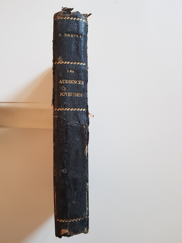 Titre : Les Audiences joyeuses Auteur : Drault Jean Illustrateur : Guydo Éditeur : Maison A. Mame et Fils Lieu d'édition : Tours Date d'édition : s.d. [fin XIXe - début XXe siècle] Langue : français Reliure : demi-basane noire de l'époque, dos lisse orné de filets dorés et titre doré, plats de papier marbré État du livre : acceptable. Forts frottements aux plats, coins émoussés, coupes et coiffes usées avec petits manques, mors craquelés et début d'ouverture en tête et en queue. Charnière avant consolidée par une bande ancienne à l'intérieur. Quelques déchirures minimes en marges, papier bruni, rousseurs et taches éparses, rares marques au crayon/à l'encre sur quelques pages. Ensemble complet de lecture, reliure encore fonctionnelle malgré l'usure. Contenu : Recueil d'anecdotes et scènes d'audiences pleines d'esprit, pastiches de comptes rendus judiciaires et dialogues au tribunal. Nombreuses vignettes et dessins humoristiques de Guydo dans le texte. Titres rencontrés dans le volume notamment Une affaire de faux, L'article 953, La lyre de Lamartine, etc. Particularités d'exemplaire : Volume illustré dans une reliure de l'époque, sans jaquette comme publié. Traces d'usage conformes à un exemplaire populaire lu. Format : in-12 (format ancien)
