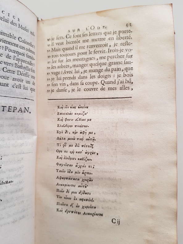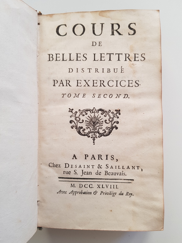 Titre : Cours de belles lettres distribué par exercices. Tome second Auteur : Batteux Charles Lieu : Paris Éditeur : Desaint & Saillant Date : 1748 Tome : II seul Langue : français, avec citations en grec Format : in-12 (env. 16,5 x 10 cm) Reliure : plein veau marbré d'époque, dos à nerfs orné de compartiments fleuronnés dorés, pièce de titre et de tomaison en maroquin rouge, tranches rouges État : reliure frottée et asséchée, coiffes abîmées, mors craquelés avec petits débuts de fente, coins émoussés. Intérieur frais dans l'ensemble, rousseurs éparses, mouillure claire en marge supérieure sur plusieurs feuillets, belles bandeaux et lettrines gravés, passages en caractères grecs. Description : Volume pédagogique de l'abbé Batteux, consacré aux exercices de rhétorique et de poétique. Ce tome comprend notamment l'Exercice sur l'ode, avec exposé des règles de la poésie lyrique et exemples en français et en grec. Belle impression parisienne ornée de bandeaux, fleurons et lettrines. Exemplaire du seul tome II.