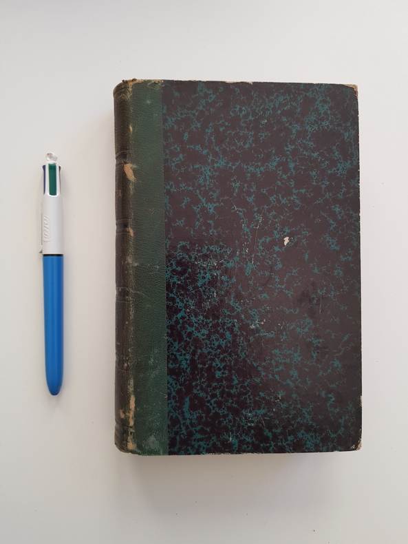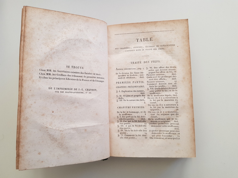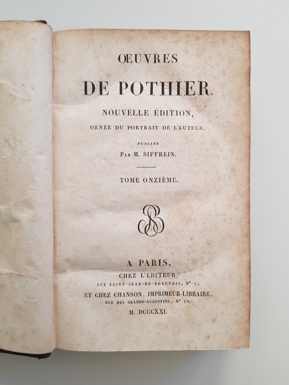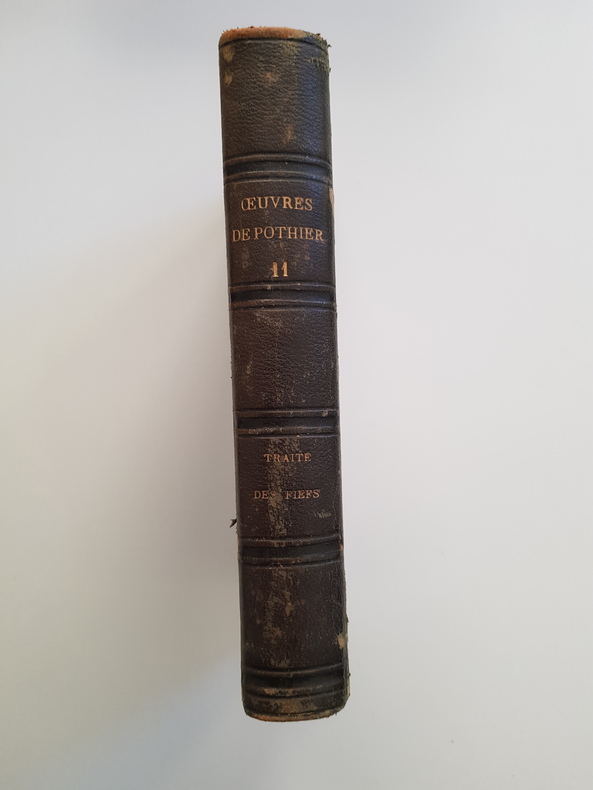 Titre : Oeuvres de Pothier. Nouvelle édition, ornée du portrait de l'auteur, publiée par M. Siffrein. Tome onzième - Traité des fiefs Auteur : Pothier Robert-Joseph Lieu : Paris Éditeur : Chez l'éditeur, rue Saint-Jean-de-Beauvais n° 15, et chez Chanson, imprimeur-libraire, rue des Grands-Augustins n° 10 Date : 1821 Tome : XI seul (Traité des fiefs) Langue : français Format : in-8 (env. 22 x 14 cm) Reliure : demi-basane verte d'époque, dos lisse orné de filets dorés et titre doré, plats de papier marbré, tranches mouchetées État : reliure frottée avec usures aux coiffes et aux coins, mors légèrement craquelés par endroits ; intérieur complet du tome, rousseurs éparses et brunissures surtout aux premiers/derniers feuillets, petites auréoles claires en tête, papier solide Description : Onzième volume des Œuvres de Pothier, renfermant le Traité des fiefs. Édition de 1821 publiée par M. Siffrein, sortie de l'imprimerie J.-L. Chanson. Exposé systématique du droit féodal français (définition des fiefs, nature de la foi et hommage, droits et devoirs du vassal et du seigneur, commise, aveux, mutations, etc.). Exemplaire en reliure d'époque, bien conservé malgré les traces d'usage.