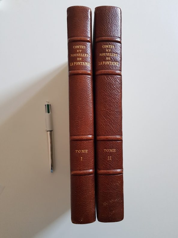 Paris A. Le Vasseur et Cie, éditeurs 1894 in 12 (17x12) 2 volumes reliures à la bradel demi maroquin rouge de l'époque, dos lisses ornés d'un grand fer doré de style "romantique", têtes dorées, papier vergé. Tome 1: Contes et nouvelles en vers de Jean de la Fontaine, portrait en frontispice, IV et 268 pages. Jean de La Fontaine, 1621-1695. Tome 2: Recueil des meilleurs contes en vers, Contes et nouvelles en vers par Grécourt, Saint-Lambert, Champfort, Piron, Dorat, La Monnoye et François de Neufchâteau, 210 pages. Collection ''Les Conteurs galants des XVIIe et XVIIIe siècles''. Edition illustrée de vignettes en noir et blanc gravées par Duplessis-Bertaux. Bel exemplaire ( Photographies sur demande / We can send pictures of this book on simple request )