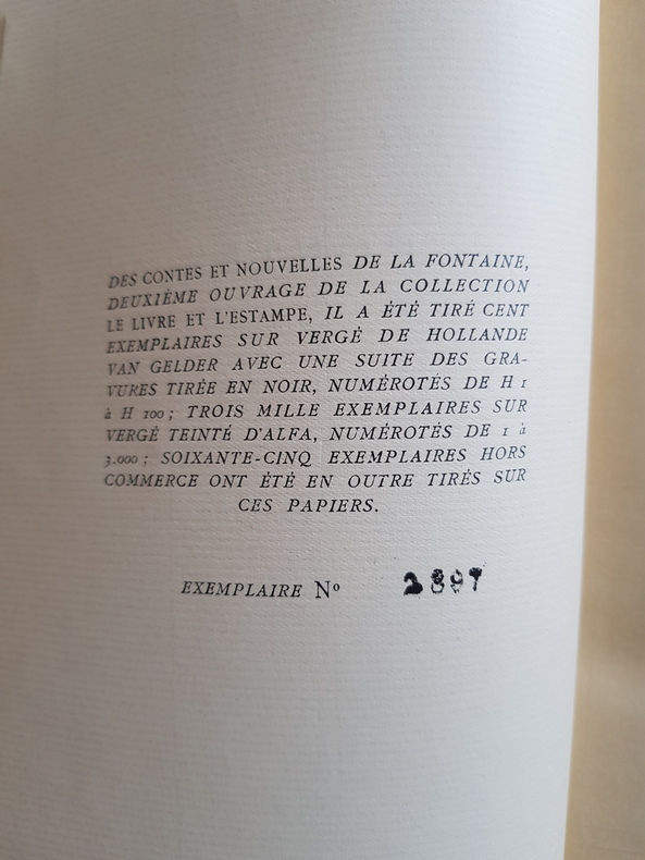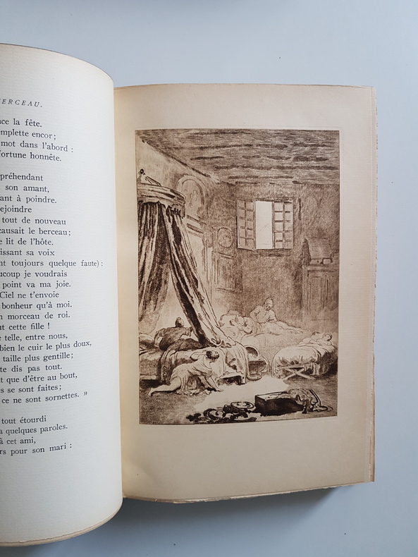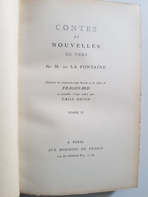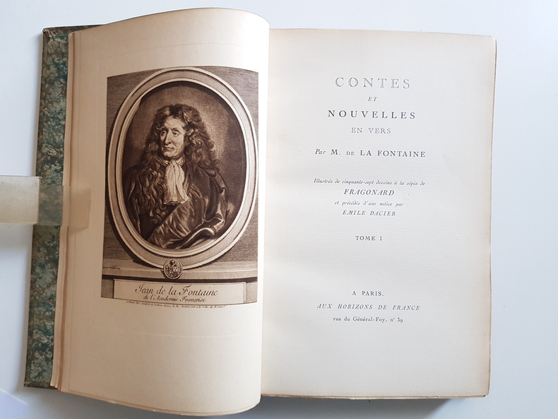 Titre : Contes et nouvelles en vers Auteur : La Fontaine, Jean de Contributeurs : Fragonard Jean-Honoré - 57 dessins à la sépia, Dacier Émile - notice Éditeur : Aux Horizons de France Lieu et date : Paris, s.d. [vers 1928] Édition : Collection Le Livre et l’Estampe - tirage limité Ensemble : 2 tomes reliés - complet Reliure : Demi-chagrin brun - dos à nerfs, titres dorés, plats marbrés Format : in-4 - 27 x 19 cm Langue : français Illustrations : 57 planches en sépia d’après Fragonard dont un portrait en frontispice, ornements typographiques Tirage : exemplaire numéroté 2897 sur 3000 sur vergé teinté d’alfa Contenu : Texte intégral des Contes et nouvelles en vers, précédé d’une notice par Émile Dacier État du livre : Bon état - reliures solides avec légers frottements aux mors et aux coiffes, rousseurs et brunissures éparses aux premières et dernières pages, intérieur propre