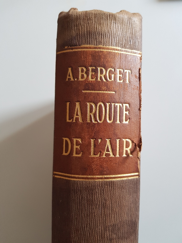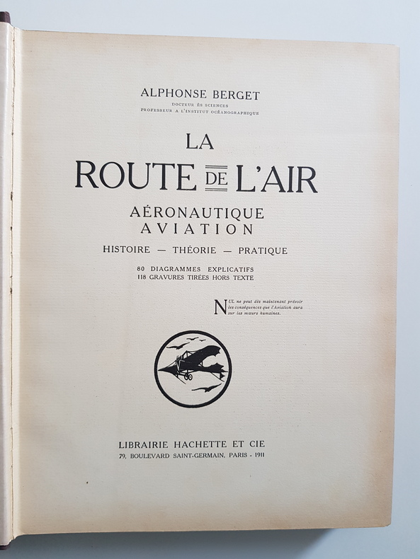 Titre : La Route de l’Air - Aéronautique Aviation - Histoire - Théorie - Pratique Auteur : Berget Alphonse Éditeur : Librairie Hachette et Cie Lieu : Paris Date : 1911 Langue : Français Reliure : Demi-basane brune d’époque, dos lisse titré et orné de filets dorés, plats de papier marbré. Grand in-4. État : Bon exemplaire d’usage. Dos patiné avec petit manque localisé au cuir et fines fentes au mors, coiffes émoussées, coins et arêtes frottés. Intérieur propre, papier légèrement jauni, rares rousseurs marginales. Solide. Illustrations : 80 diagrammes explicatifs dans le texte - 118 gravures tirées hors texte, nombreuses photographies (dont « Le grand jour de Blériot : Calais-Douvres, 25 juillet 1909 »). Contenu : Panorama complet et très illustré de l’aéronautique au début du XXe siècle couvrant dirigeables et aéroplanes - histoire, principes et théorie du vol, matériaux et motorisation, performances, records et perspectives. Préface programmatique de l’auteur présentant l’ouvrage comme une introduction claire à l’étude de l’aéronautique. Format : Grand in-4