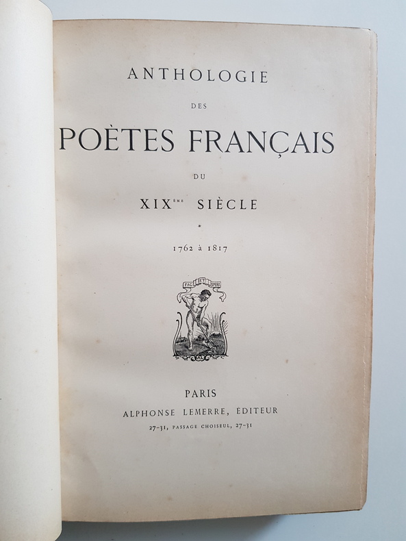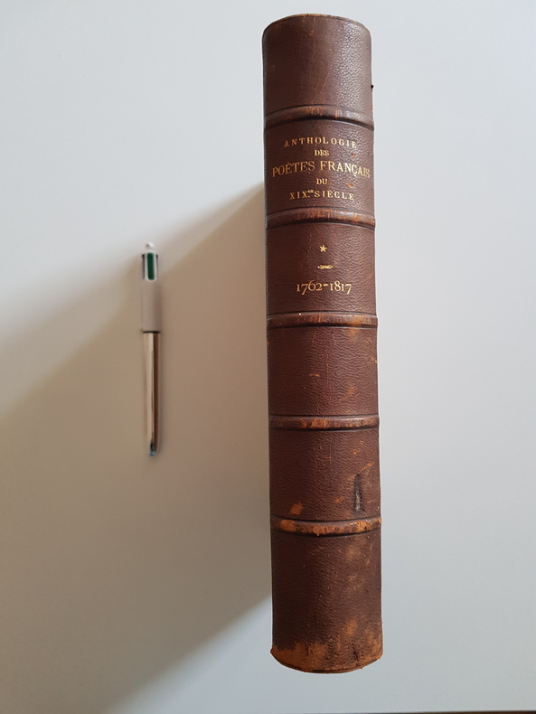 Titre : Anthologie des poètes français du XIXe siècle - 1762 à 1817 Auteur : Lemerre Alphonse ? Éditeur : Alphonse Lemerre Lieu : Paris Date : 1887 Langue : Français Reliure : Demi-chagrin brun à coins, dos à nerfs titré et orné à l’or, plats de papier marbré. In-8. État : Bon exemplaire. Frottements et petites épidermures au dos et aux coins, coiffe inférieure usée, quelques traces d’usage aux plats. Intérieur propre dans l’ensemble, papier jauni, rousseurs éparses. Solide. Particularités : Achevé d’imprimer le 1er juin 1887. Vignette de titre et ornements typographiques. Volume couvrant la période 1762-1817 avec notices et pièces choisies (ex. Chateaubriand). Contenu : Choix représentatif de la poésie française aux débuts du XIXe siècle - transition fin XVIIIe et romantisme naissant, notices biographiques et critiques, textes en vers. Format : In-8