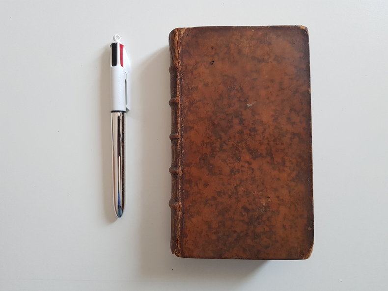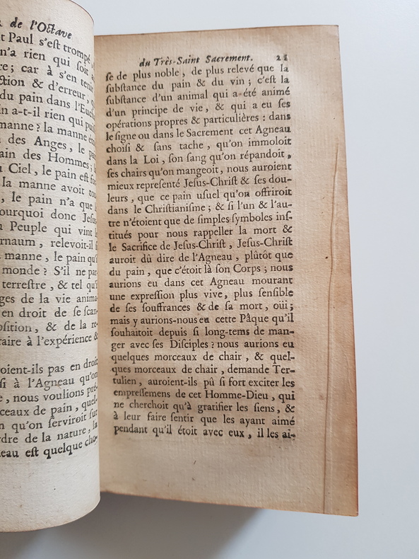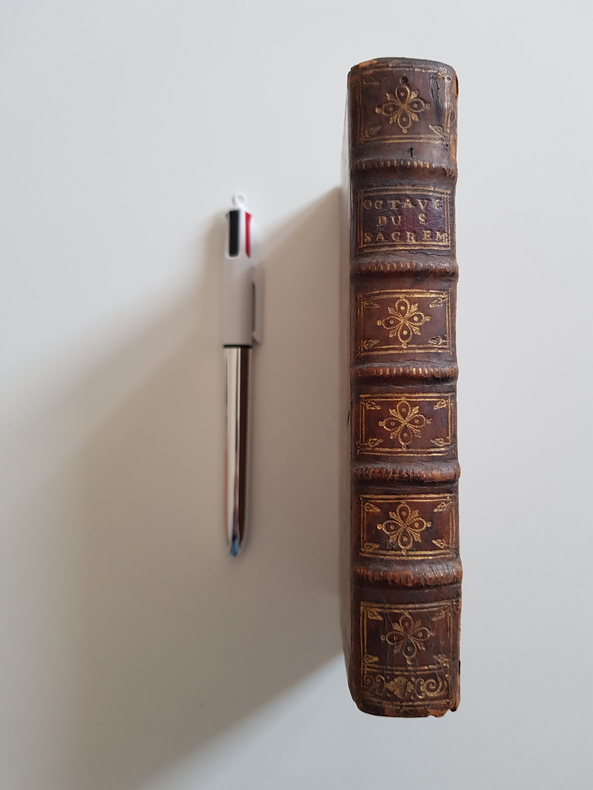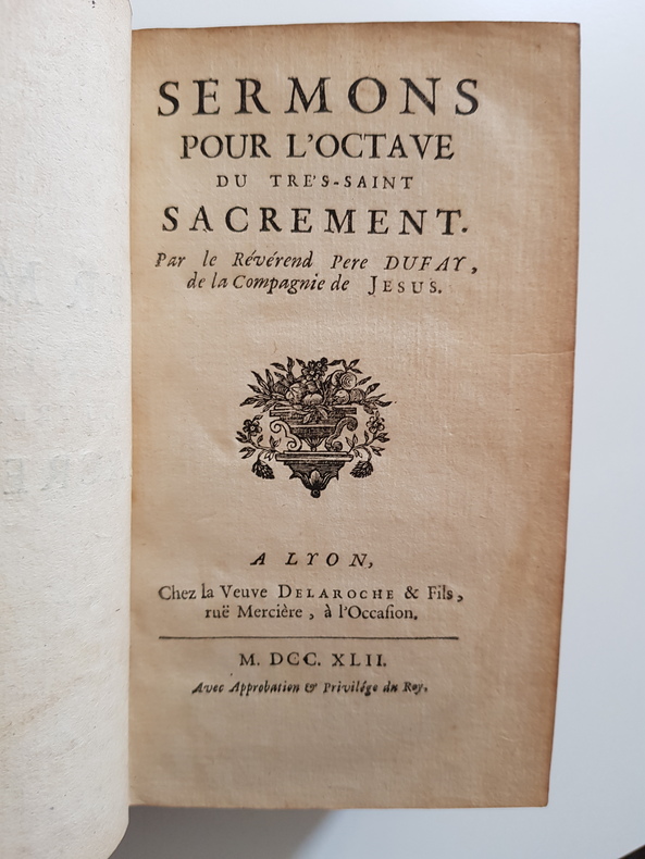 Titre : Sermons pour l'Octave du Très-Saint Sacrement Auteur : Dufat, Révérend Père Lieu d'édition : Lyon Éditeur : Veuve Delaroche & Fils, ruë Mercière, à l'Occasion Date : 1742 Format : in-12 Dimensions : env. 17 x 10 cm Langue : français Reliure : plein veau marbré d'époque, dos à 5 nerfs orné de fleurons et filets dorés, pièce de titre « Octave du S. Sacrem. », tranches anciennes État du livre : bon exemplaire d'époque, plats frottés, coins émoussés, coiffes usées avec petit manque en tête, débuts de fentes aux mors en tête, intérieur uniformément bruni avec quelques rousseurs et légères taches marginales, papier sain et texte bien lisible Particularités : page de titre ornée d'un fleuron typographique, mention « Avec Approbation & Privilège du Roy », impression lyonnaise de 1742 par la Veuve Delaroche & Fils Contenu : série de sermons jésuites dédiés à l'Octave du Très‑Saint Sacrement, prêches sur l'Eucharistie et la dévotion au Saint‑Sacrement