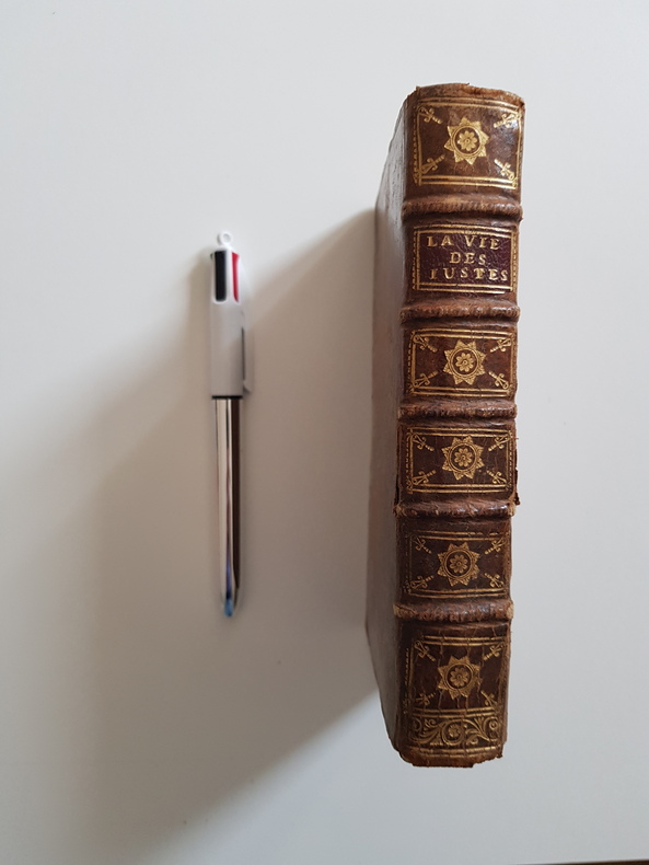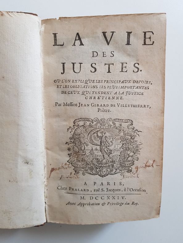 Titre : La vie des justes Auteur : Girard de Villethierry Jean Sous-titre : Où l'on explique les principaux devoirs, et les obligations les plus importantes de ceux qui tendent à la justice chrétienne Lieu d'édition : Paris Éditeur : Chez Pralard, rue S. Jacques, à l'Occasion Date : 1724 Format : In-12 - env. 16 x 10 cm Reliure : Plein veau d'époque - dos à 5 nerfs orné de caissons fleuronnés et filets dorés, pièce de titre en maroquin rouge « La vie des justes » Illustrations : Vignette gravée au titre, bandeaux et lettrines Langue : Français État du livre : Bon exemplaire d'usage - plats frottés, coins émoussés, coiffes avec petits manques, mors frottés, quelques petites fentes superficielles, intérieur propre avec rousseurs et brunissures éparses, ancienne note manuscrite au bas du titre, reliure solide Description : Édition parisienne du traité de spiritualité de Jean Girard de Villethierry, prêtre, exposant les devoirs et obligations de la vie chrétienne. Page de titre datée 1724 avec mention « Avec Approbation & Privilège du Roy ». Jolie vignette gravée au titre. Joli dos orné d'époque