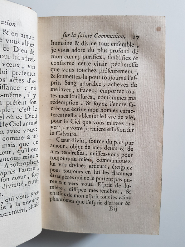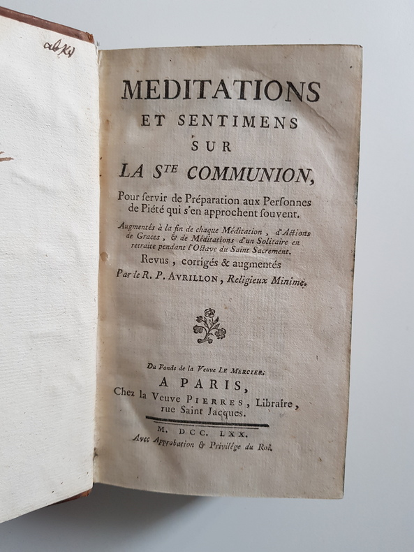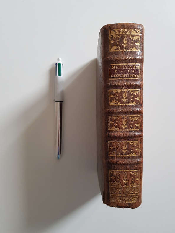 Titre : Méditations et sentimens sur la Ste Communion Auteur : Avrillon, Père Édition : Revue, corrigée et augmentée Lieu d'édition : Paris Éditeur : Veuve Pierres, du fonds de la Veuve Le Mercier Date : 1770 Langue : Français Format : In-12 - env. 15 x 9 cm Reliure : Plein veau brun d'époque - dos à nerfs orné de caissons et fleurons dorés, pièce de titre « Méditations sur la Communion » - tranches mouchetées Etat du livre : Bon état - coins émoussés, coiffes frottées avec petit manque en pied, mors légèrement frottés mais reliure solide - plats un peu épidermés - intérieur propre avec quelques rousseurs et brunissures éparses, rares piqûres, très petite note ancienne à l'angle du feuillet de garde - bon exemplaire Titre complet tel que l'ouvrage l'annonce : « Méditations et sentimens sur la Ste Communion, pour servir de Préparation aux personnes de piété qui s'en approchent souvent. Augmentées à la fin de chaque Méditation, d'Actions de Grâces, & de Méditations d'un Solitaire en retraite pendant l'Octave du Saint Sacrement. Revus, corrigés & augmentés par le R. P. Avrillon, Religieux Minime. » Remarques : édition parisienne avec approbation et privilège du Roi