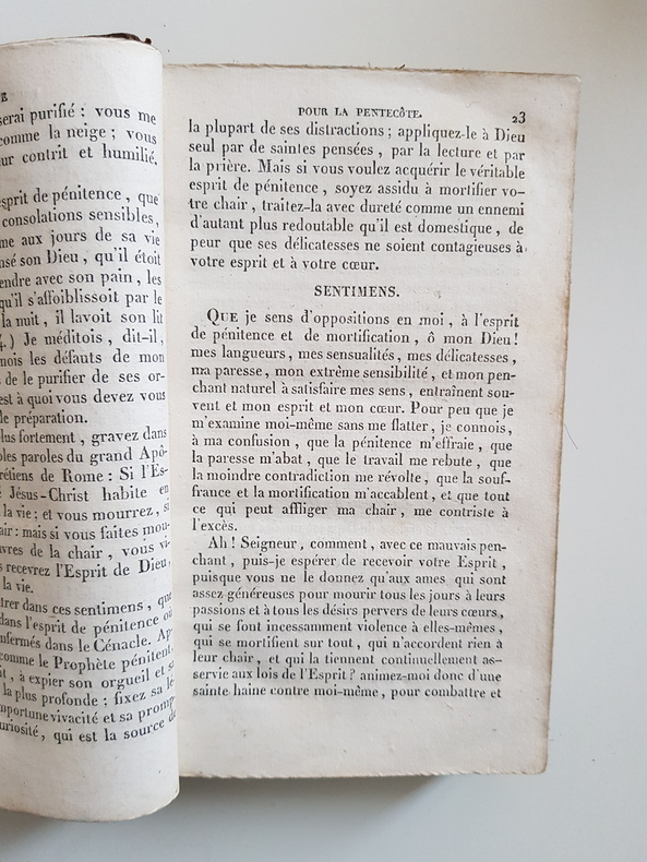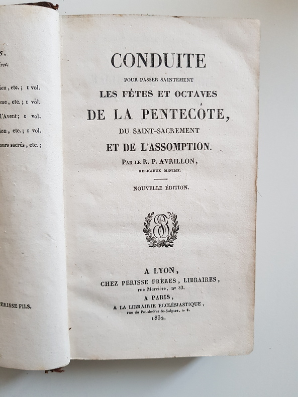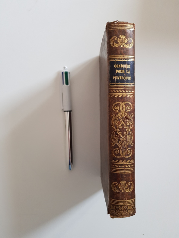 Titre : Conduite pour passer saintement les fêtes et octaves de la Pentecôte, du Saint-Sacrement et de l'Assomption Auteur : Avrillon R. P. Lieu d'édition : Lyon et Paris Éditeur : Perisse Frères - Librairie ecclésiastique Date : 1832 Format : In-12 - env. 18 x 11 cm Reliure : Plein veau marbré d'époque - dos lisse orné de roulettes et motifs dorés, pièce de titre en maroquin noir « Conduite pour la Pentecôte », tranches mouchetées Illustrations : Vignette typographique au titre Langue : Français État du livre : Bon état d'usage - plats frottés et tachetés, coins émoussés, coiffes usées avec petit manque en tête, mors et charnières frottés mais solides, papier légèrement bruni avec rares rousseurs, ensemble bien conservé Description : Guide de piété du religieux minime Avrillon pour célébrer la Pentecôte, le Saint-Sacrement et l'Assomption, proposant exercices, prières et méditations pour les fêtes et leurs octaves. Impression conjointe Lyon (Perisse Frères) et Paris (Librairie ecclésiastique), datée 1832