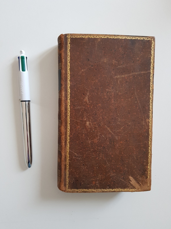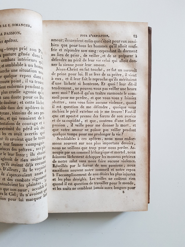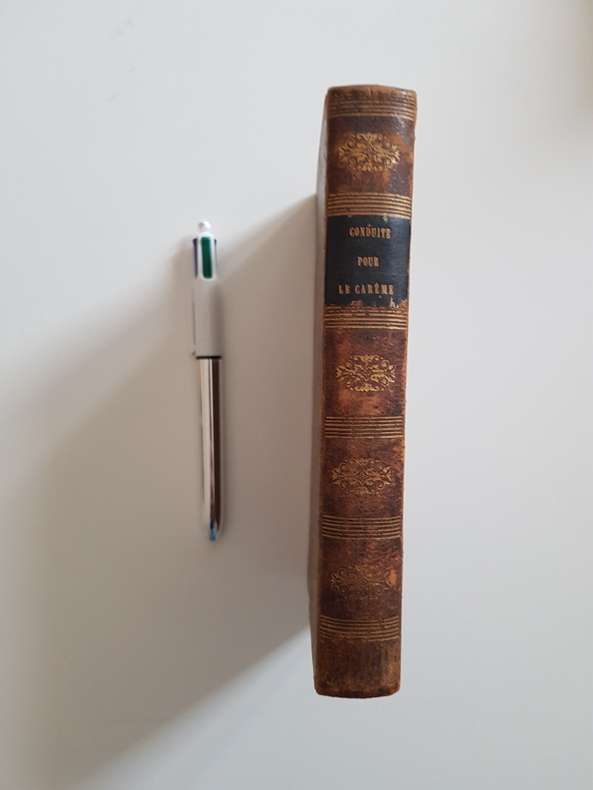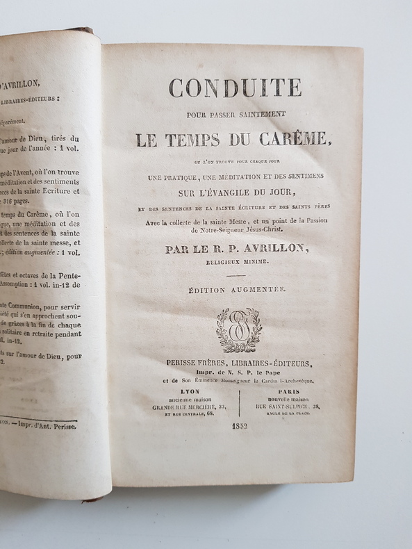 Titre : Conduite pour passer saintement le temps du Carême Auteur : Avrillon, Père Édition : Édition augmentée Lieu d'édition : Lyon et Paris Éditeur : Perisse Frères, libraires-éditeurs Date : 1852 Langue : Français Format : In-12 - env. 18 x 11 cm Reliure : Plein veau marbré d'époque - encadrement de roulette dorée sur les plats - dos lisse orné de caissons et fleurons dorés, pièce de titre noire - tranches mouchetées Etat du livre : Bon état - plats frottés avec petite éraflure au plat inférieur, coins émoussés, coiffes un peu usées - dos solide - intérieur propre avec rousseurs éparses et brunissures discrètes en marge - bel exemplaire de lecture Titre complet tel que l'ouvrage l'annonce : « Conduite pour passer saintement le temps du Carême, où l'on trouve pour chaque jour une pratique, une méditation et des sentimens sur l'Évangile du jour, et des sentences de la sainte Écriture et des Saints Pères. Avec la collecte de la sainte Messe, et un point de la Passion de Notre-Seigneur Jésus-Christ. Par le R. P. Avrillon, Religieux Minime. » Remarques : impression Perisse Frères, imprimeurs de N. S. P. le pape et du Cardinal-archevêque - typographie soignée
