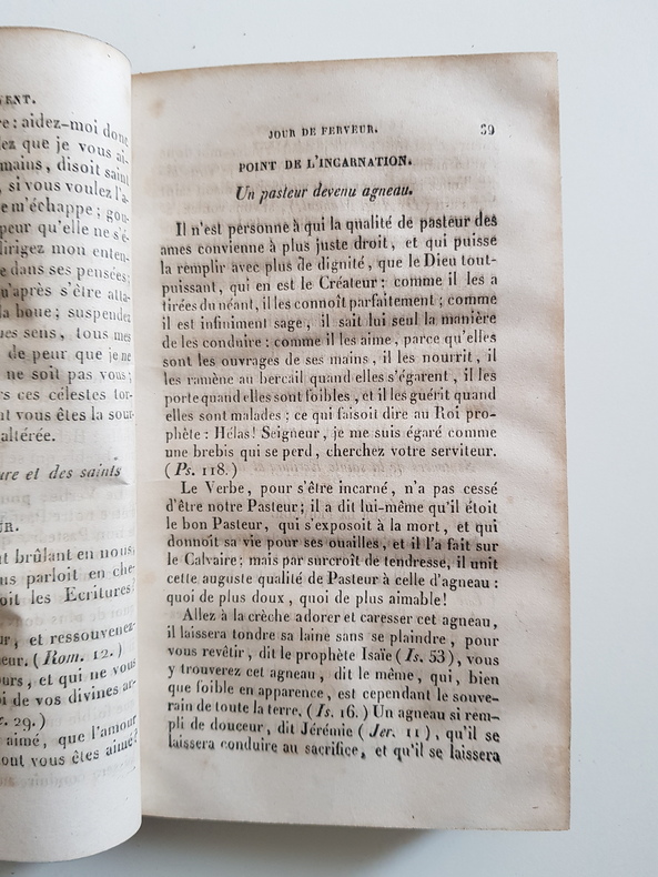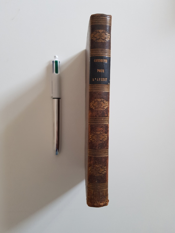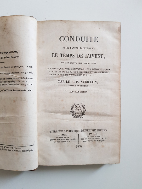 Titre : Conduite pour passer saintement le temps de l'Avent Auteur : Avrillon, Jean‑Baptiste Élie Lieu d'édition : Lyon et Paris Éditeur : Librairie Catholique de Perisse Frères, Grande Rue Mercière, 85 (Lyon) et rue du Petit‑Bourbon, 18, près de la place Saint‑Sulpice (Paris) Date : 1830 Édition : Nouvelle édition Format : in-12 Dimensions : env. 17 x 10,5 cm Langue : français Reliure : plein veau moucheté d'époque, encadrement de dentelle dorée sur les plats, dos lisse orné de filets et fleurons dorés, pièce de titre noire « Conduite pour l'Avent », tranches anciennes État du livre : bon état d'usage, frottements aux plats et aux coupes, coins légèrement émoussés, usures discrètes aux coiffes, mors frottés sans jeu, intérieur propre avec rousseurs et brunissures éparses, papier solide et bien lisible Illustrations : vignette typographique au titre Contenu : guide de piété pour chaque jour de l'Avent comprenant une pratique, une méditation, des sentiments, des sentences de la Sainte Écriture et des Pères, ainsi qu'un point de l'Incarnation